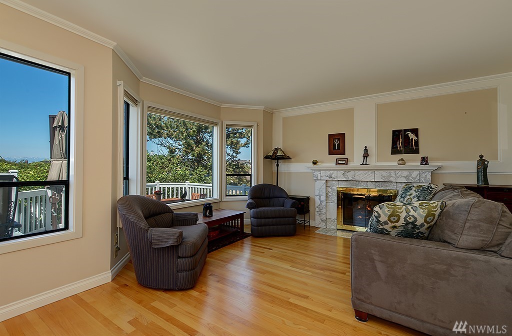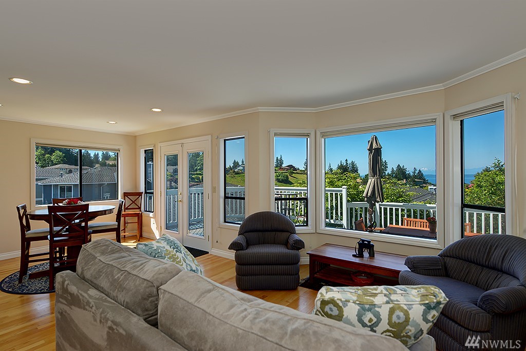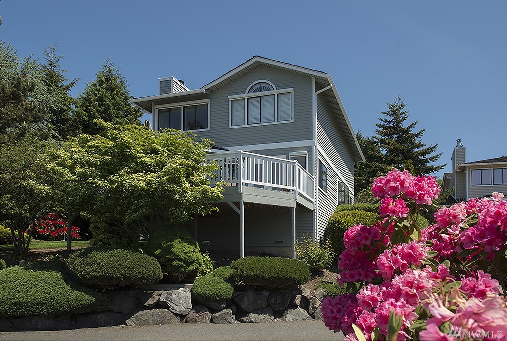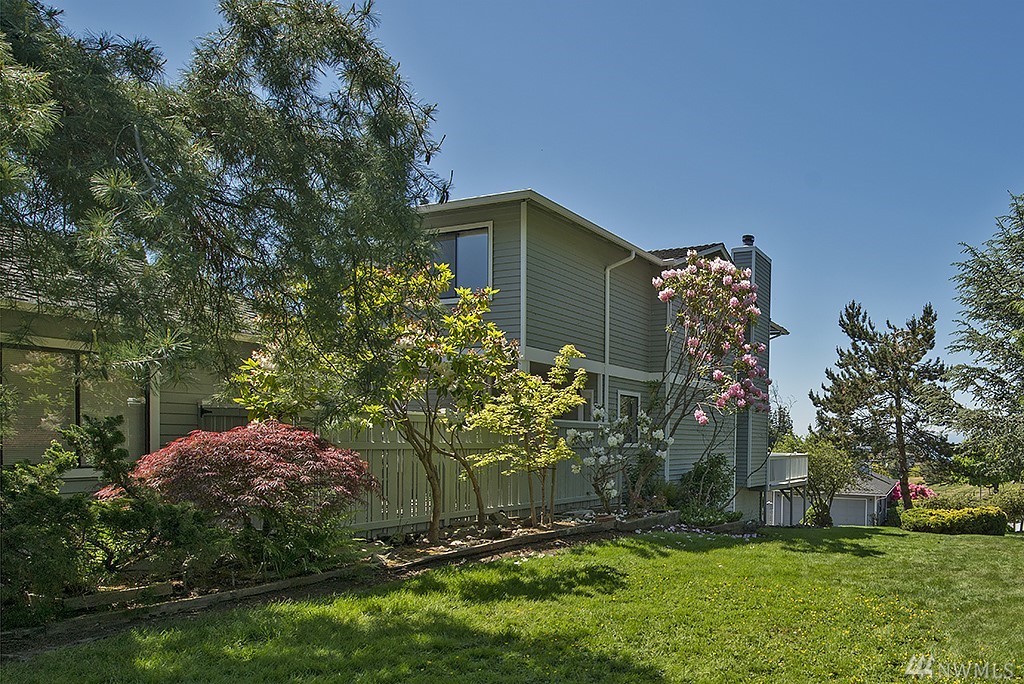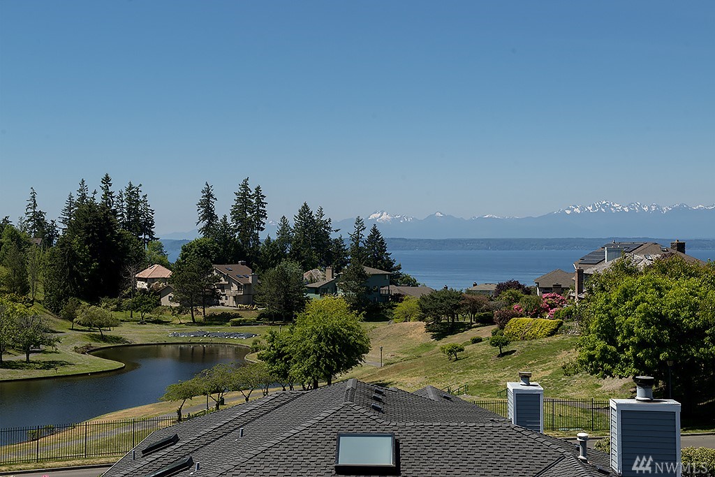 Nestled among million dollar homes, this lovely 2-story condo home offers big views of Puget Sound & Olympic Mtns. It's a stand-alone home w/ a private fenced backyard w/patio, large front view deck, 2-car garage & enjoys a wide side yard. New exterior paint & fence; newer 50-yr roof, gas furnace & H2O tank; new SS gas range & fridge. Main level has circular floor plan w/hardwoods, great views & cozy family room off kitchen. Master suite w/new 5-piece bath, dbl closets, Sound views & bonus nook.