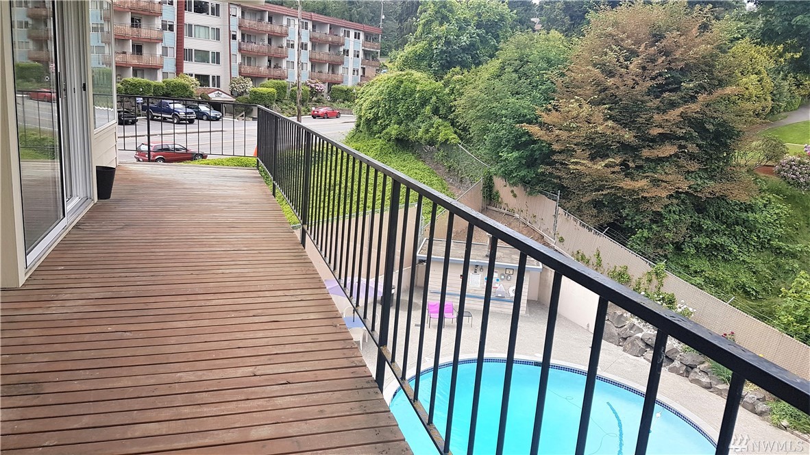 Welcome to Emerald Green’s top floor corner w/ the best unobstructed views in the building! Relax to the serene lush green from your extra long deck, or take a dip in the renovated pool below. Boasting spacious bdrms, freshly updated baths & kitchen w/ all new appliances, tons of storage, full W/D, wood fireplace, triple pane windows. Secure bldg w/ elevator, parking, solid active HOA, no special assmts. Close to bus, stores, major highways & all amenities of charming downtown Burien. Must See!