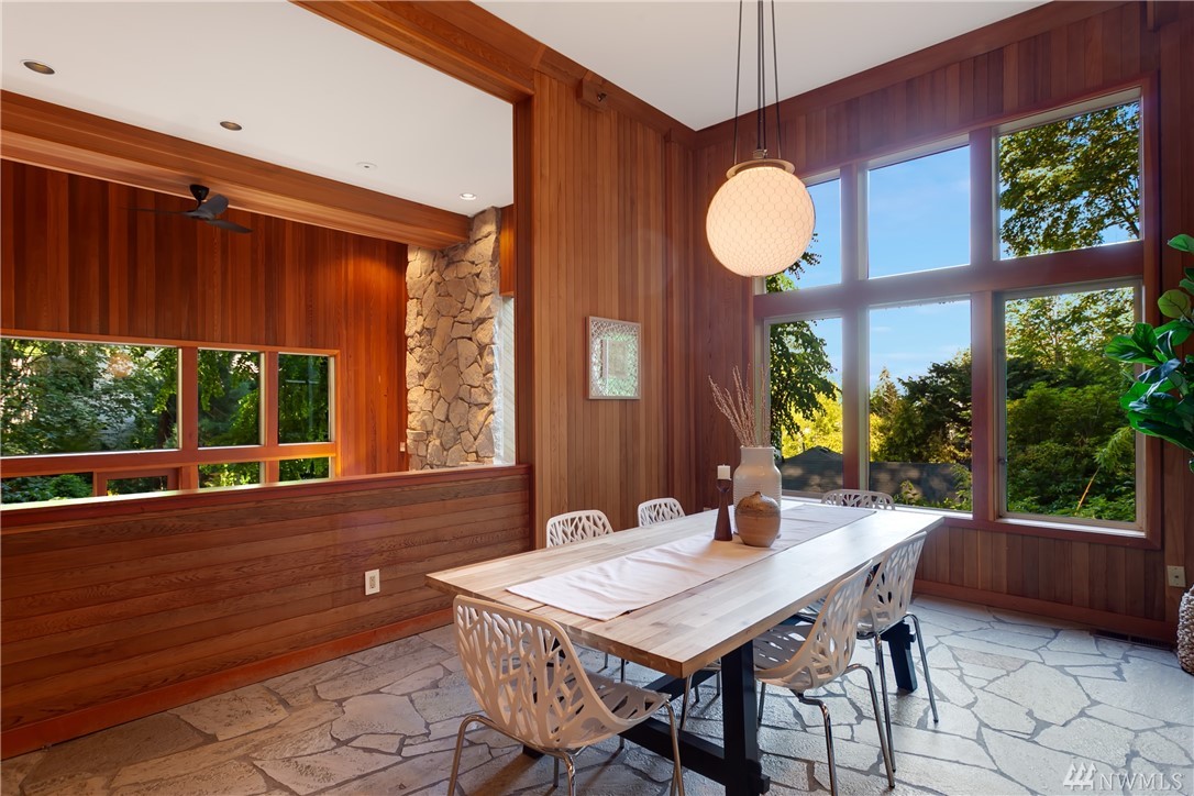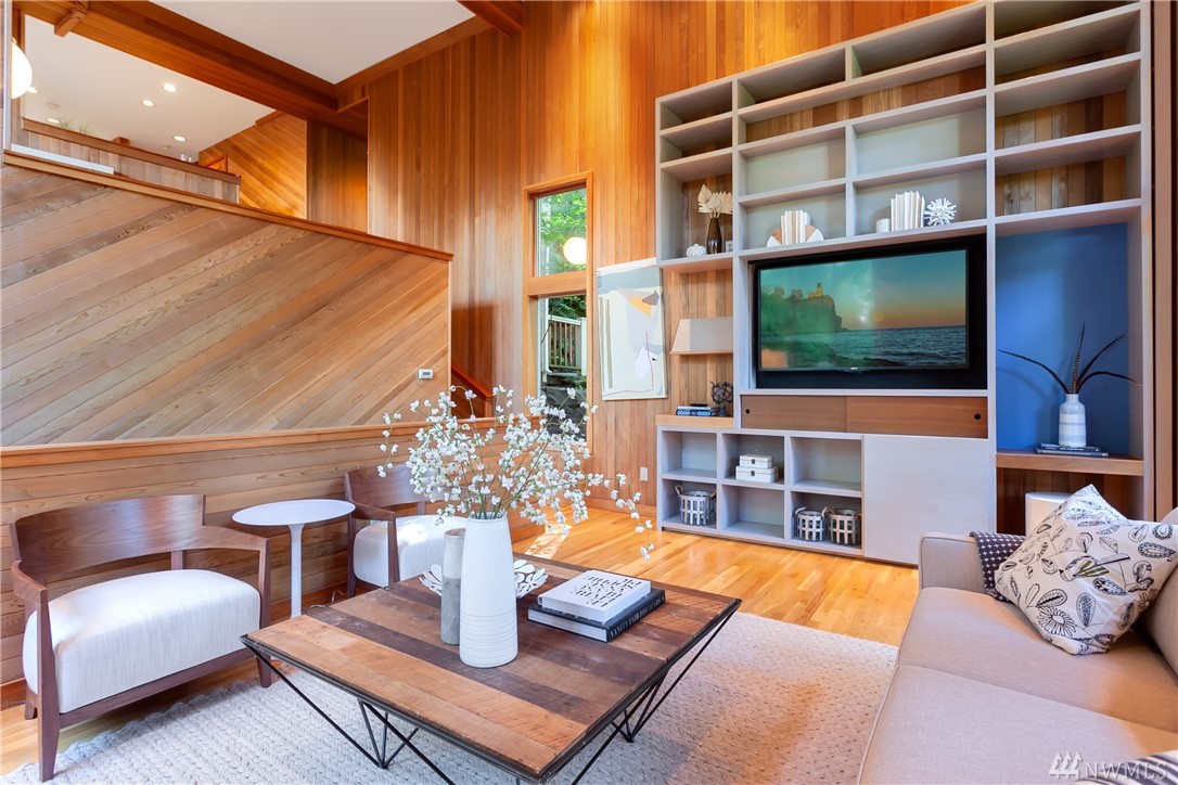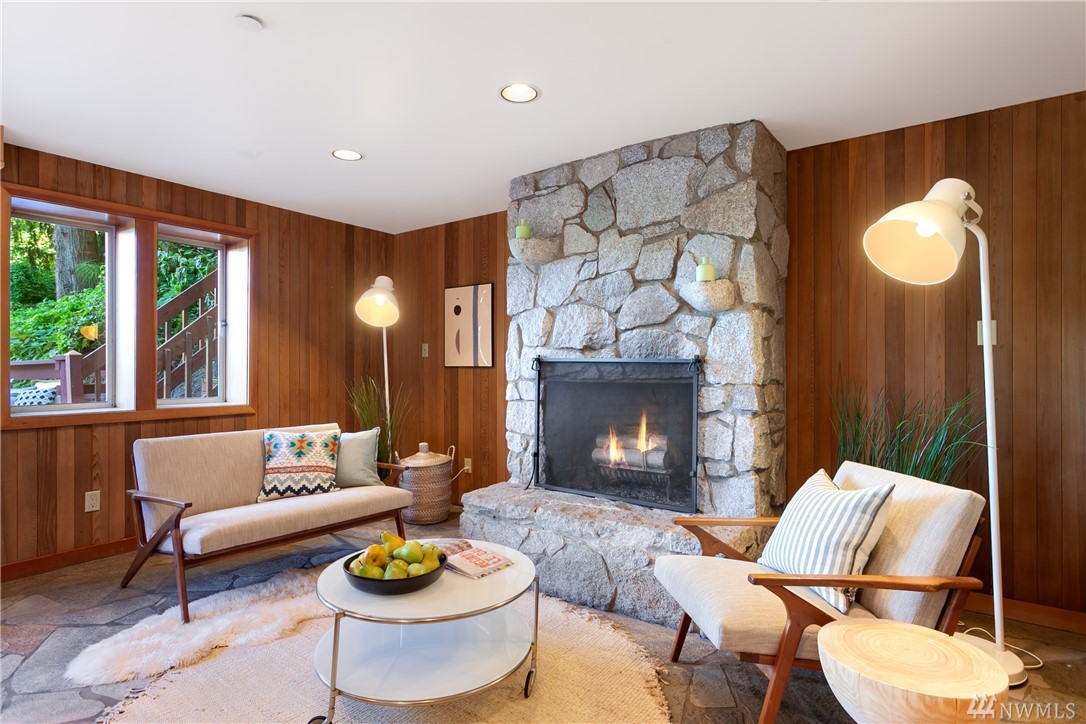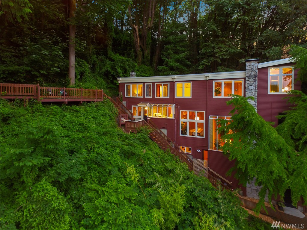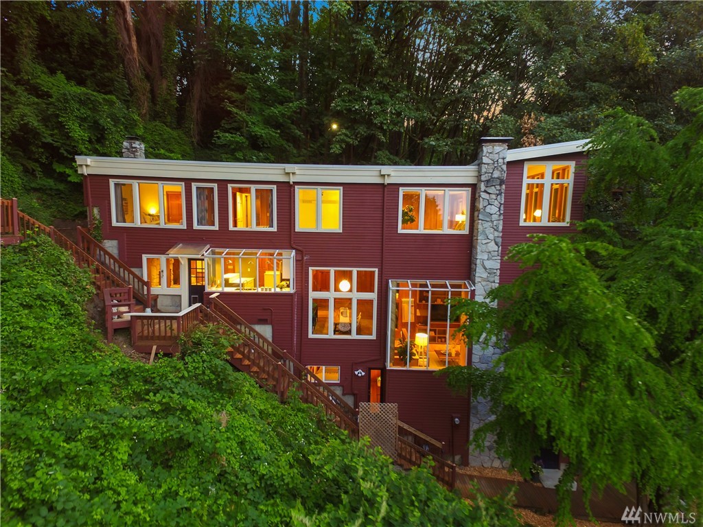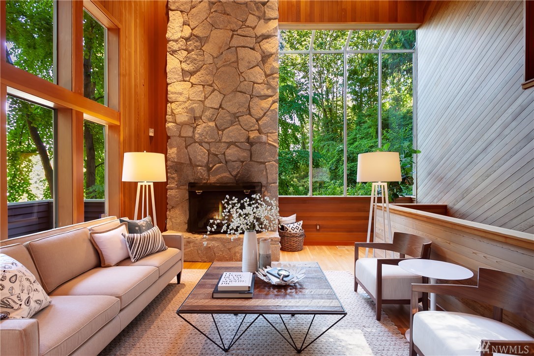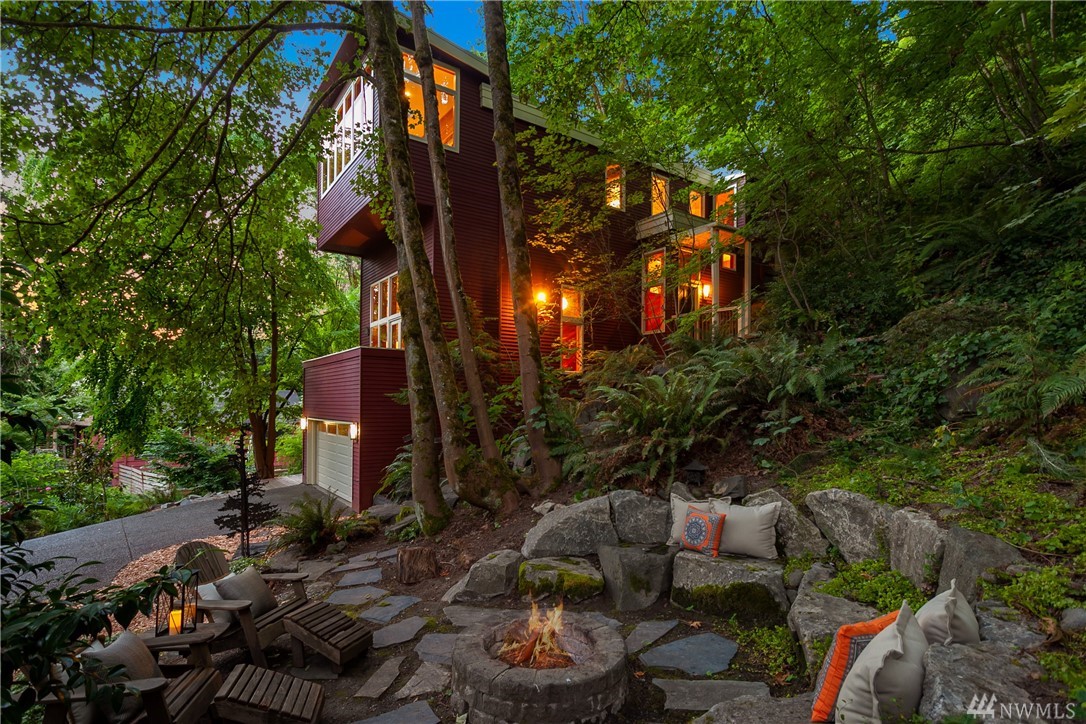 This modern NW boho retreat, nestled in the woods at the top of a private ravine, will inspire & restore your restless city soul. Walls of windows + a legion of skylights flood rooms w/filtered light. Lake views + outdoor spaces to relax & reflect dot the landscaping, including a magical fire pit. Soaring beamed ceilings anchored by stone fireplaces & tastefully rustic cedar-wrapped walls all complement the easy-living floor plan. Just a stone's throw from lake, parks & Leschi cafes & shops!
