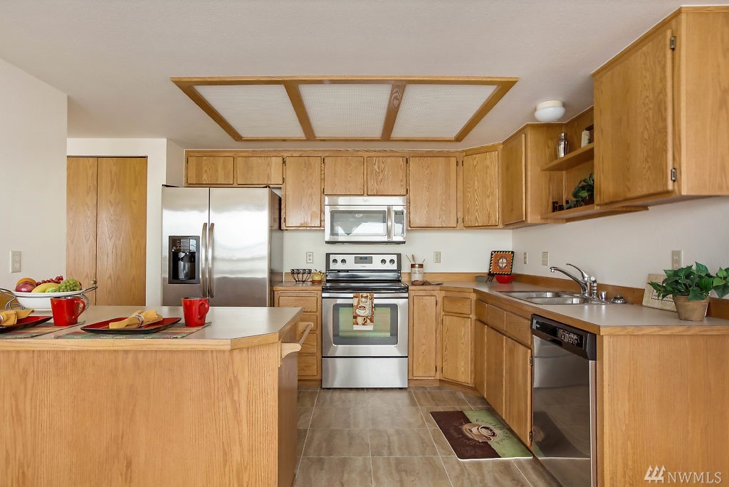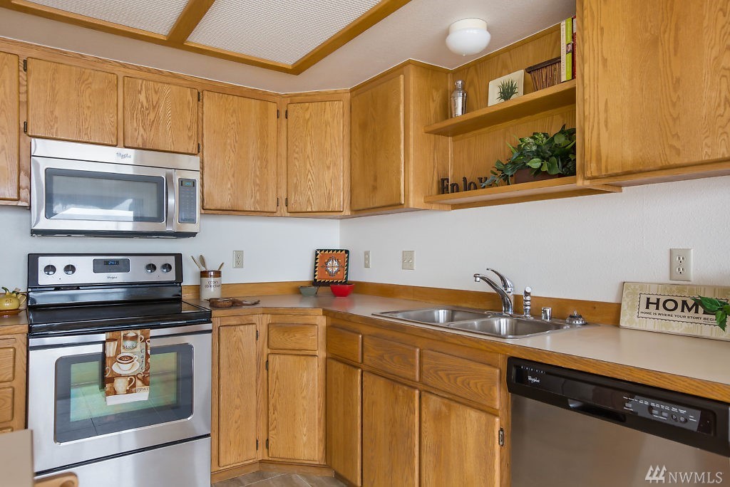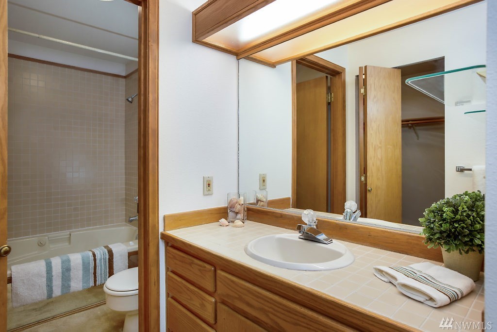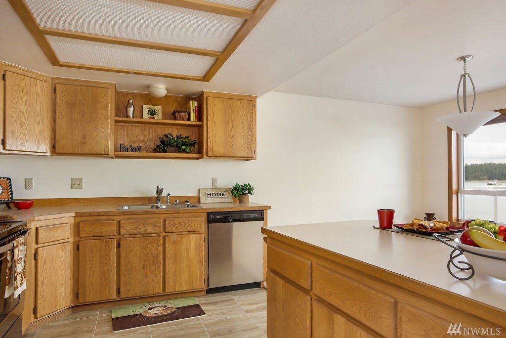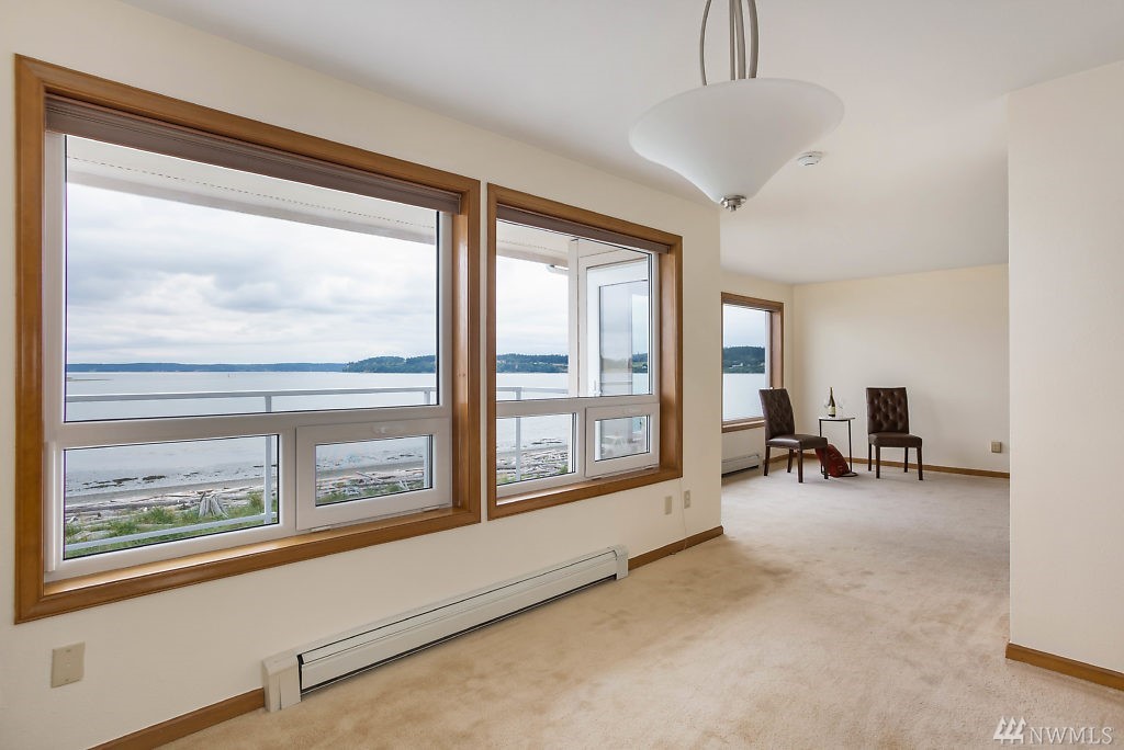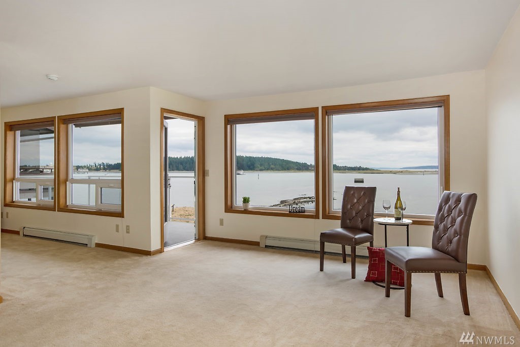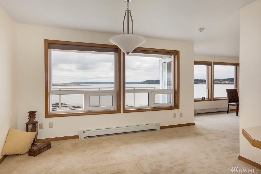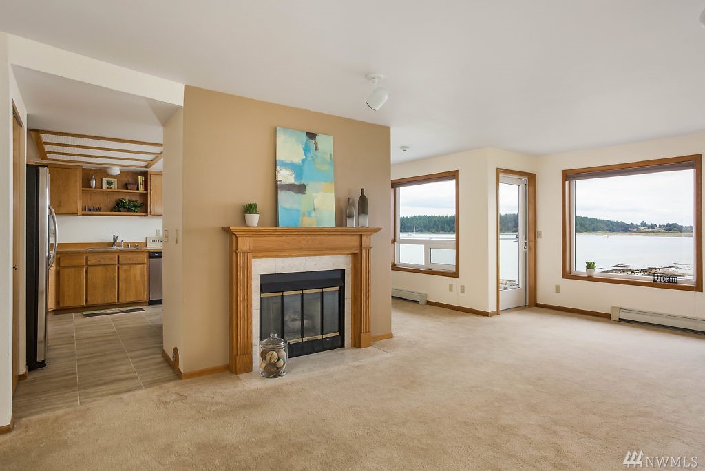No-Bank Waterfront Condo in Downtown Area! Spacious top floor 2 bd/1.75 ba/1470 sqft condo w/elevator access & panoramic views of Oak Harbor Bay, marina, boating, Mt. Rainier & Cascade Range. Formal living rm w/ gas fireplace, separate dining rm & parquet entryway. Cook’s kitchen w/new flooring, pantry & stainless appliances. Master suite w/walk-in closet, full bath & jacuzzi tub. Utility rm w/sink, radiant baseboard heating, and 2-car garage. New roof, siding, windows & deck South side of unit.