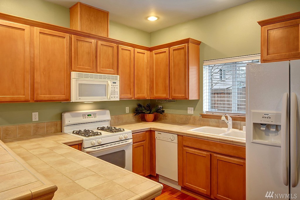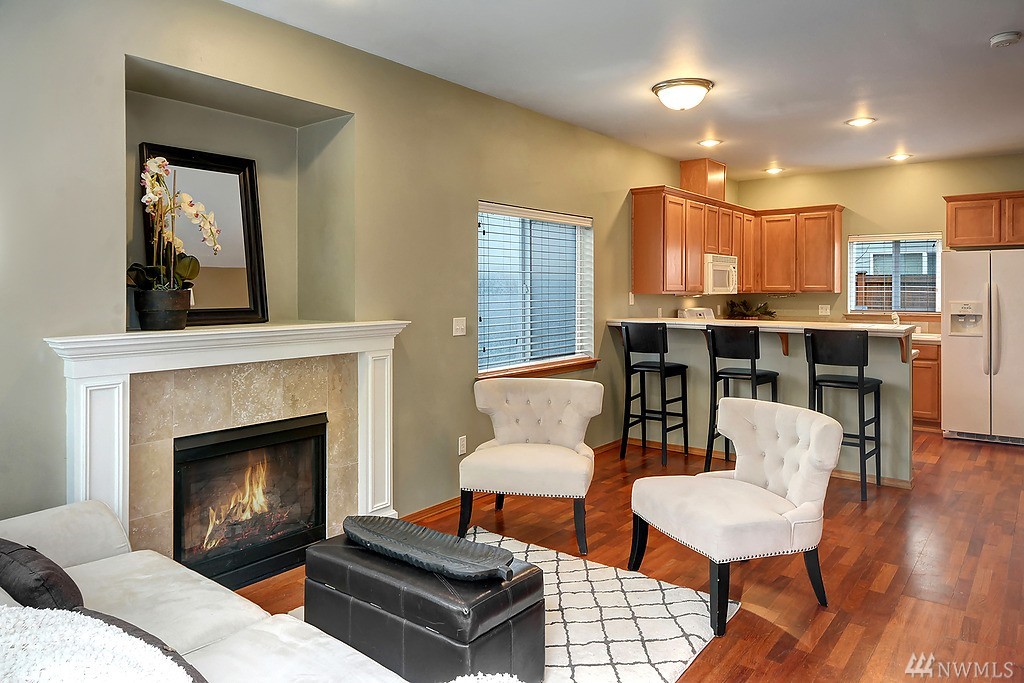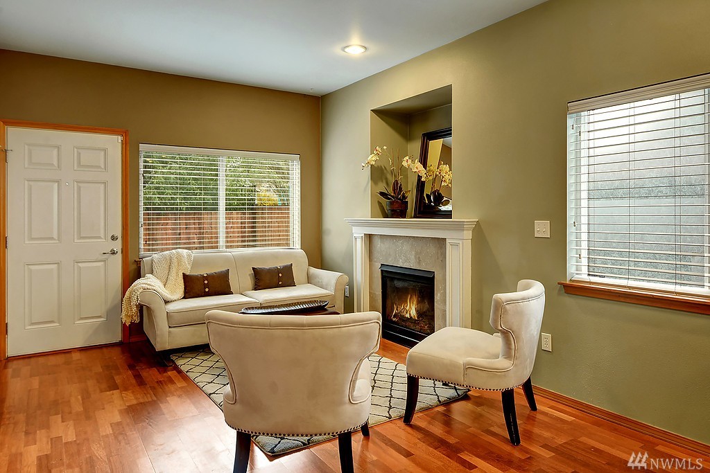 Sparkling town home with quality finishes throughout. Beautiful designer paint and cherry hardwood floors. Tall ceilings, big windows and an elegant gas fireplace are favorite details. Spacious kitchen with tile counters, a gas stove and welcoming breakfast bar dining. The spacious Master bedroom and cozy 2nd bedroom each offer generous closet space. Laundry upstairs for convenience. Private back yard with new landscaping is fully fenced-just in time for summer BBQ's and outside enjoyment.