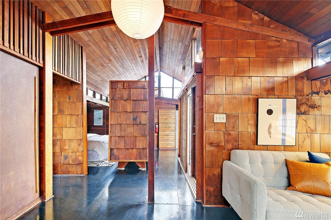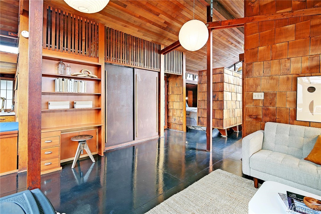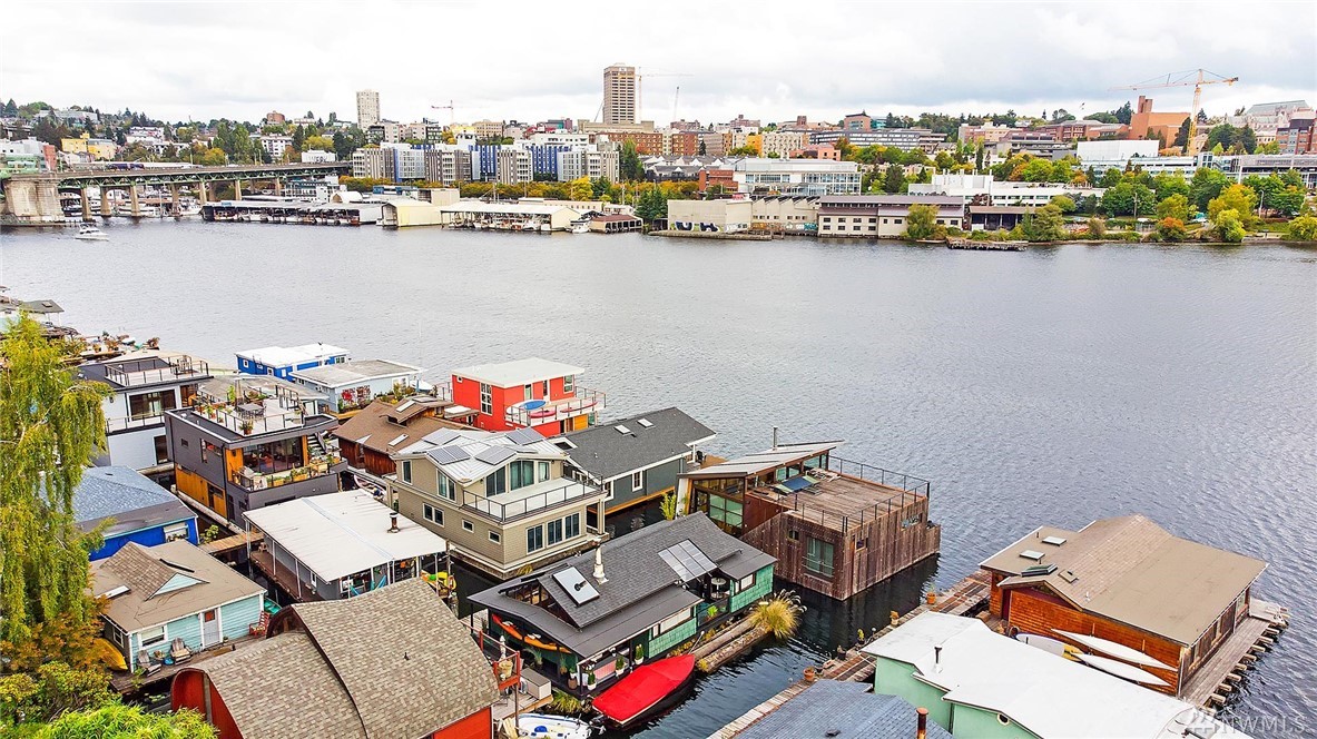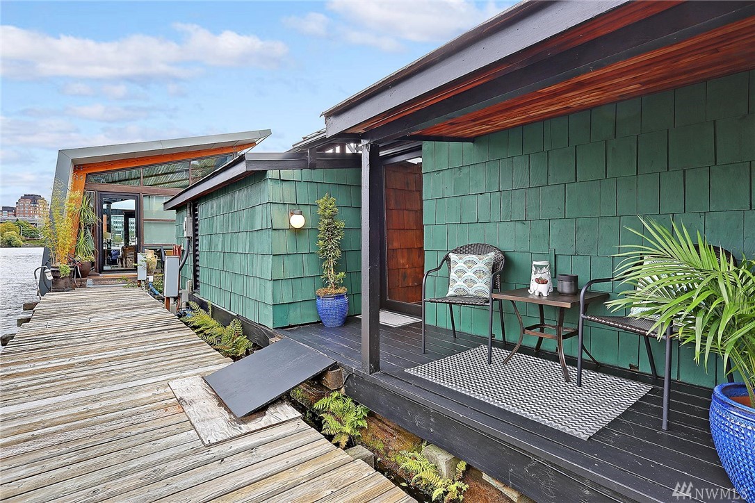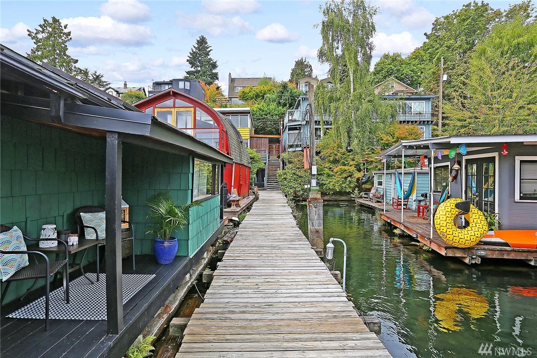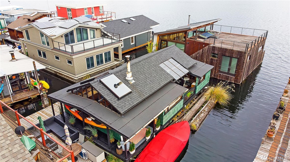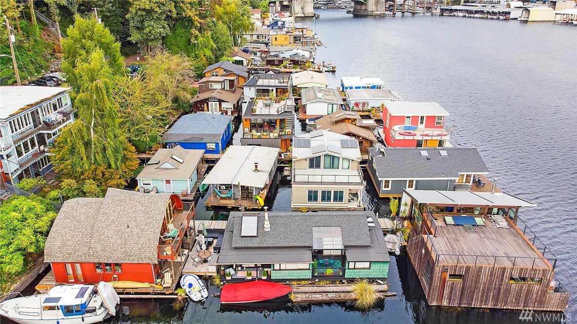 Designed by architect Gerald Van Slyck in the late 1950’s/early 1960’s, this distinctive floating home has a midcentury spirit, a woodsy, Northwest contemporary feel, and a character that is instantly captivating. An open layout, vaulted ceilings, clerestory windows, and large skylights maximize the home’s 833 square feet. Outdoor areas take advantage of Portage Bay vistas. Intimate, co-op dock of only 4 homes is tight-knit and friendly. Boat moorage and assigned parking complete the package.