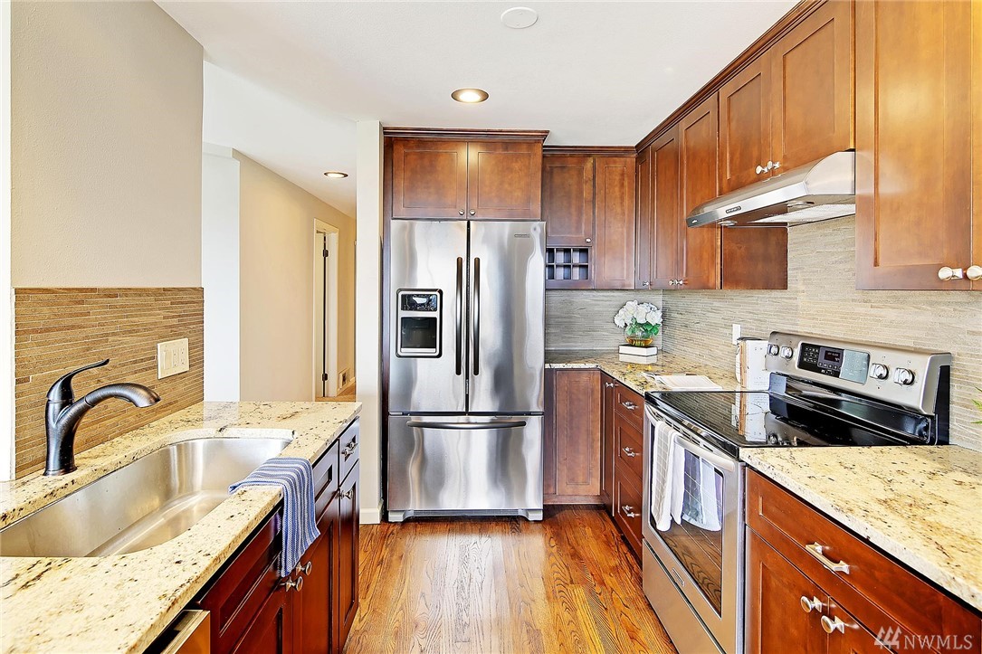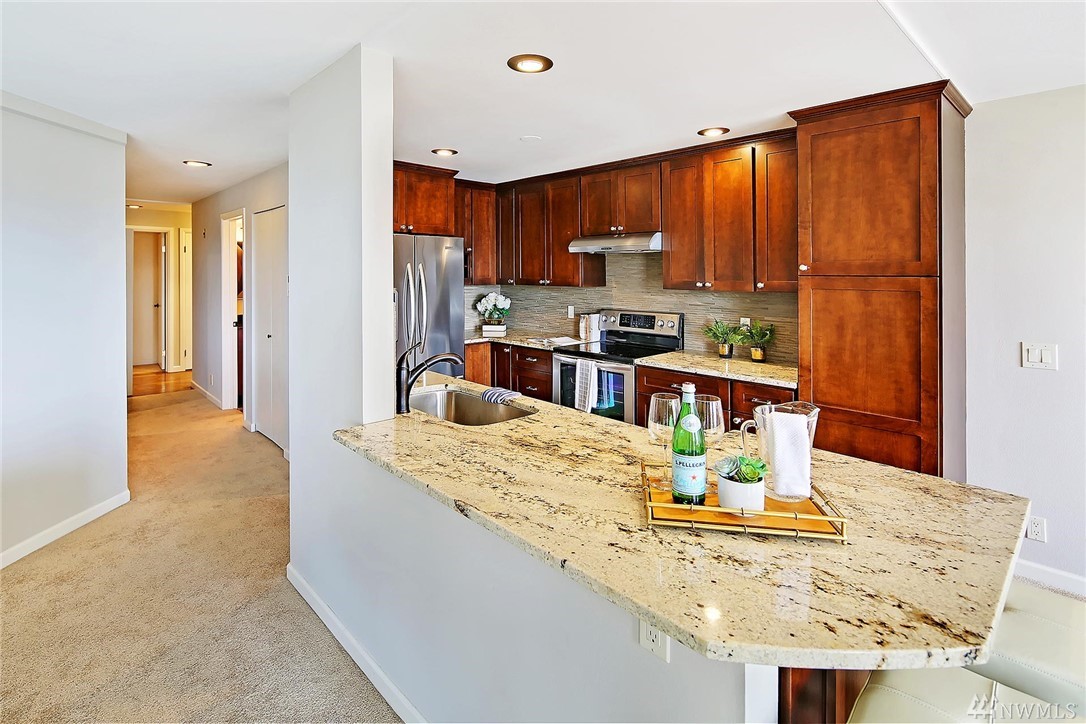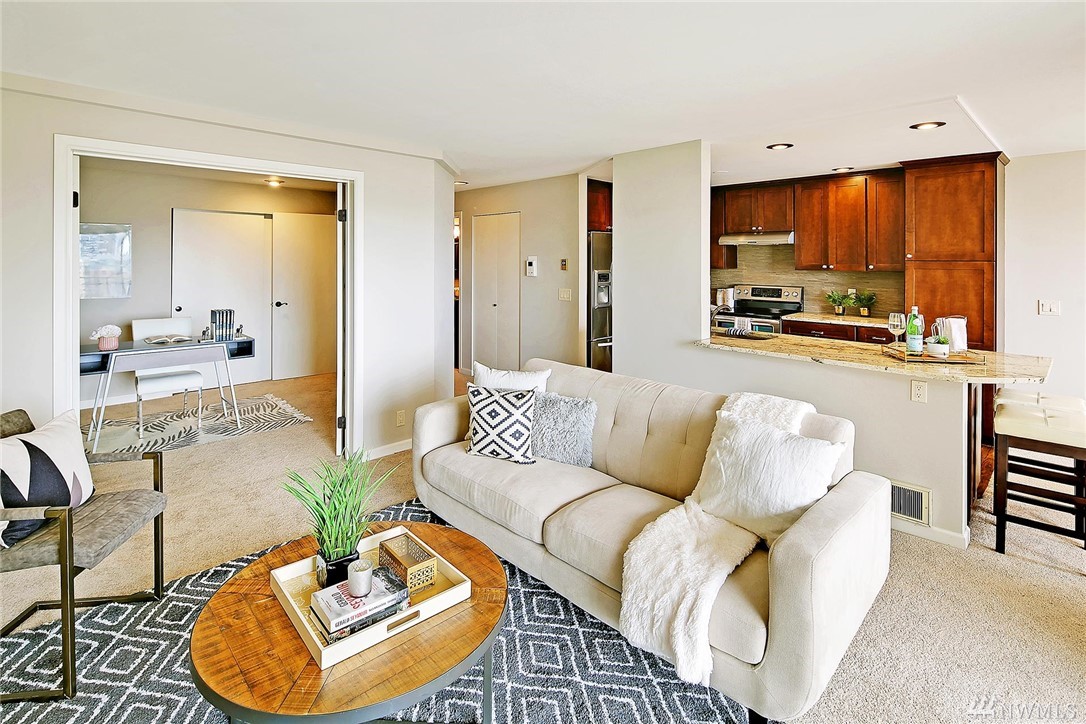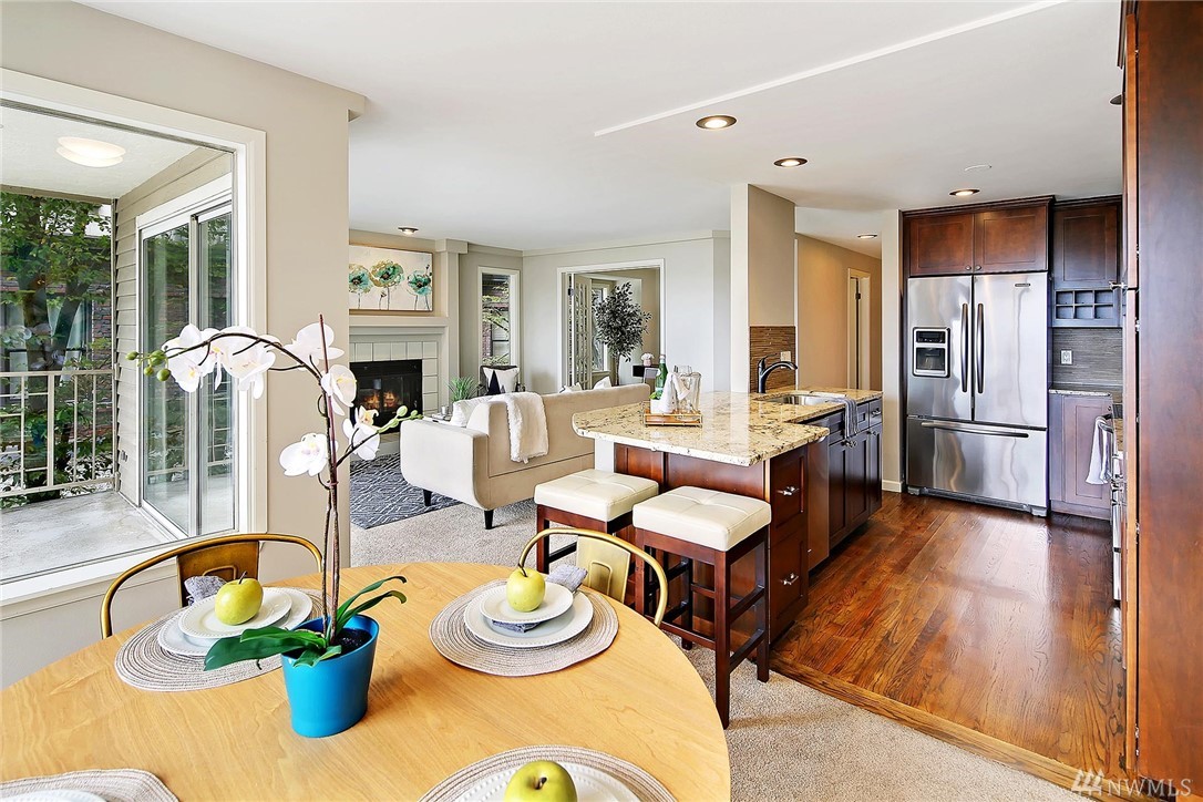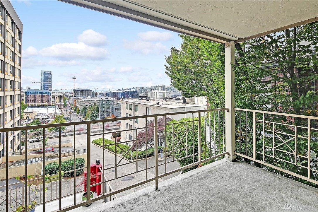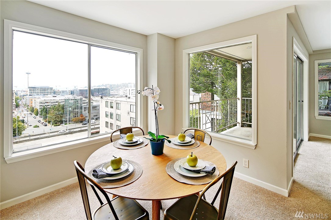 Located on coveted Capitol Hill with spectacular views of the Olympics and Space Needle with a peek of the Puget Sound. Light filled end unit boasting natural light throughout this 2 bed, 1.75 bath condo. Spacious chef's kitchen with bar seating, granite counter tops, SS appliances, hardwoods, wood fireplace, secured parking garage. Large private west-facing balcony accessible from living room and unobstructed views of Space Needle. Downtown life style-walking distance to everything.