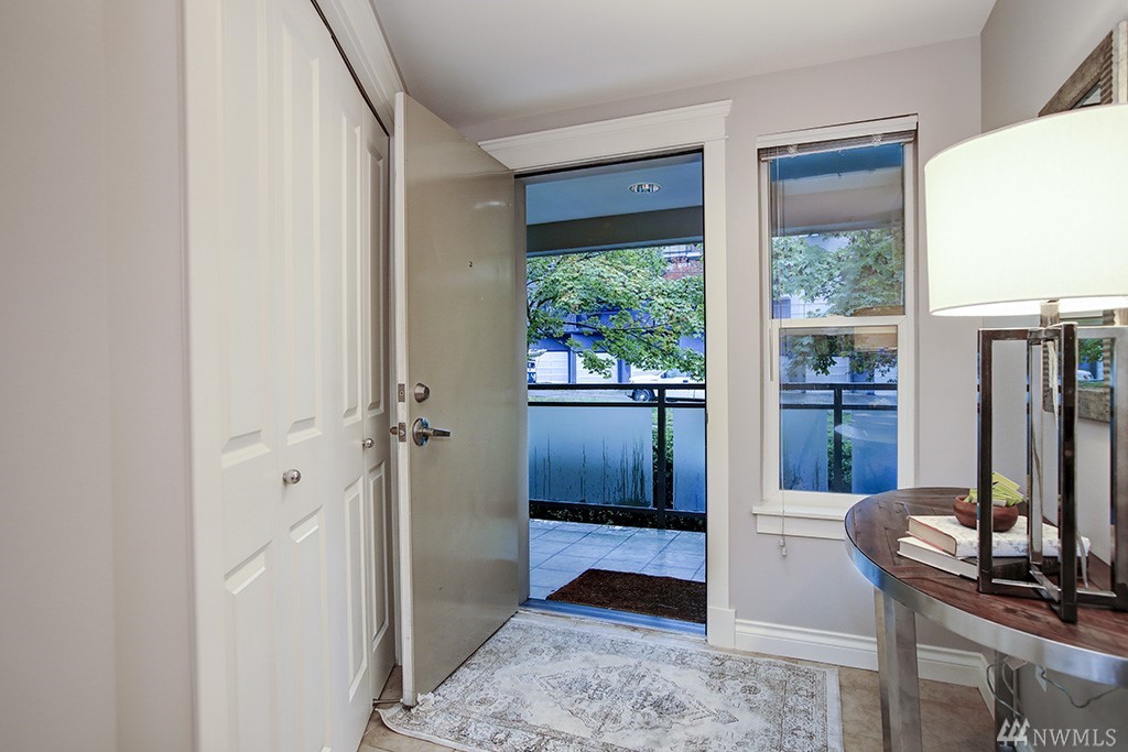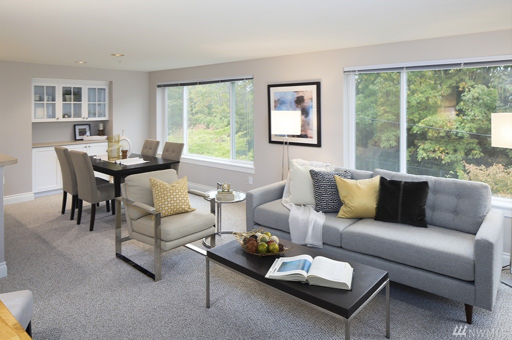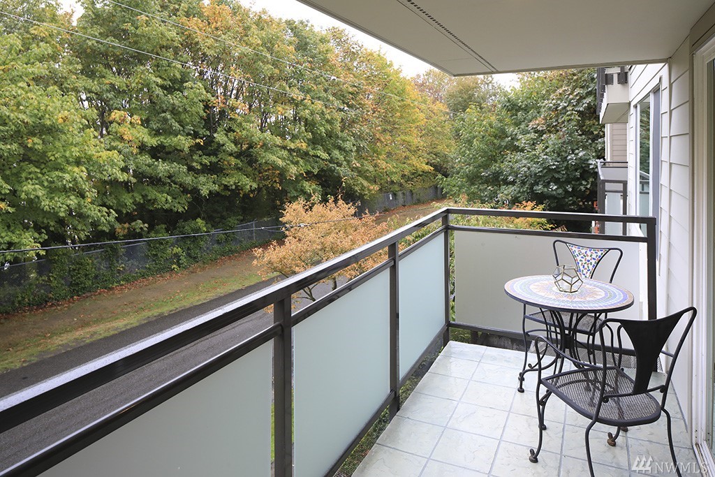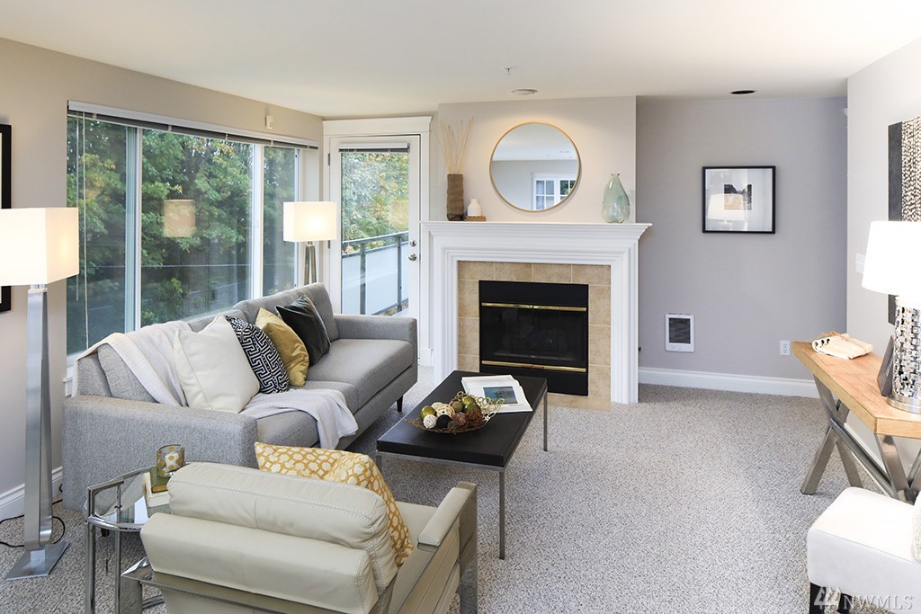 Spacious 2 bedroom, 2 bath condo in small, boutique building! Open spaces, a view of trees in summer, space needle view in winter, a sunny balcony & a luxury master suite make this home special. Nice design with gas fireplace & lots of built-in storage in unit, plus extra large storage room in garage. Updated & move-in ready with fresh paint, high quality new carpet & pad, & new kitchen appliances. Secure parking, elevator. Great location near local shops & on bike path with good bus options.