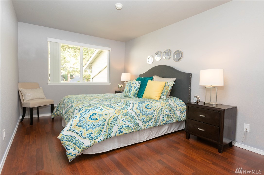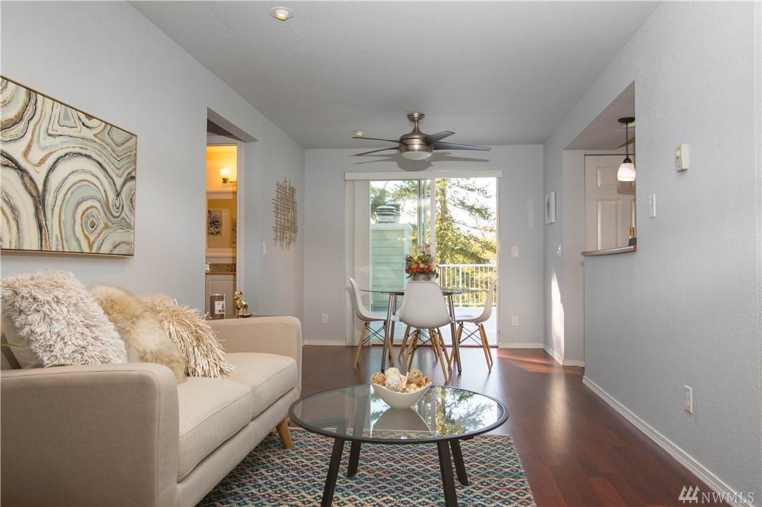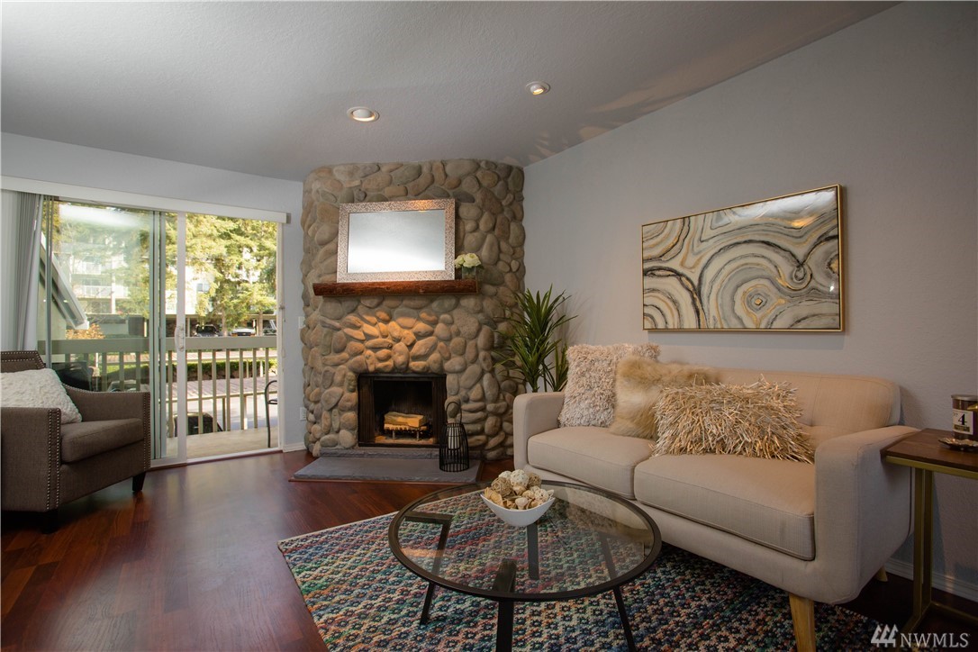 Top floor unit in the well run Redwood Condo complex in Redmond. Cozy 1 bed 1 bath with fireplace in living room. Kitchen features granite counter tops and stainless fridge. Brand new flooring throughout and ample storage. Light and bright space with 2 sliding doors that lead out to two decks one oversized and one with storage space. Full-size washer and dryer in unit. The bedroom has walk-in closet. Located within 2 miles of Microsoft, close to parks, trails, and park & ride.