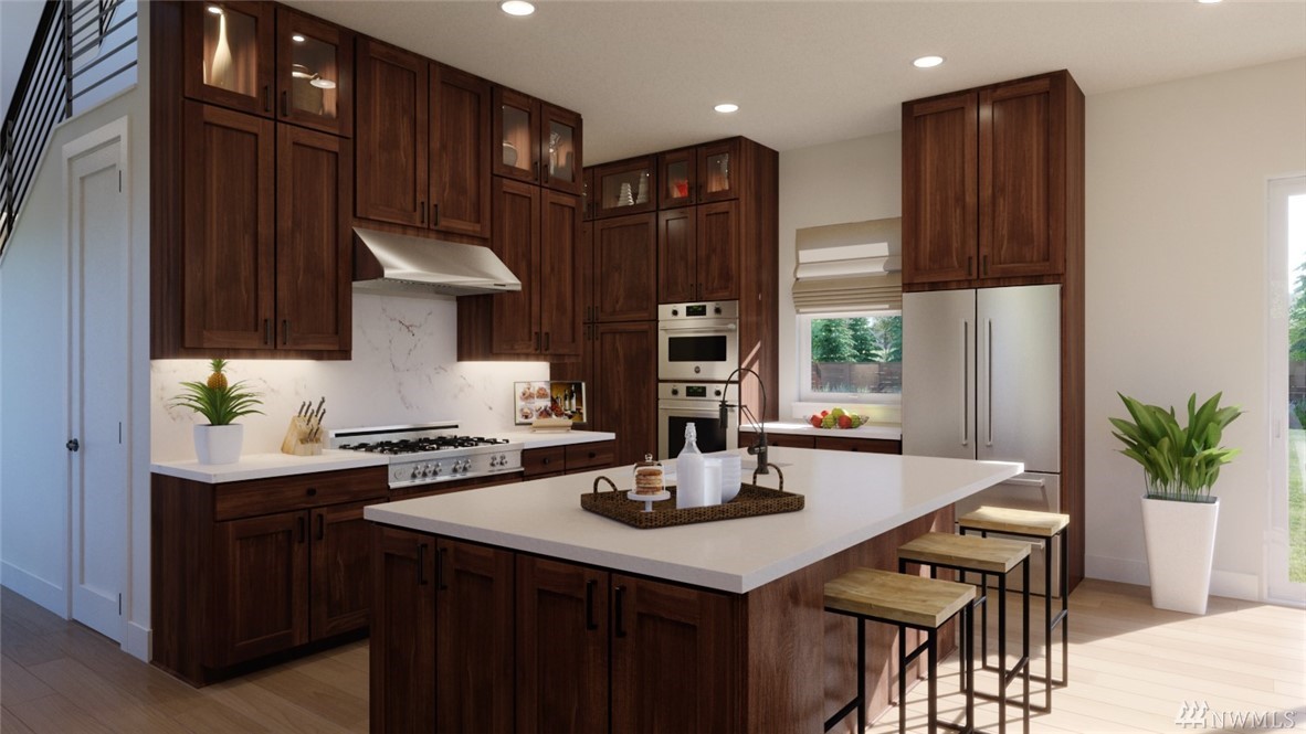 Ray Meadows | Redmond's modern urban lifestyle community! This bright home has it all. Open concept floorplan. Main floor boasts hardwood, chefs kitchen with Italian Bertazzoni appliances, pot filler + warm cabinetry. Main floor bedroom/study + 3/4 bath. Swank master suite, complete with freestanding tub and large ClosetMaid walk-in closet. Entertaining abounds on the third floor bonus room with built-in wet bar + beverage fridge next to rooftop deck. Tech package + electric car pre-wire.