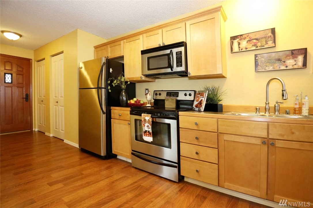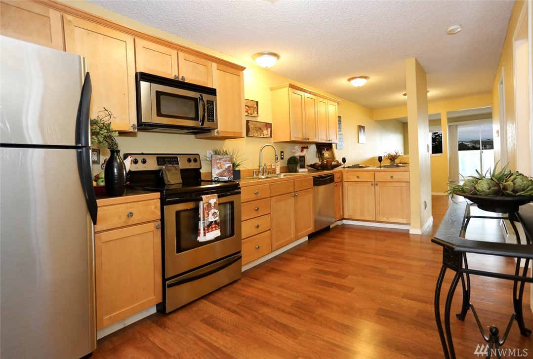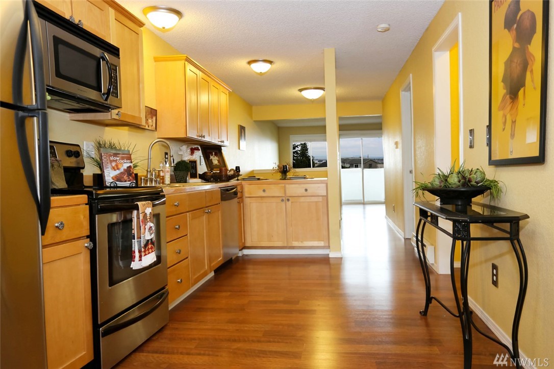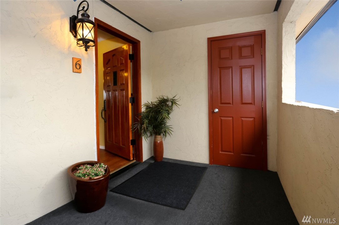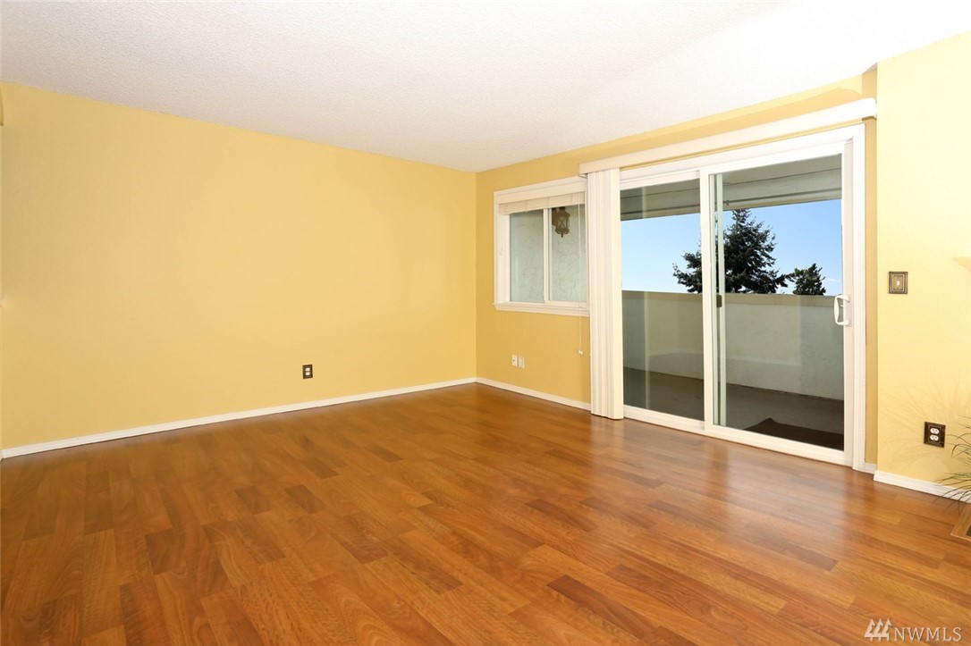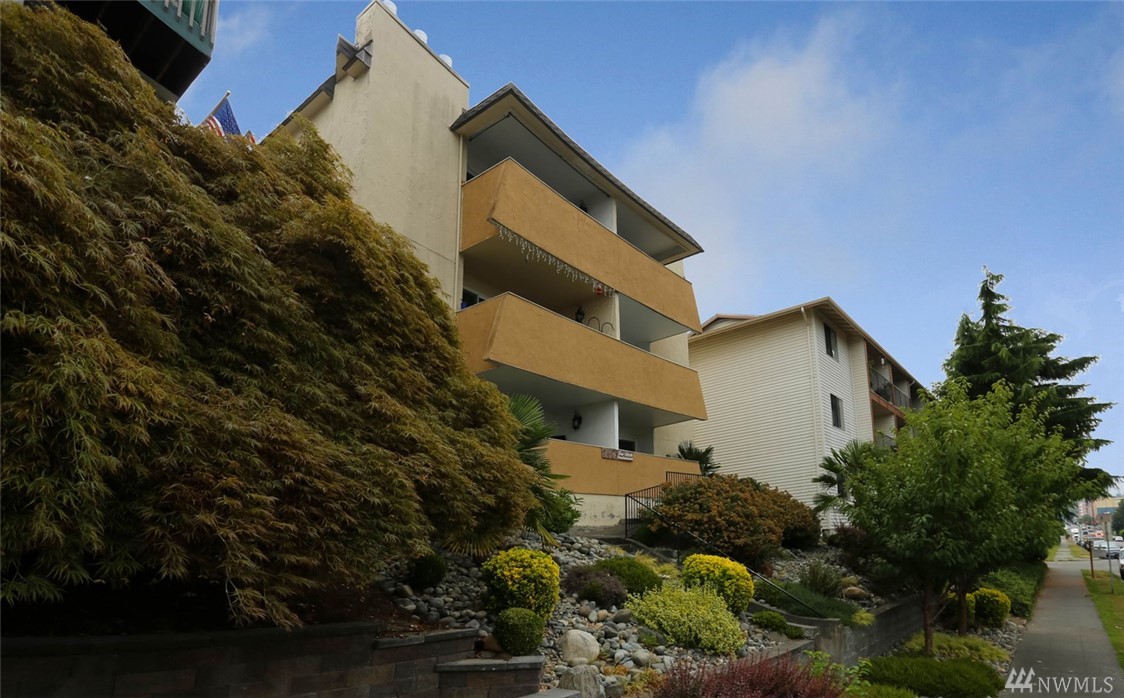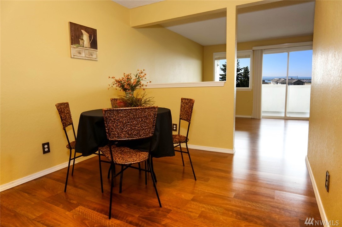 Wonderful opportunity for a Sound View Condo in a quiet North Everett location. Upper level corner unit boasts 180 degree views of Puget Sound, Hat Island, Olympic Mountains and wonderful sunsets. 900+ sf w/ 2 bedrooms, full bathroom, open kitchen w/ separate dining space + in unit laundry. Updated with laminate flooring throughout & stainless appliances. Small building with 6 units and low HOA dues of $185/mo. 2 reserved parking spaces, plus secured entry. You will love to live here!