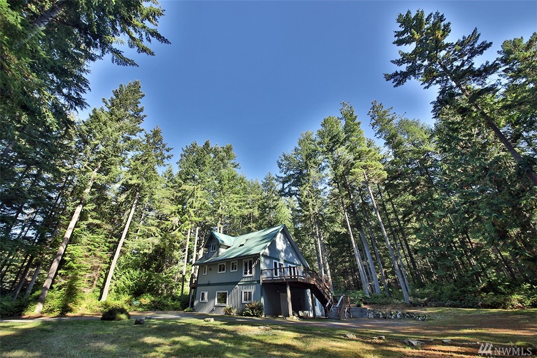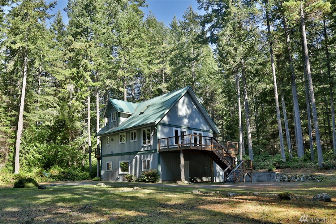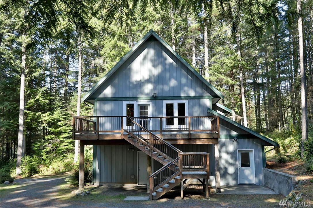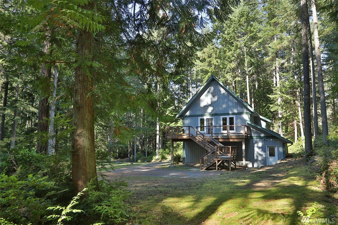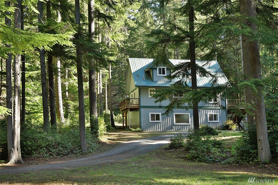 Charming home on 5 wooded acres in Clinton. Interior offers a cabin feel with fir floors & woodwork, hand made stair rail, vaulted ceilings and cozy appeal. 2BR, 1.75 BA are the upper two levels of this three story home with great room. The ground level is 864 square feet of partially finished space that could be used as a studio, storage or finished off as additional living area, septic capacity is 3BR. Exterior is low maintenance metal roof and siding. Deck & balcony for outdoor living.