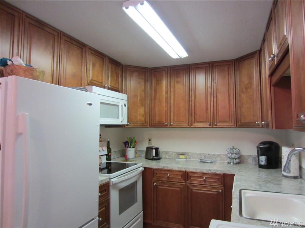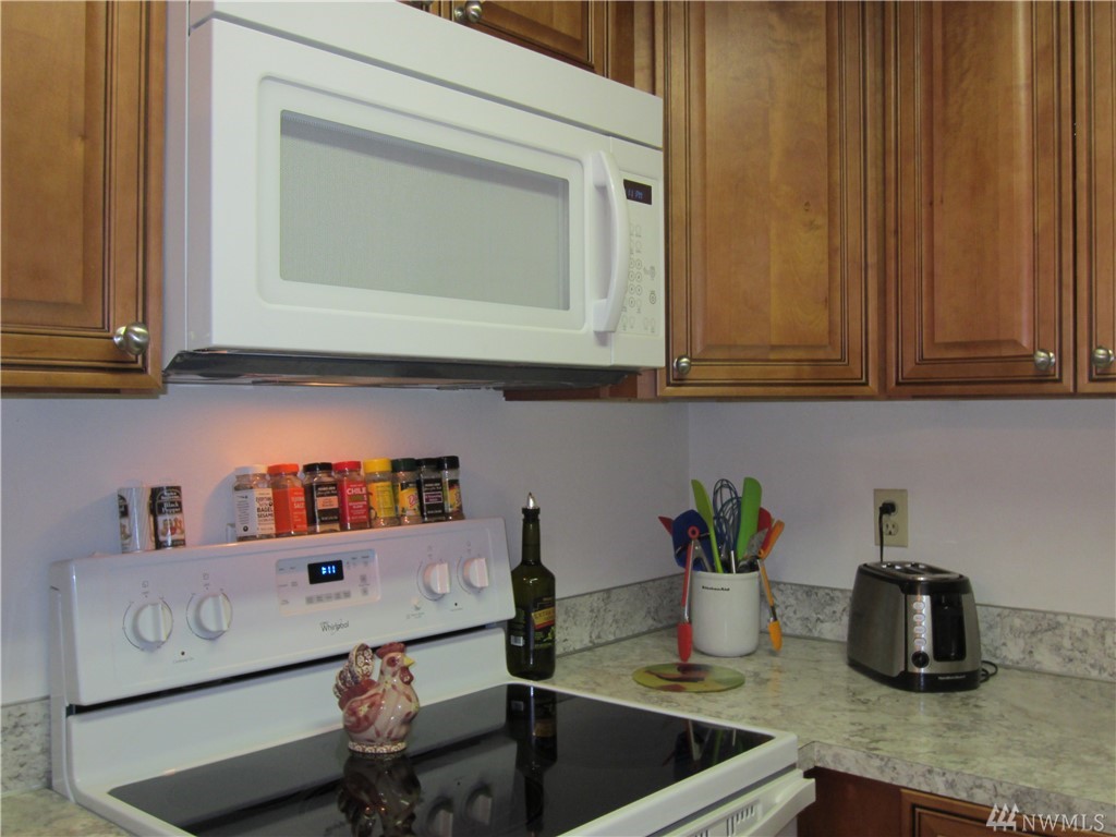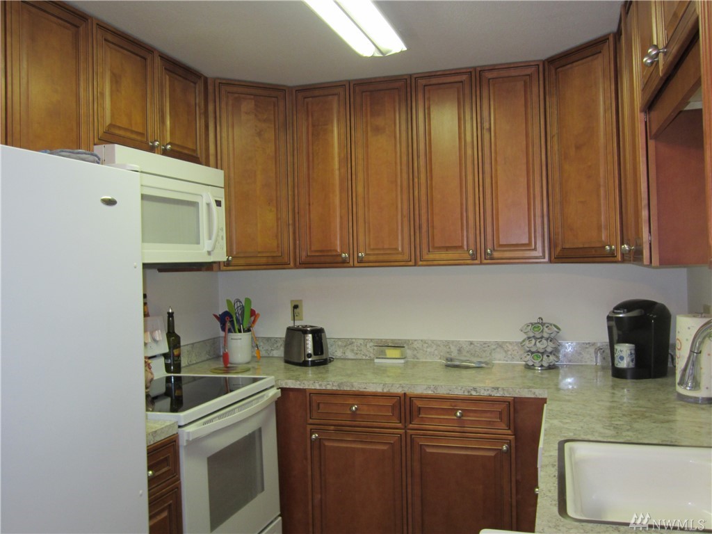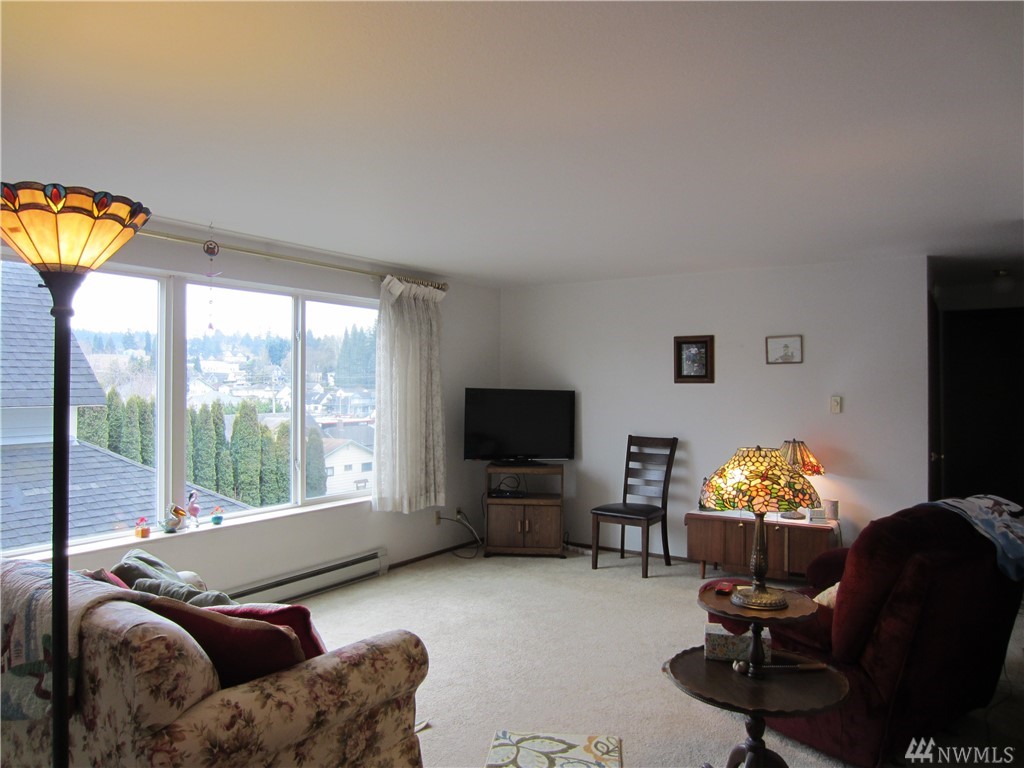 Delightful, sunny, one level condo in walk-able downtown Everett. Very secure, quiet building w/12 units & elevator. New vinyl windows, new kitchen cabinets & counter tops, new appliances, new flooring. Kitchen eating space & entry w/new laminate wood floors. Spacious living room w/territorial view. Bathtub is updated to step-in large shower w/seat. Master is generous w/large closets. Laundry hookup in unit. Assigned parking, large storage closet. HOA fees $170/month cover W,S,G. & Ins.