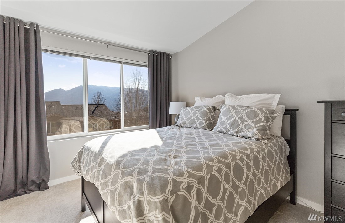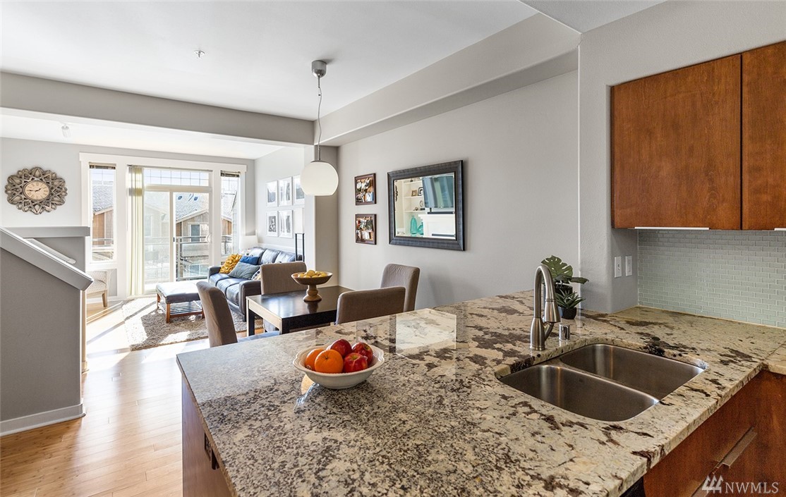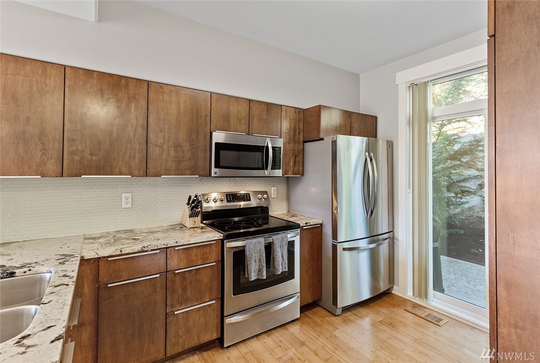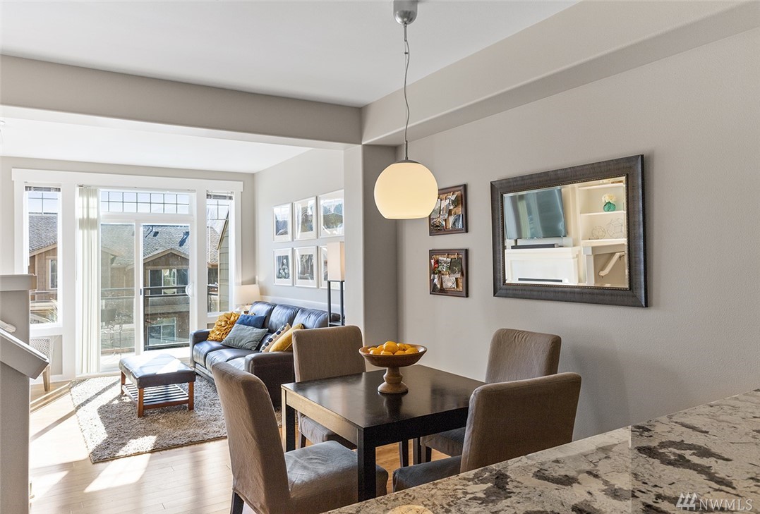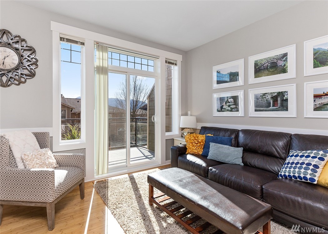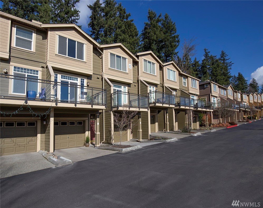 Mountain views and no homes in back of this modern townhome--the ultimate in peace and privacy. 1/2 bath on the main, bamboo flooring, fresh paint, updated brushed nickle hardware, new carpet, stainless steel appliances in custom designed, remodeled kitchen with huge island & storage pantry with roll outs. Attached two car garage w/ upper storage.Back patio can be fenced.Exterior NEW in 2012. Lots of guest parking. Easy access to park & ride/trail/I-90 and more. No rental cap.Huge HOA reserves.