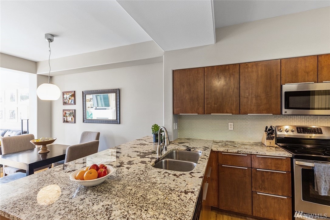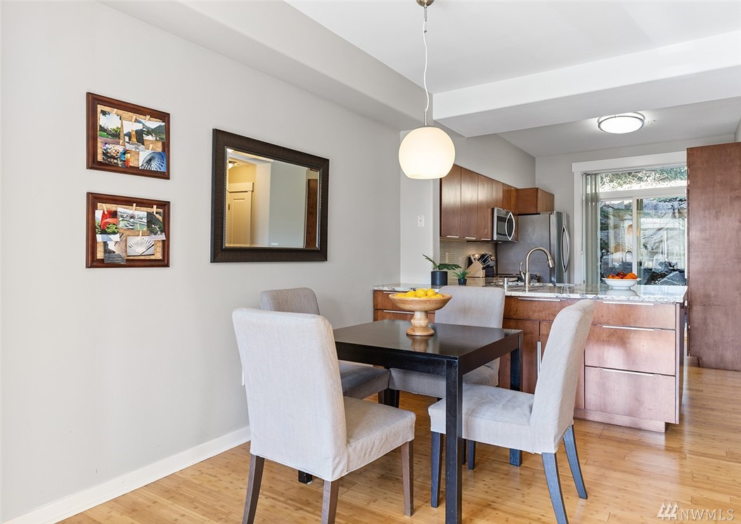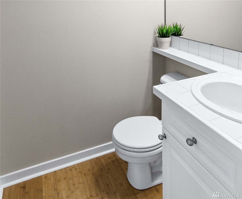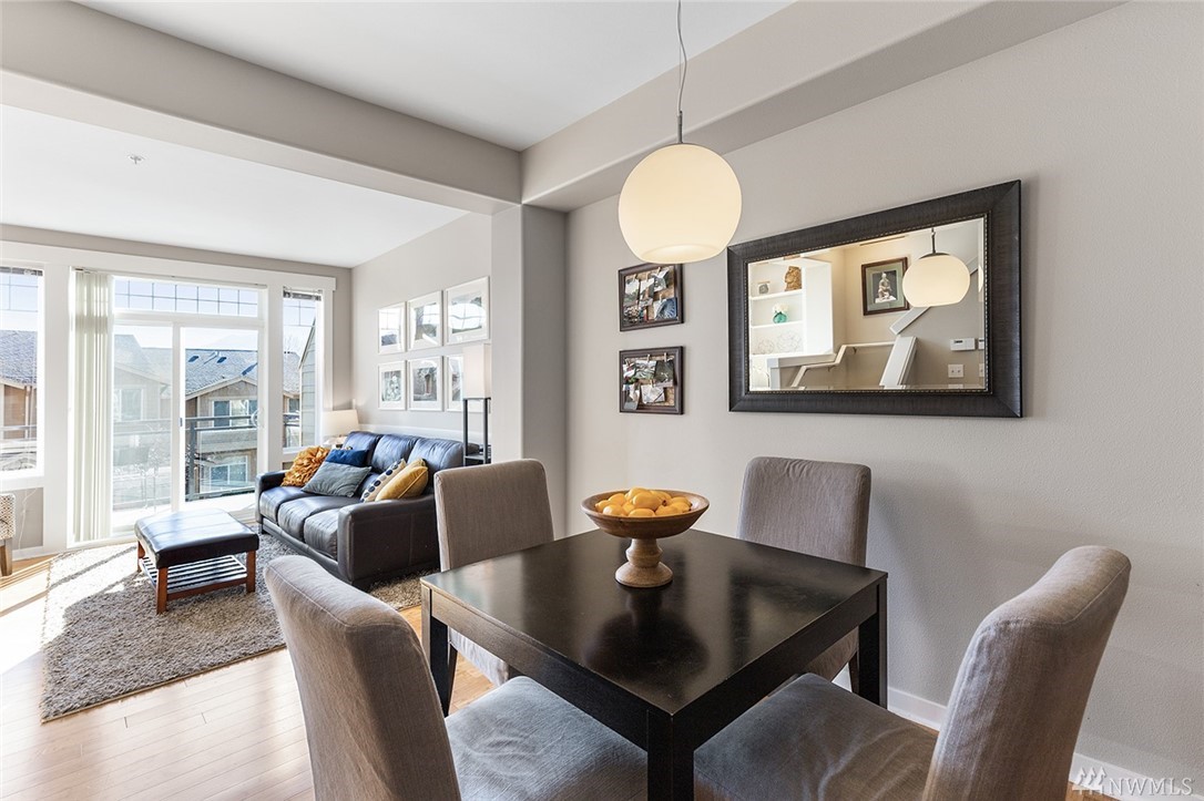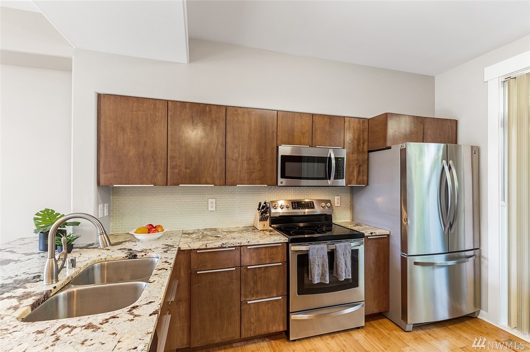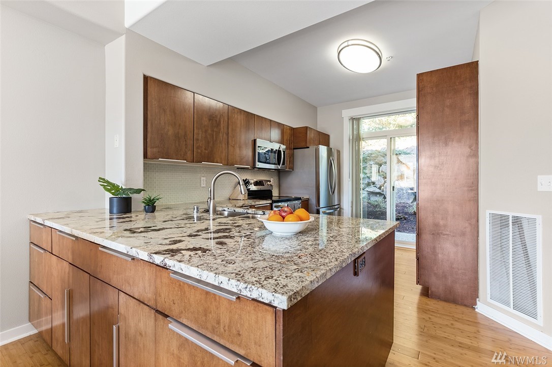 Mountain views and no homes in back of this modern townhome--the ultimate in peace and privacy. 1/2 bath on the main, bamboo flooring, fresh paint, updated brushed nickle hardware, new carpet, stainless steel appliances in custom designed, remodeled kitchen with huge island & storage pantry with roll outs. Attached two car garage w/ upper storage.Back patio can be fenced.Exterior NEW in 2012. Lots of guest parking. Easy access to park & ride/trail/I-90 and more. No rental cap.Huge HOA reserves.