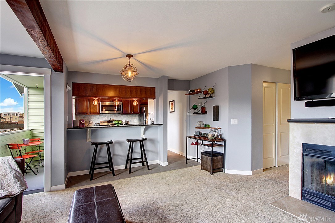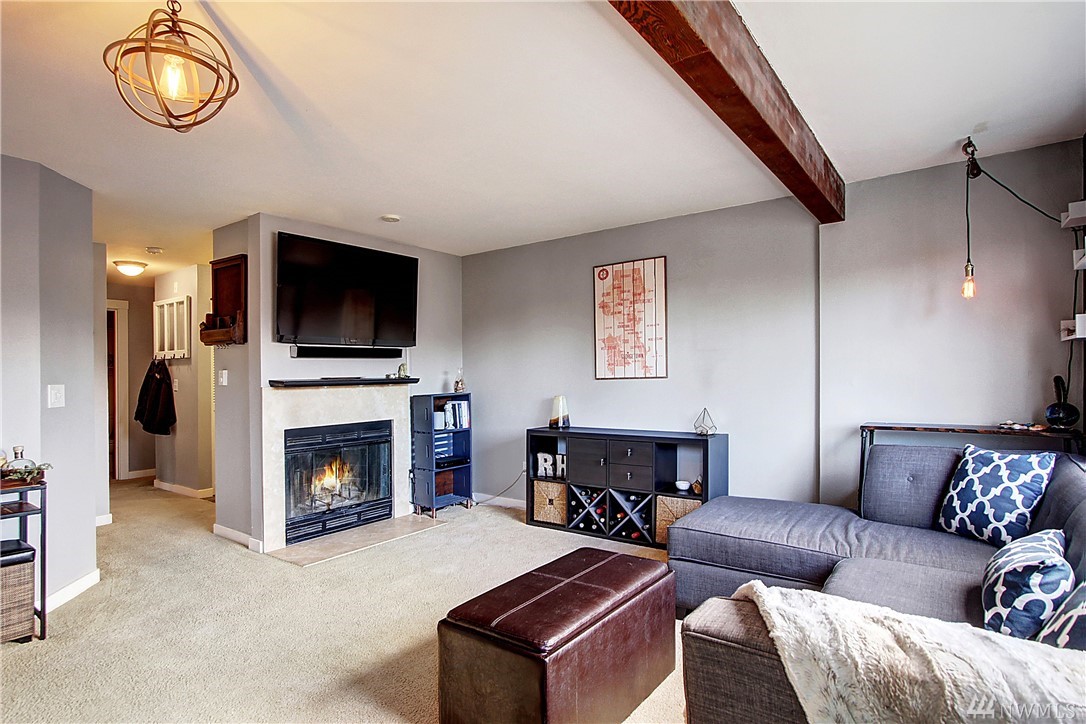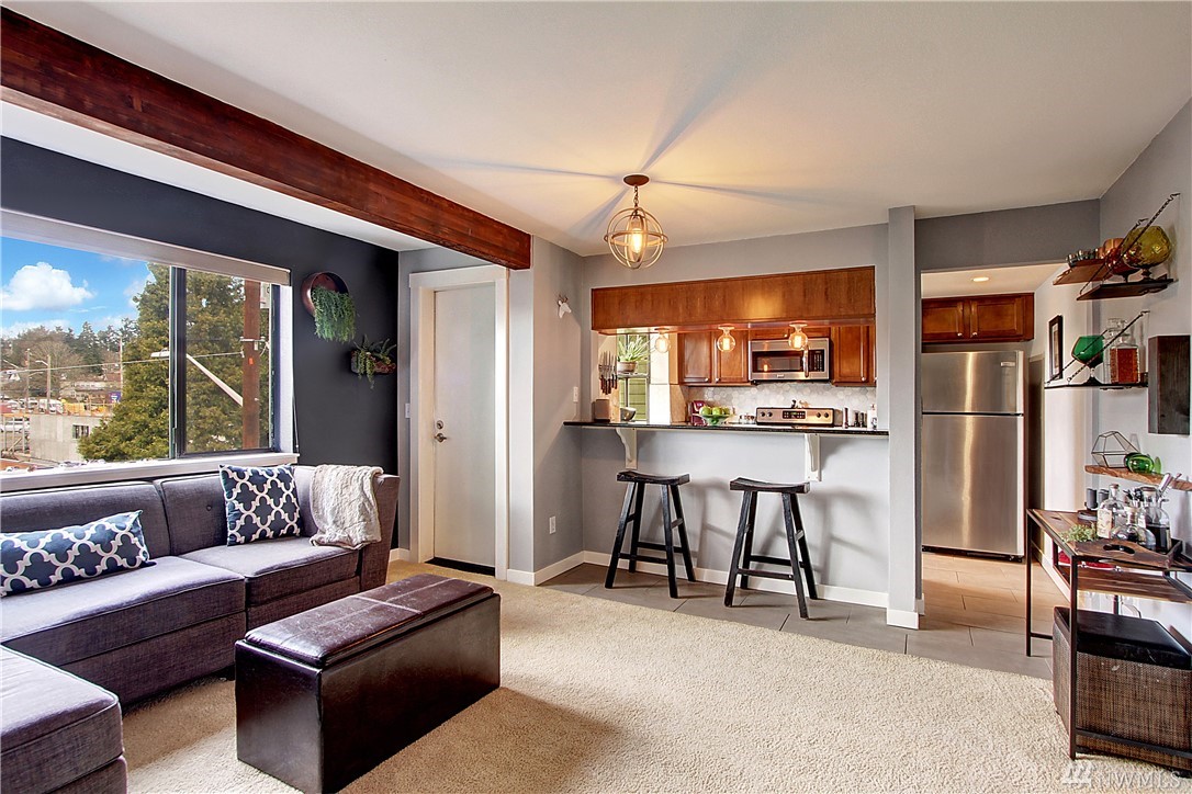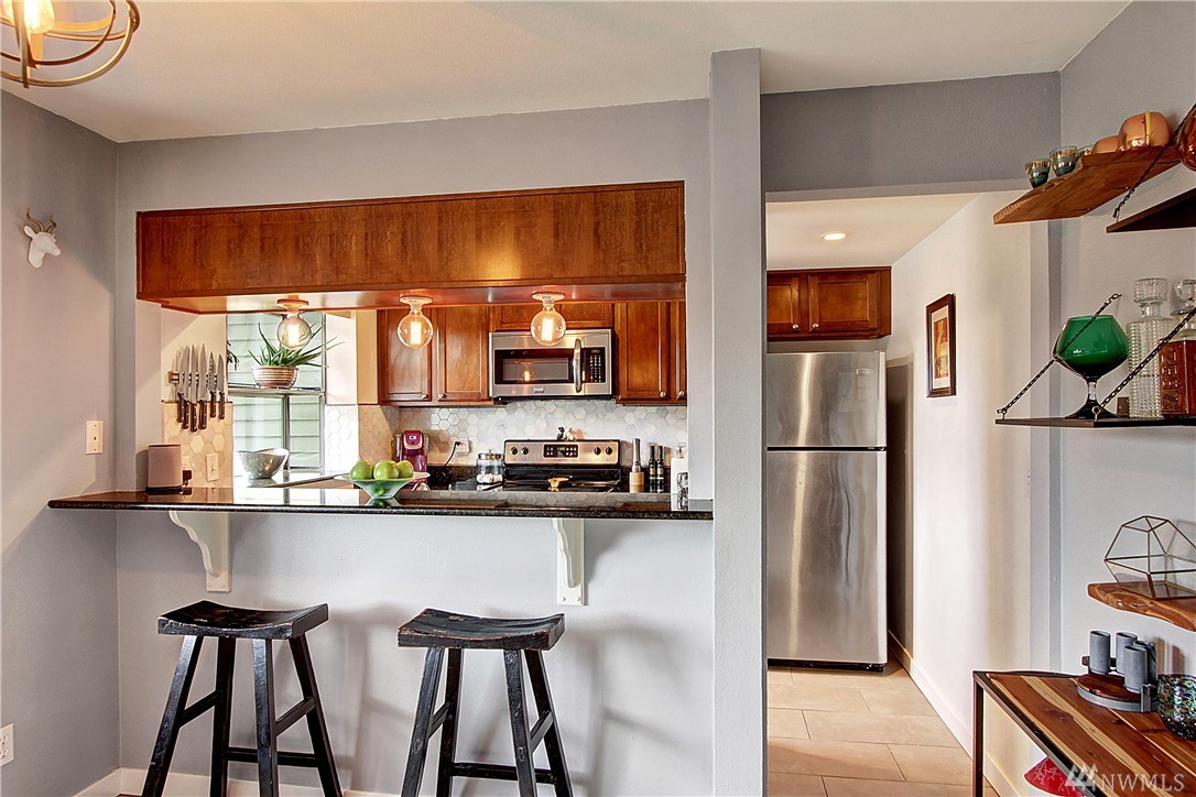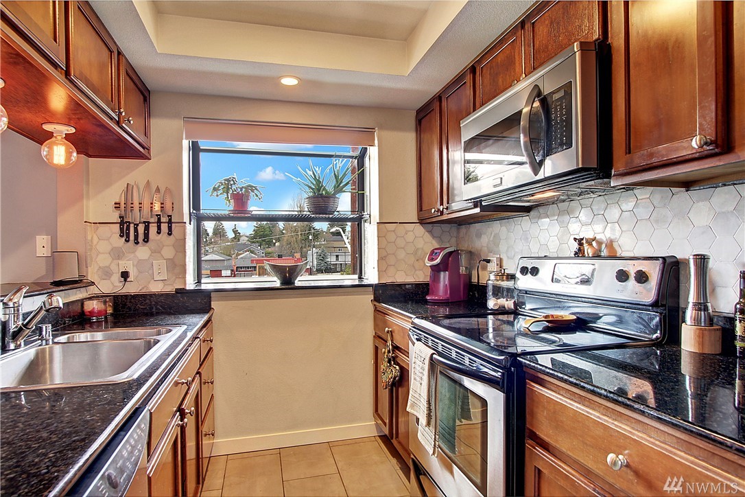 Fantastic value, less than a mile from Green Lake! Walking distance to restaurants, coffee shops, PCC and 2 new schools. Short drive to Golden Garden Beach, Downtown Seattle or UW. Nicely updated 2 bedroom and 1.5 bath. Wood-burning fireplace w/stone surround in living room. Kitchen w/granite counters, tiled floor and garden window. All appliances will stay. West facing covered deck. Secure building and garage with 1 parking. FHA approved!