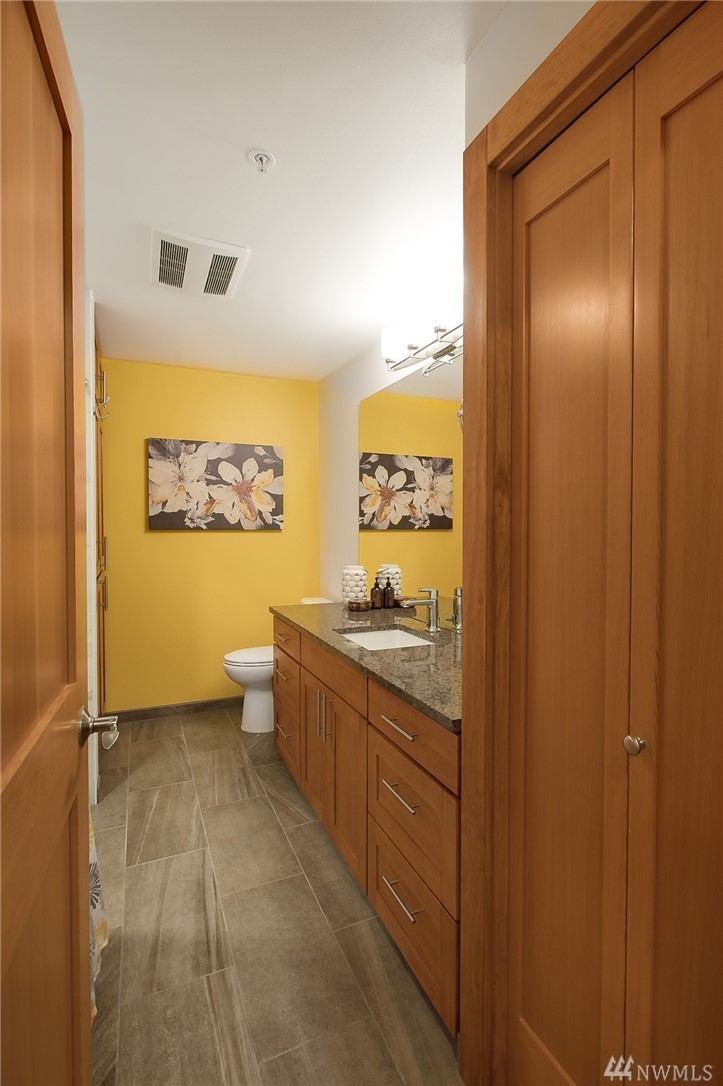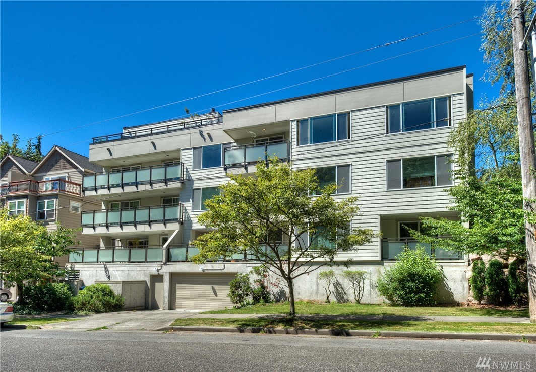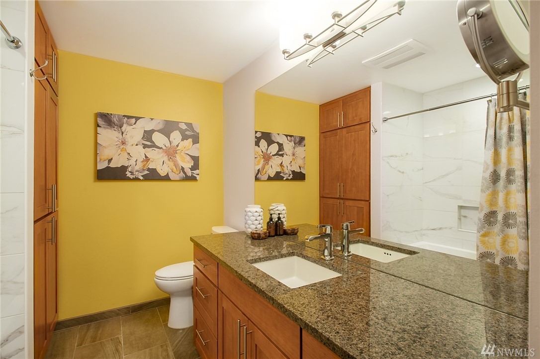 Sophisticated and Serene. You’ll love this incredible home at the Benson – a boutique bldg w/easy access to Downtown, waterfront bike path, Interbay & the Village. A recent renovation features thoughtful design choices, impeccably executed. Gorgeous kitchen w/richly hued cabs, stunning granite counters & glass backsplash overlooks roomy liv/din area w/adjacent deck & views out to the trees. Spacious new bath boasts spa-like finishes & copious storage. Impressively large storage unit & garage pkg