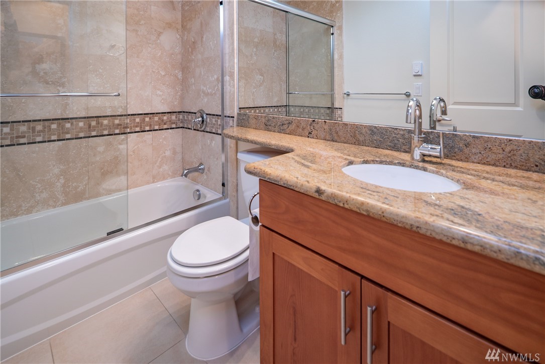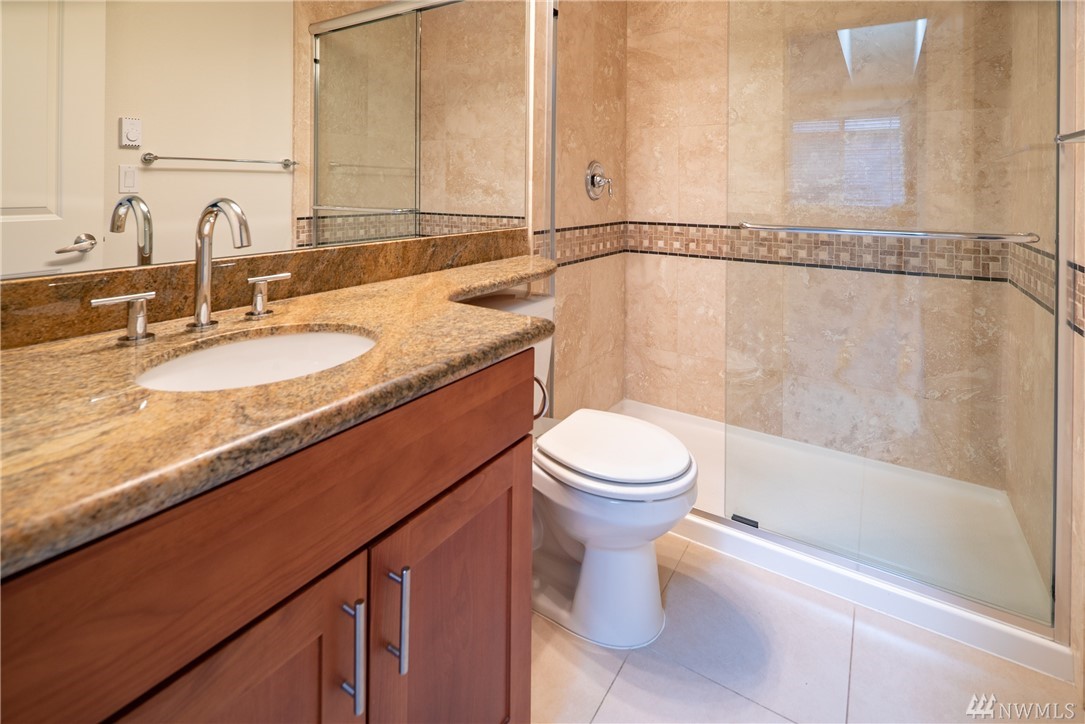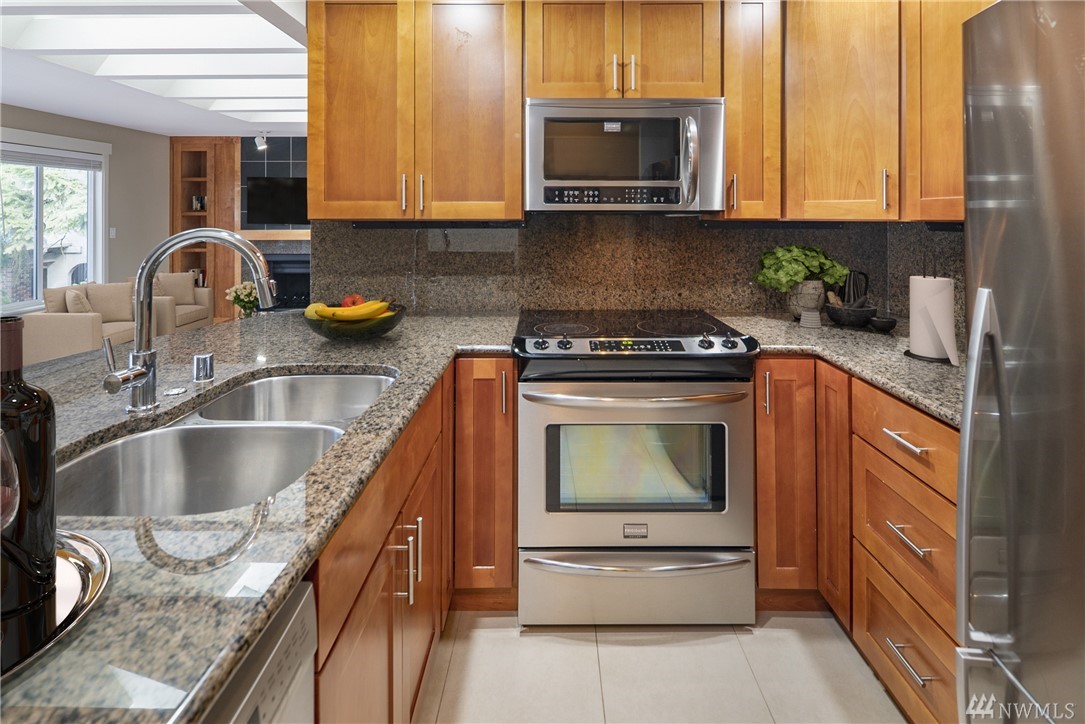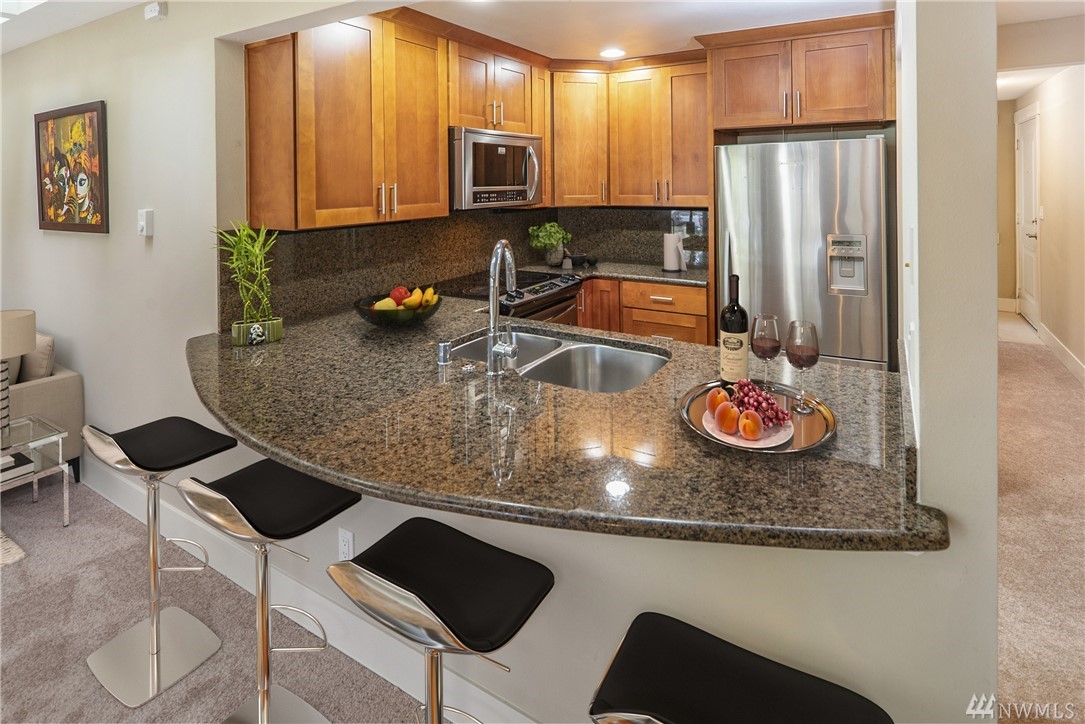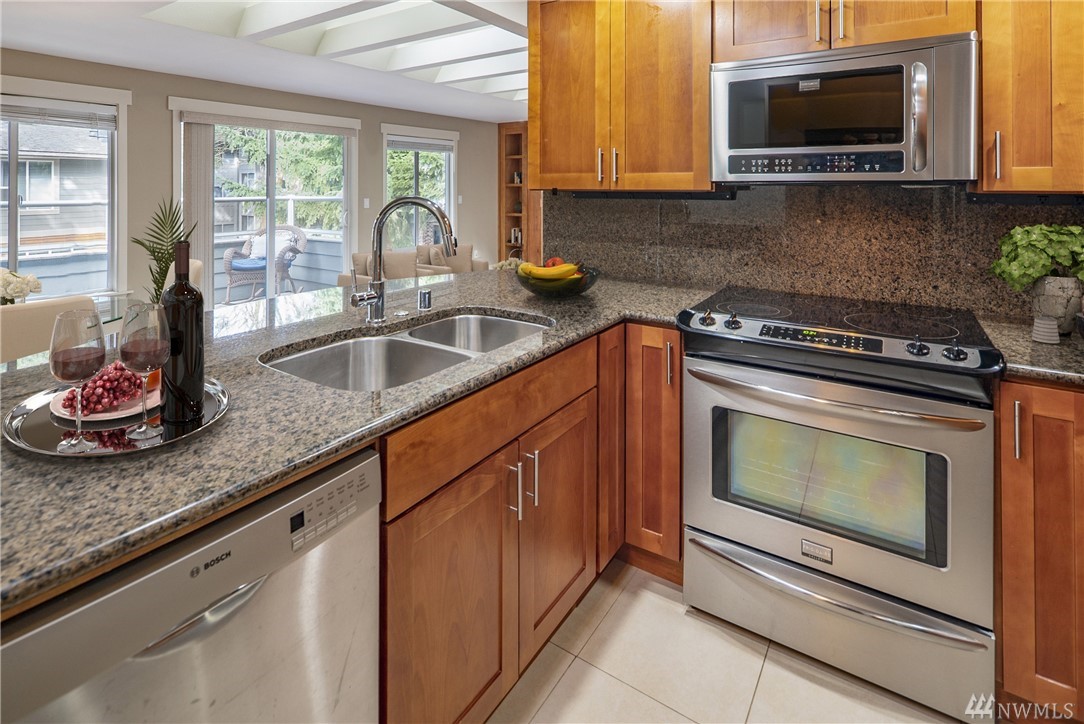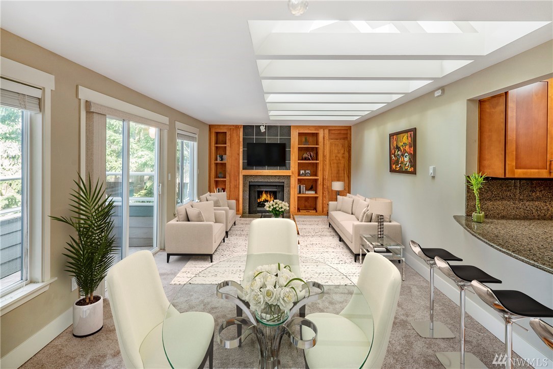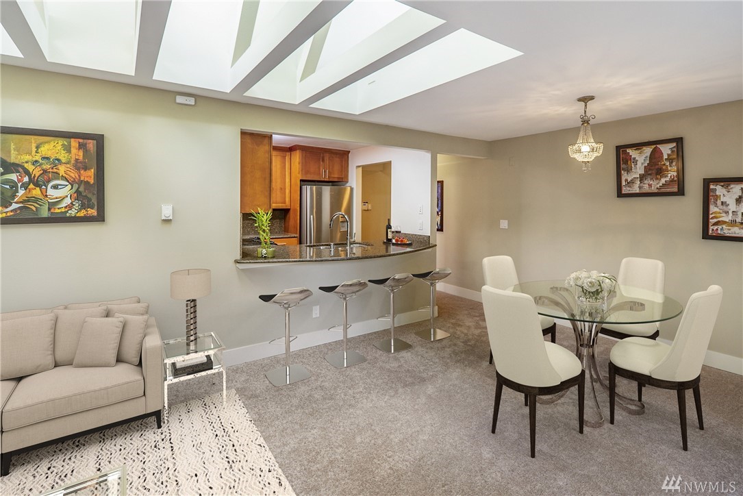 Beautiful top floor condo. Fresh remodel! West-facing grand windows. Large Living room w/high ceilings & skylights bringing abundant natural light! Transition smoothly between living & dining rooms! Kitchen features custom finished cabinets, spotless granite counter tops SS appliances & eating bar. Living Room custom built-in entertainment center! Entertain large parties on the private deck. Spacious garage. Walking distance to bus stop, crossroads Mall, parks, trails, Bellevue DT/Microsoft.