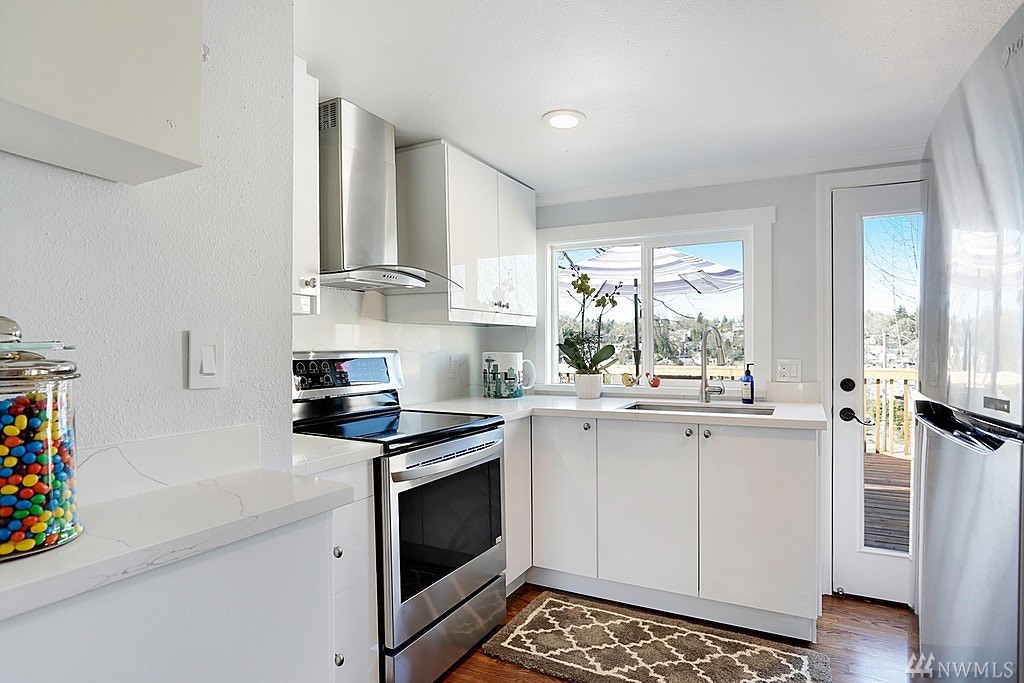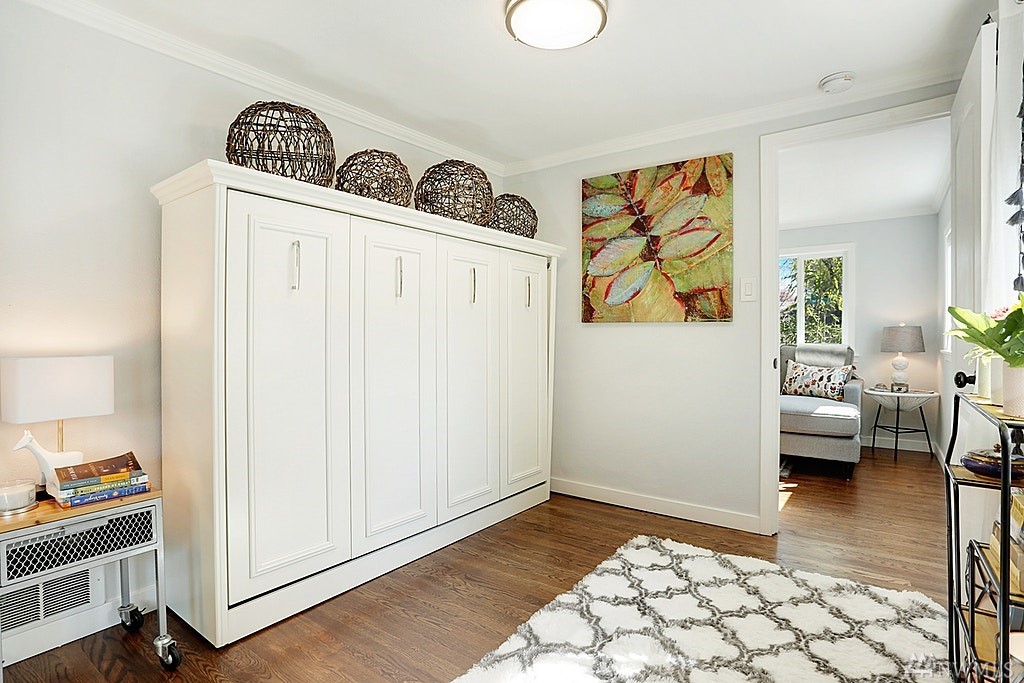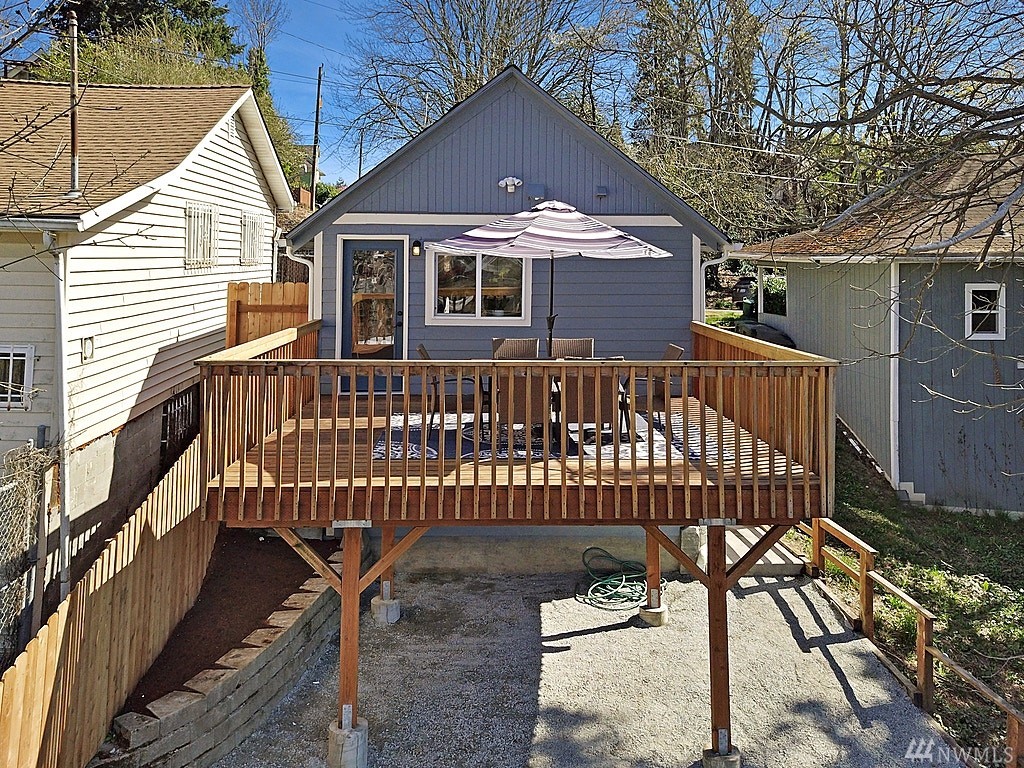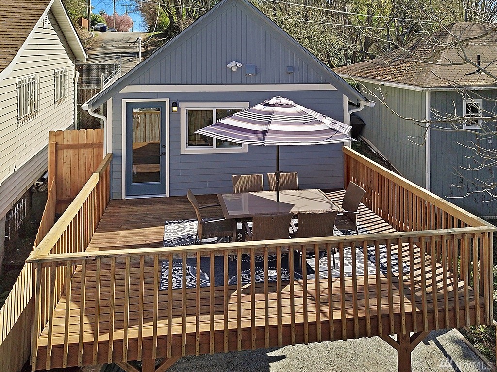 Rare, stylish, Hillman City pied-a-terre, condo alternative, small house or Air B & B. WALK SCORE 89: walk 10 min to Light Rail Station & 8 min to PCC & fabulous Columbia City! Sweet bungalow is 100% updated. Abundant natural light & oversized VIEW deck & ALL NEW finishes & appliances, hardwood floors. Lives larger than you think with new built-ins, Murphy bed, electric fireplace media center, stacking w/d. Basement w dry storage. Very private & cozy. 2+2 off st parking w sunny backyard.