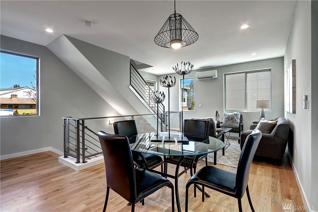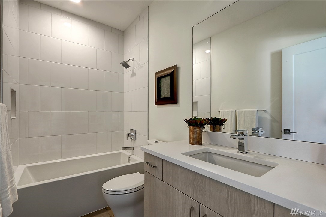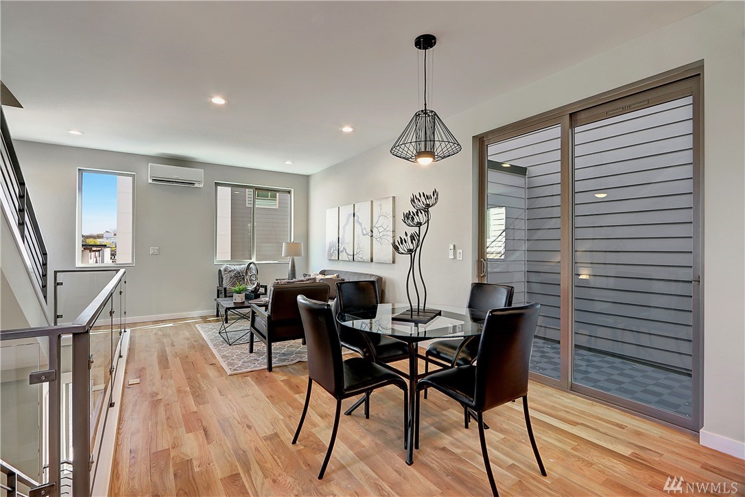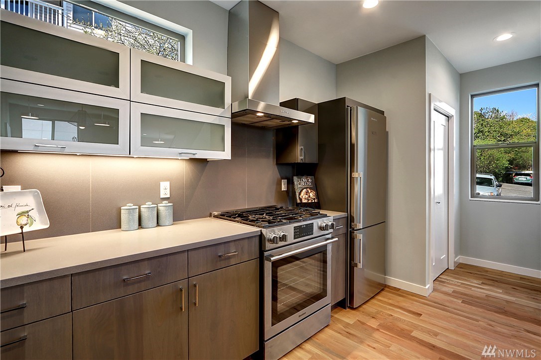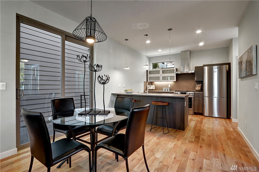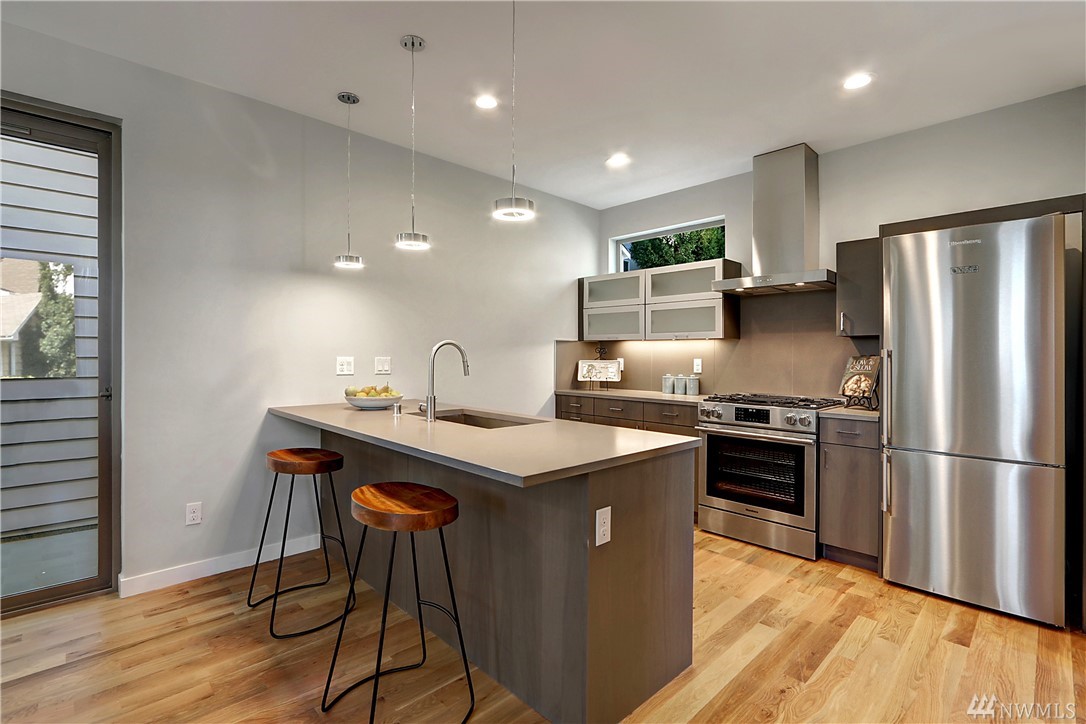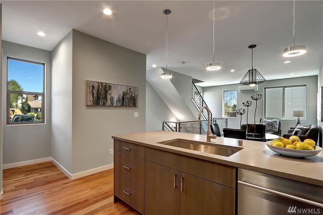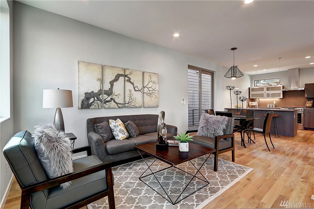 New Construction in the center of it all! Modern finishes, hardwoods, Quartz counters, stainless steel appliances. Master w/en suite 3/4 bath, 2nd bed/office and full bath up. Lower level bedroom guest suite with full bath. Designer tile accents. Roof top deck. Wonderful amenities within blocks, shopping dining, entertainment. Leave your car in the garage and take the bus, great commuting options to downtown: Google, Expedia, Amazon & Facebook.