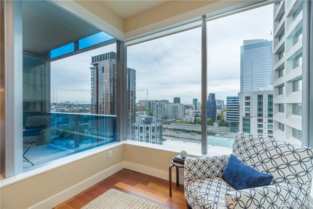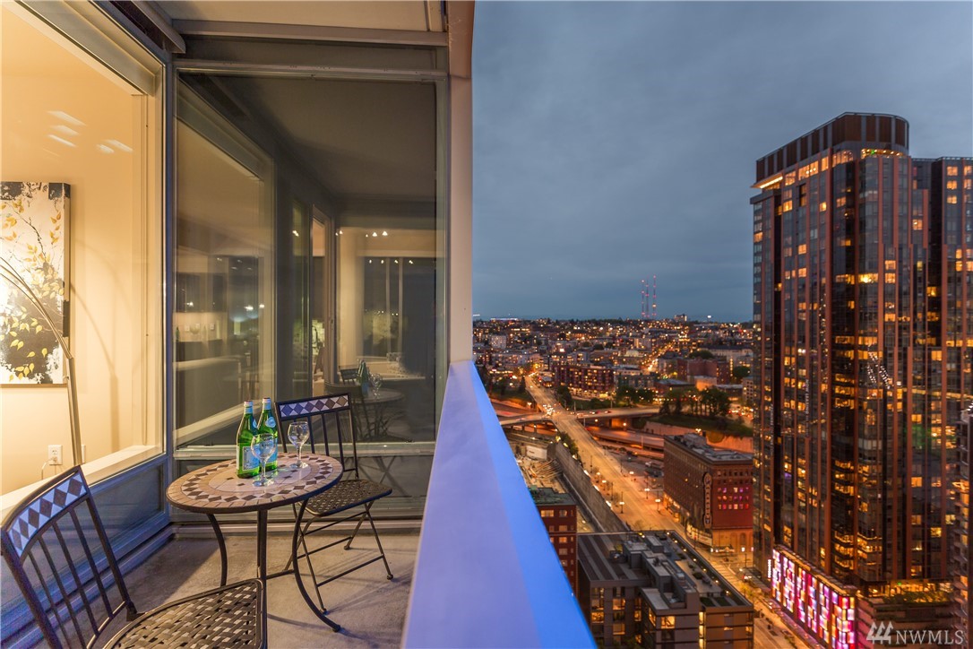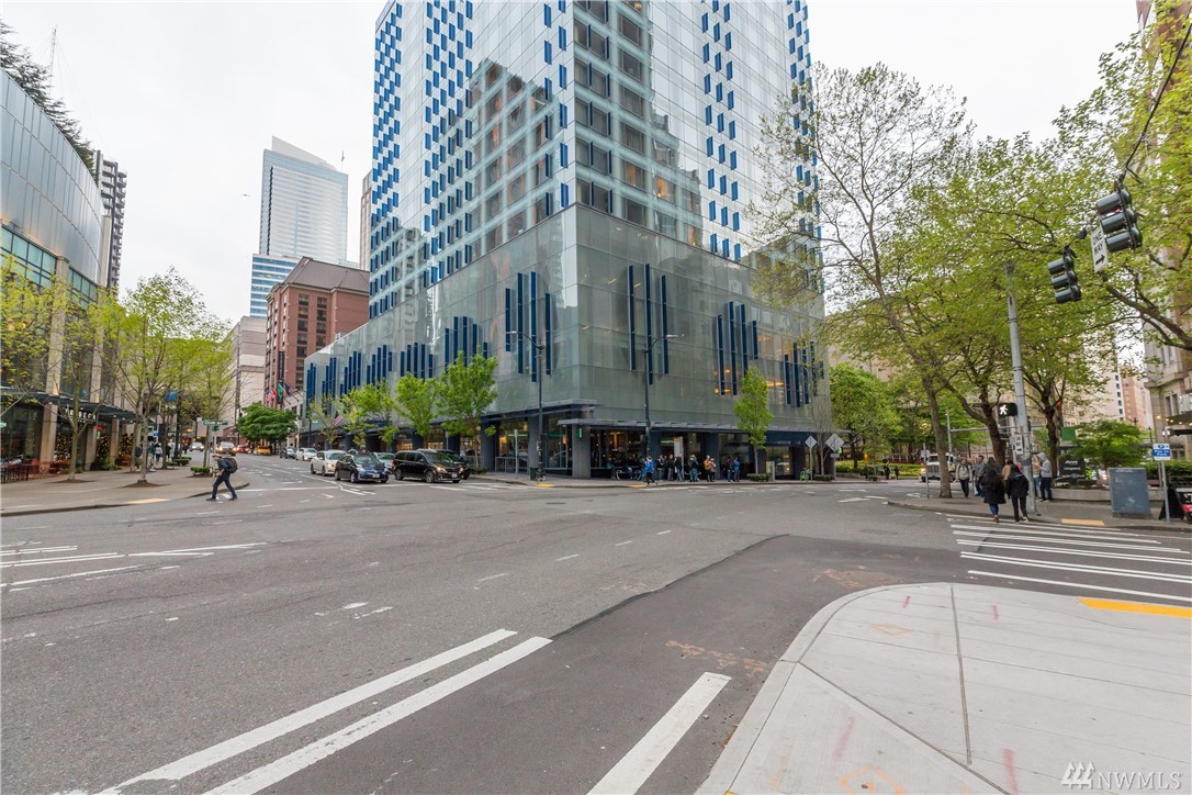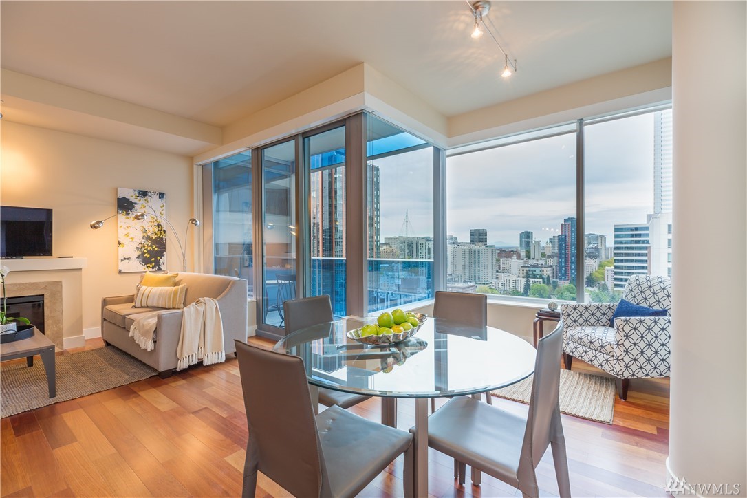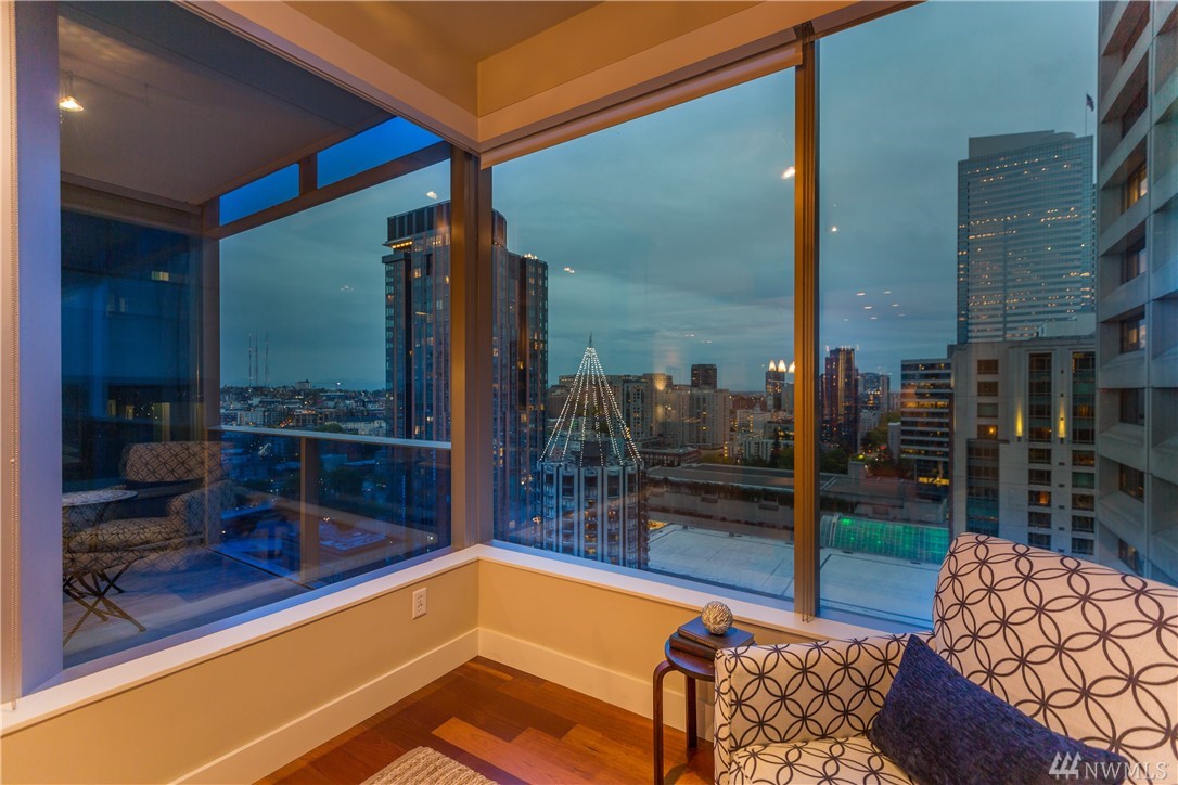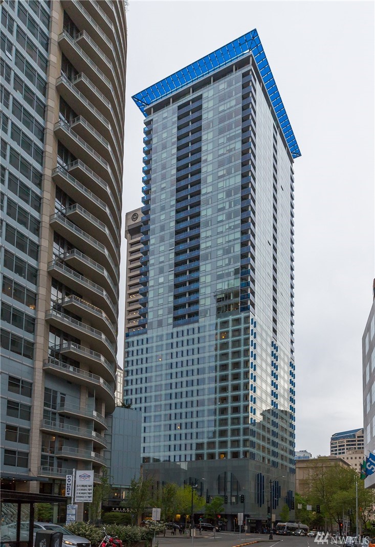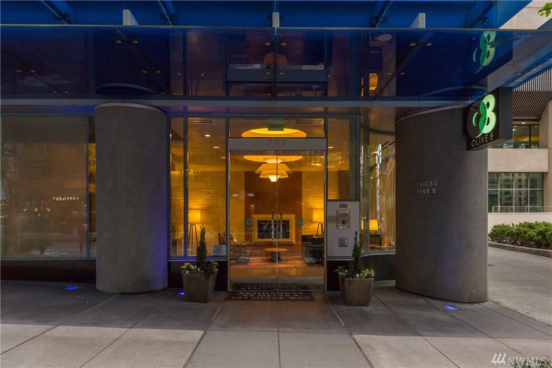 Luxury living in Olive 8, World Class Hyatt Hotel & Private Residences w/Views of City, Water & Mountains. Concierge services w/24/7 Security, Reserved Parking Space, 18th Floor Terrace/Common Meeting Space, Athletic Club Membership Avail + On-Site Restaurant/Coffee Shop. Desireable Corner Unit on 28th Floor w/Spacious Master Suite & Luxurious Bath + Guest Bath, Hardwood Floors, Fireplace + Air Conditioning! Tons of Windows w/Southerm Exposure & Balcony. Great Access to I-5 & Downtown Amenities
