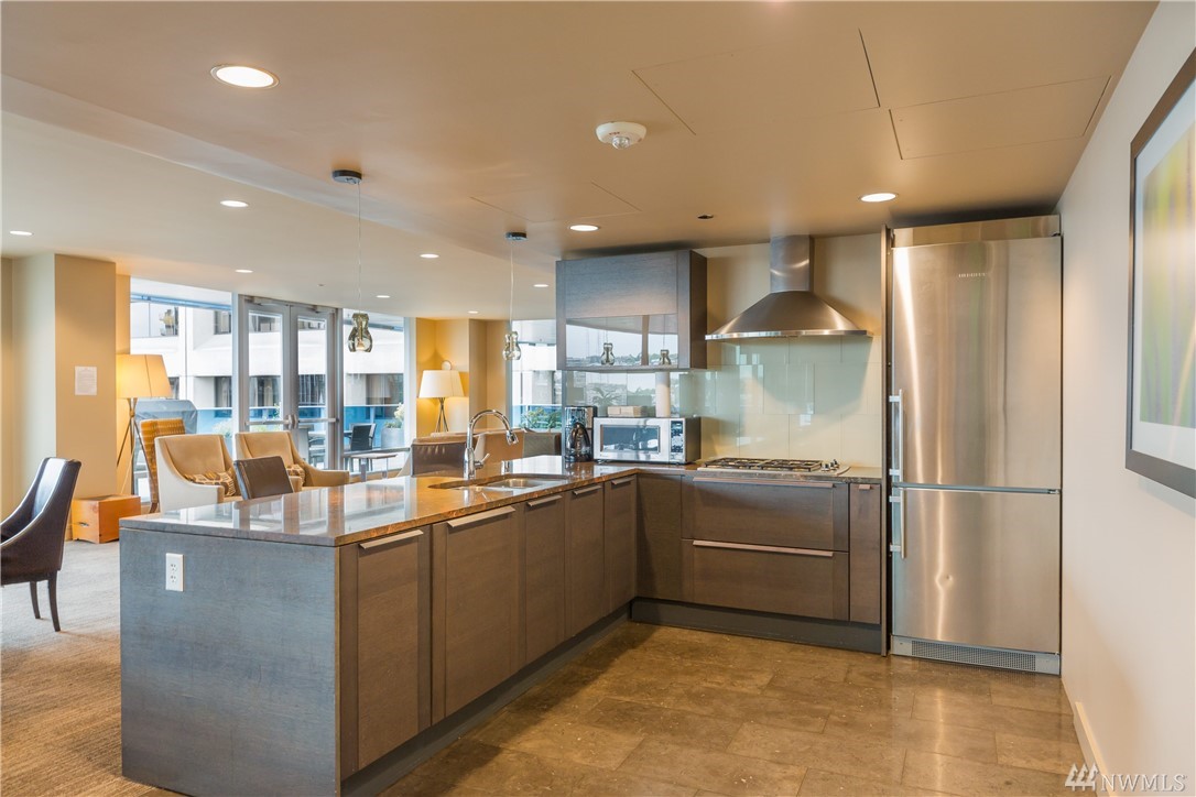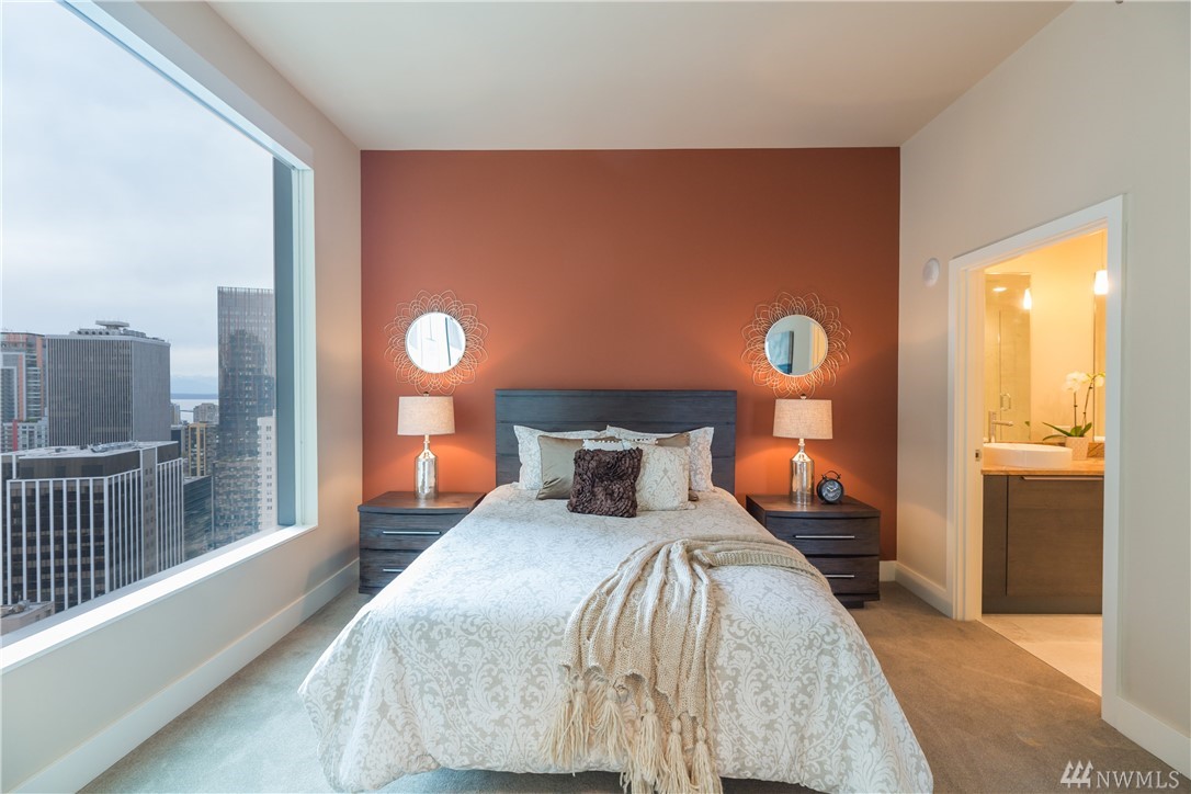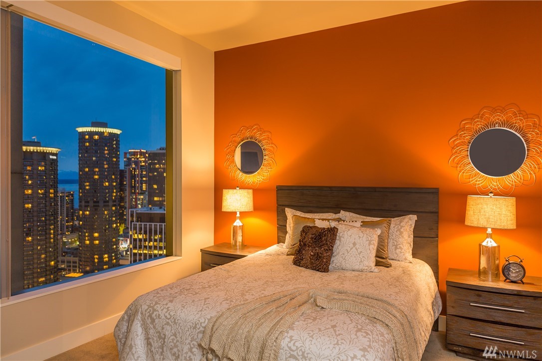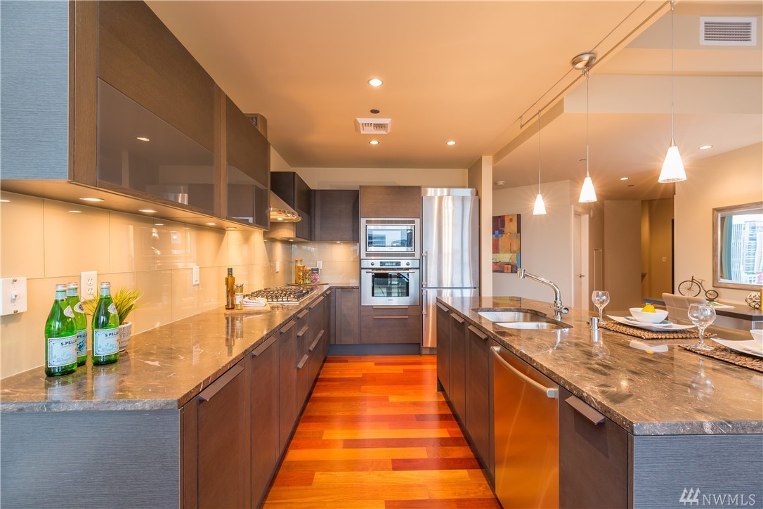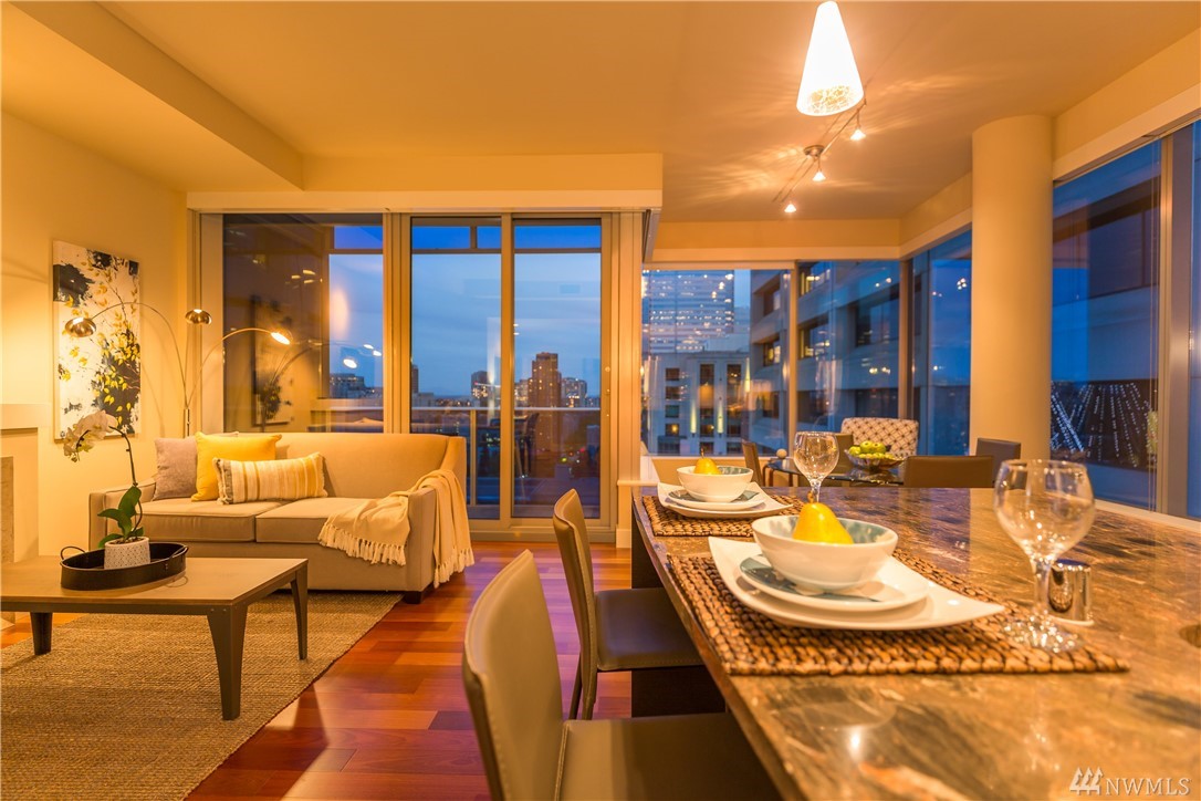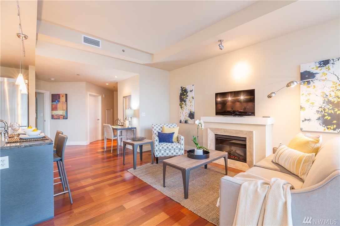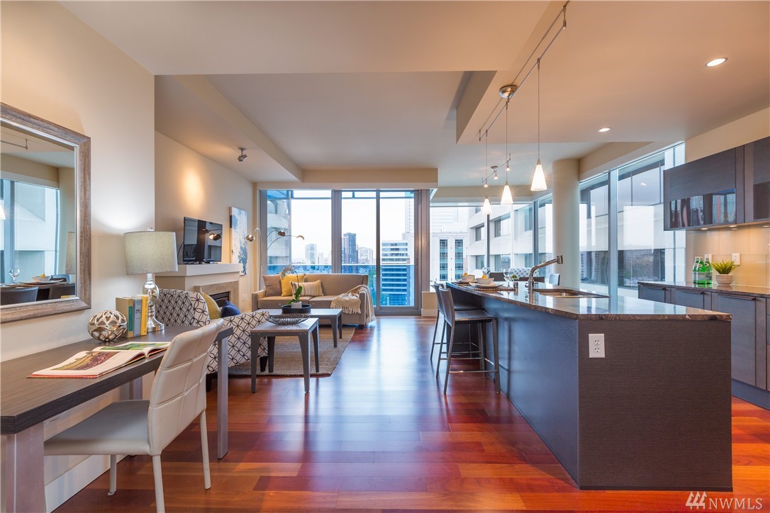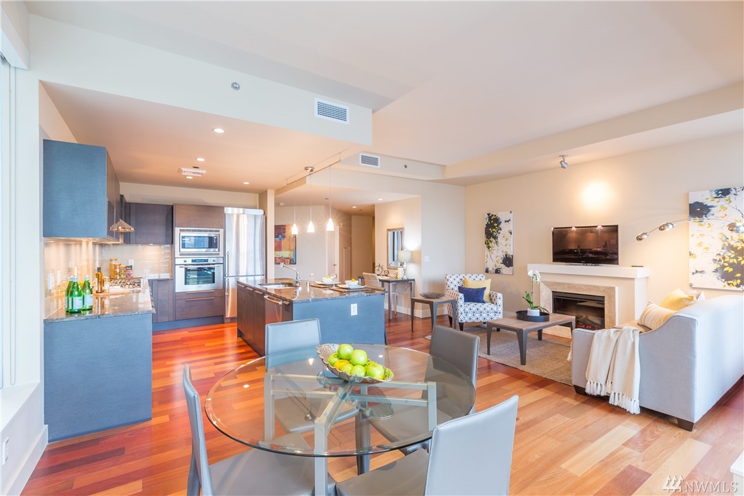 Luxury living in Olive 8, World Class Hyatt Hotel & Private Residences w/Views of City, Water & Mountains. Concierge services w/24/7 Security, Reserved Parking Space, 18th Floor Terrace/Common Meeting Space, Athletic Club Membership Avail + On-Site Restaurant/Coffee Shop. Desireable Corner Unit on 28th Floor w/Spacious Master Suite & Luxurious Bath + Guest Bath, Hardwood Floors, Fireplace + Air Conditioning! Tons of Windows w/Southerm Exposure & Balcony. Great Access to I-5 & Downtown Amenities