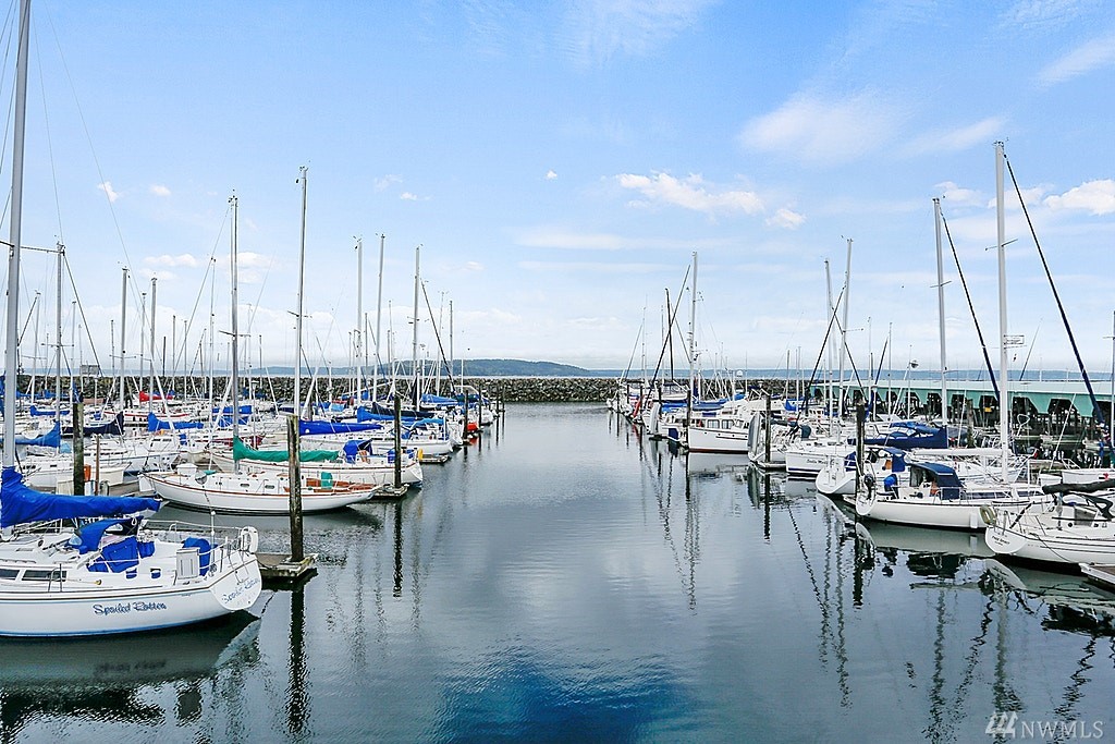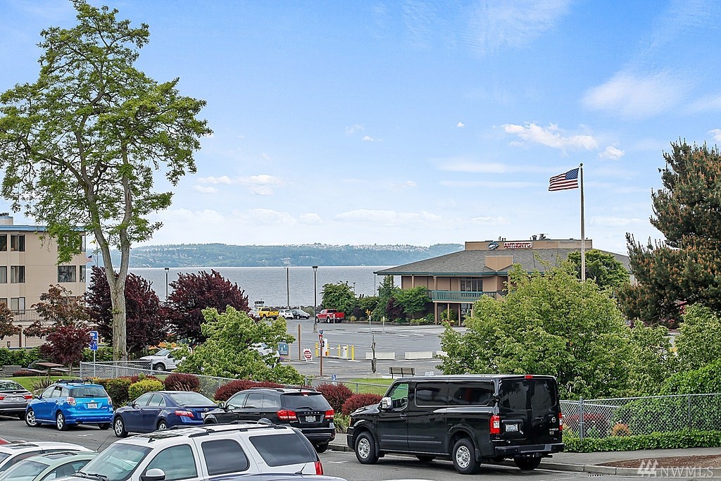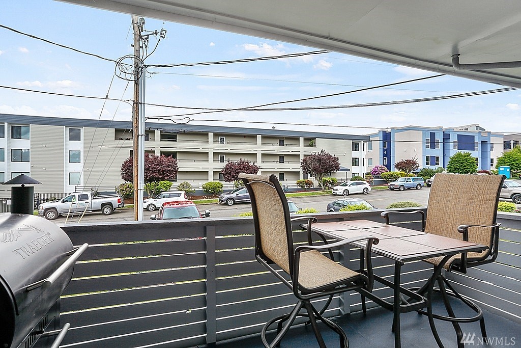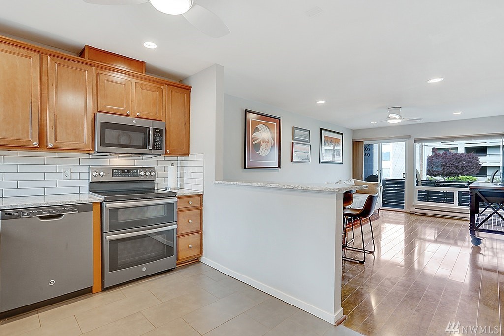 Beautifully remodeled condo with view of the Des Moines area. Kitchen with quartz countertops and subway tile back splash, and stainless steel appliances and breakfast bar. Bathroom with porcelain floors, quartz countertops and porcelain shower surround with rain showerhead. Cherry finish engineer hardwood floors throughout living area. Walking distance to restaurants, marina, and park. One reserved off-street parking space.