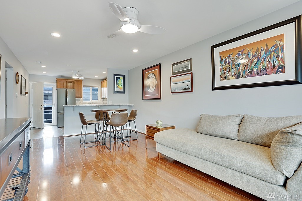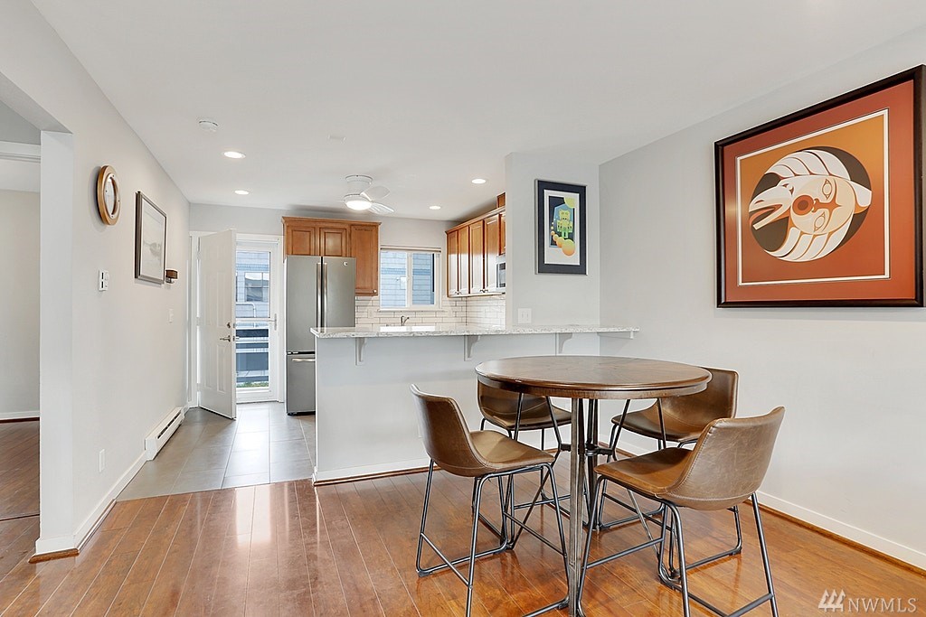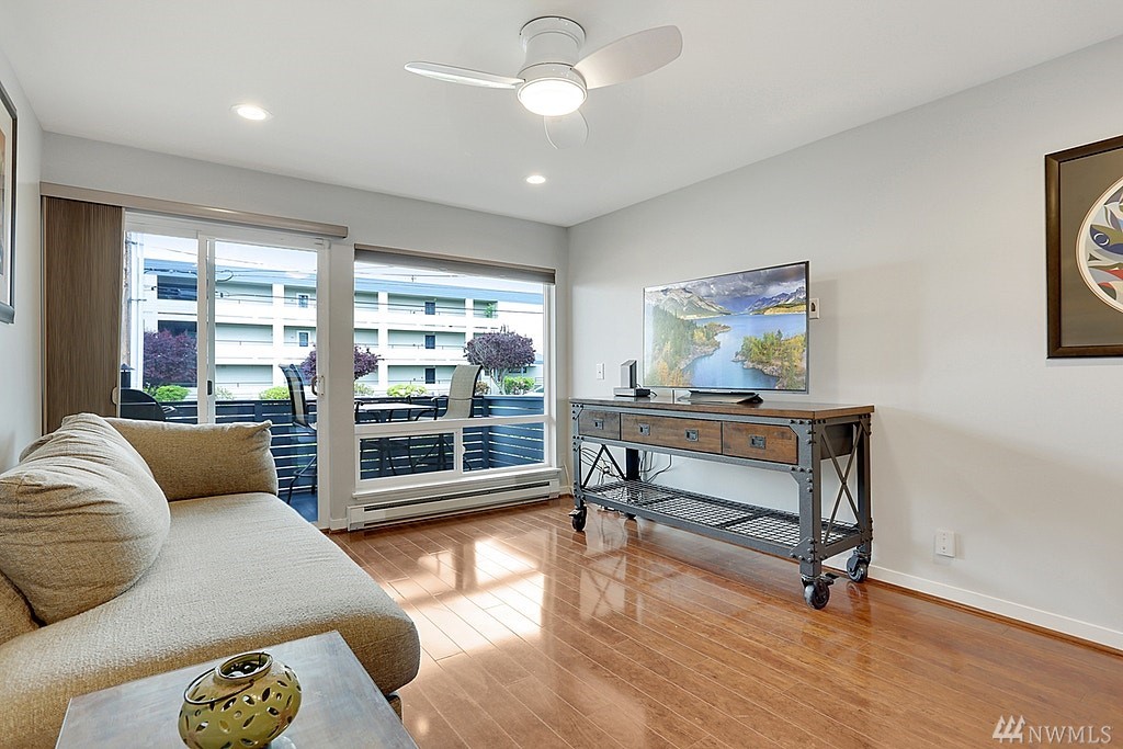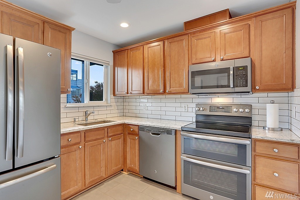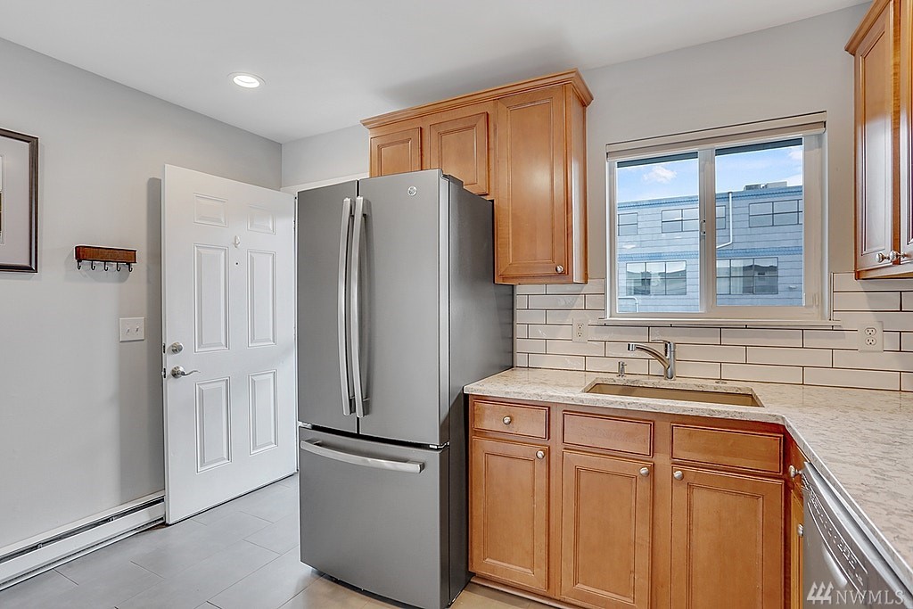 Beautifully remodeled condo with view of the Des Moines area. Kitchen with quartz countertops and subway tile back splash, and stainless steel appliances and breakfast bar. Bathroom with porcelain floors, quartz countertops and porcelain shower surround with rain showerhead. Cherry finish engineer hardwood floors throughout living area. Walking distance to restaurants, marina, and park. One reserved off-street parking space.