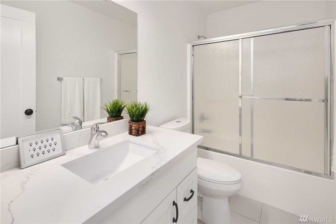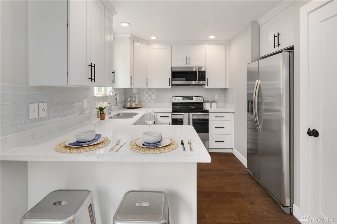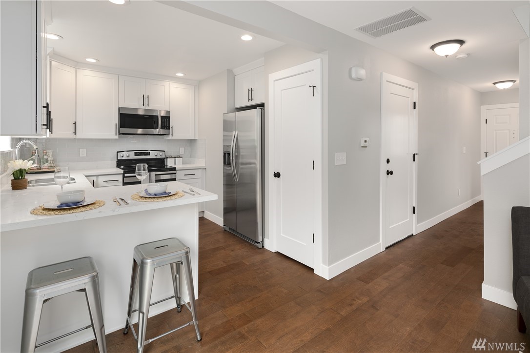 FULLY REMODELED and ready for its new owner. New doors/millwork, kitchen with shaker cabs, quartz c-tops, SS appliances, pantry and peninsula eating bar. Entire main floor has hardwood floors throughout and open concept living adjacent to kitchen. Upper level Master with en-suite bath, walk in closet, plus two additional bedrooms, main/full bath, laundry room and new carpet. Home backs to peaceful greenbelt with rear patio. New custom built deck in front with a fully fenced yard