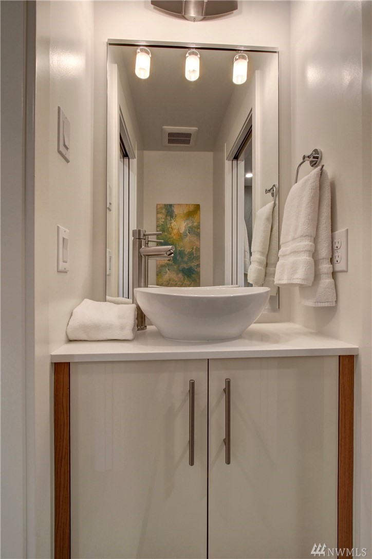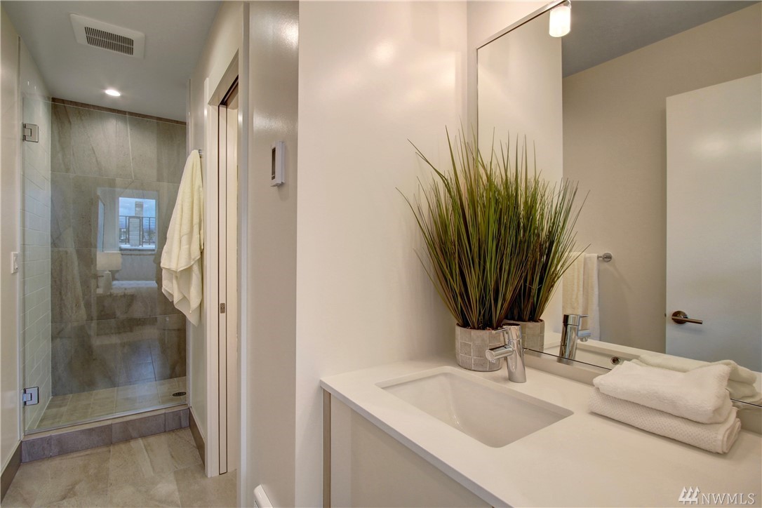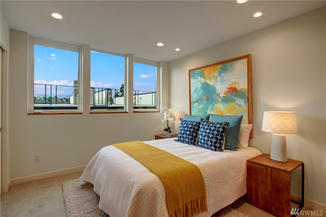 SW views of Alki & Olympic Mountains. Enjoy outdoor entertaining with gas, water & power service on your roof top terrace. Island kitchen, slab counters, stainless steel appliances. Hardwood floors throughout, chic design elements Tankless hot water heaters and ductless mini splits - high efficiency. Living rooms with steel wrapped gas fireplace. 2 beds, a tile 3/4 bath with 2 vanities. One car garage parking. Amazing location, make your commute to Expedia, Downtown, South Lake Union a breeze!