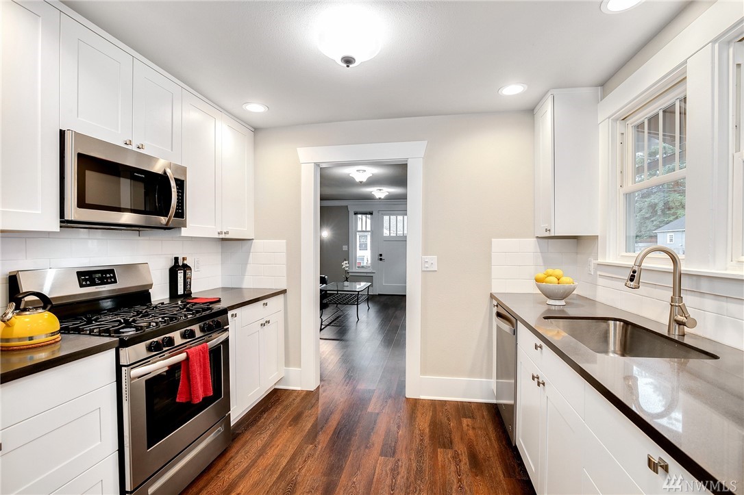 Move in ready, and charming Craftsman home in convenient downtown Renton. Updated spacious kitchen. Spacious bathroom with no expense spared. Amenities all within blocks: Shopping, community garden, restaurants, Lake Washington, Cedar River trail, and transit center. Fantastic commuter location for all directions. Off-street parking for 2-3 vehicles on side of house. Stunning updates like locally made custom cabinets and new flooring throughout makes this home like new. A fantastic find!