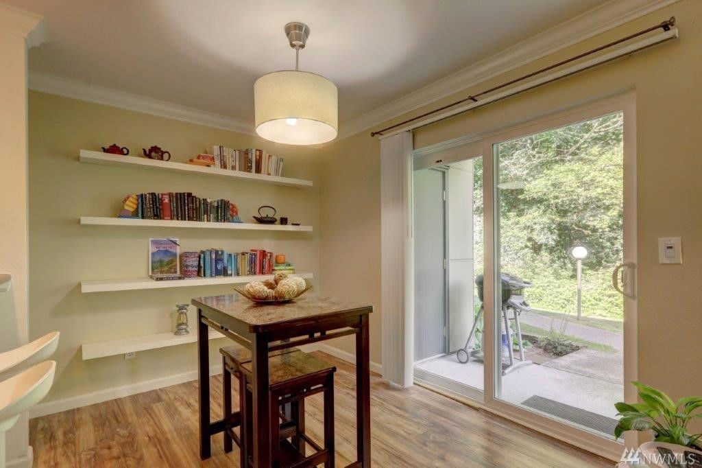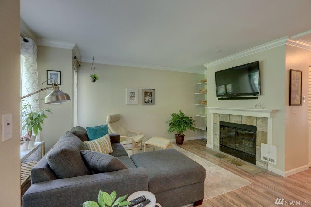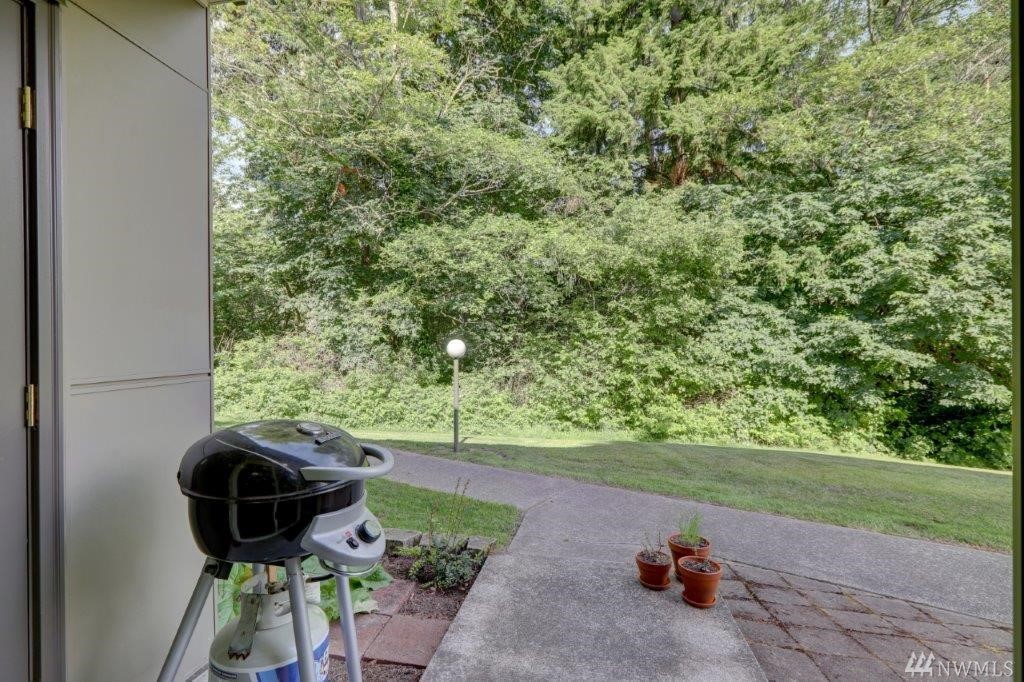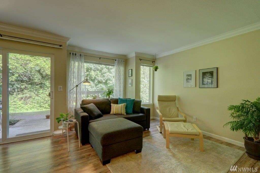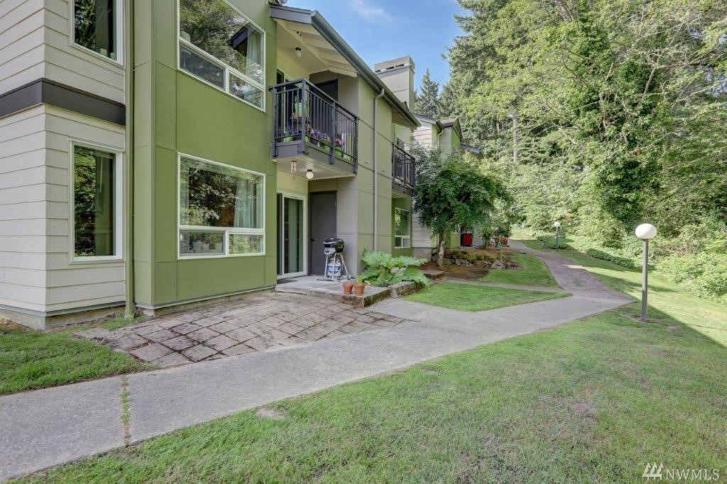 Lovely ground floor end unit peacefully set against a quiet treed nature ravine. It's shady back there, which is great as the temperatures increase, unlikely to ever need A/C! Unit features new laminate flooring, updated bath amenities, large walk/in closet, Full size W/D, Cozy wood burning FP & floating shelves in D/R. Mounted LED TV w/ sound bar stays! Community clubhouse has fitness center, hot-tub, outdoor pool, tennis courts, playgrounds. Special assessment already paid by Seller!