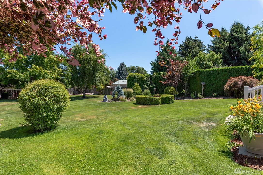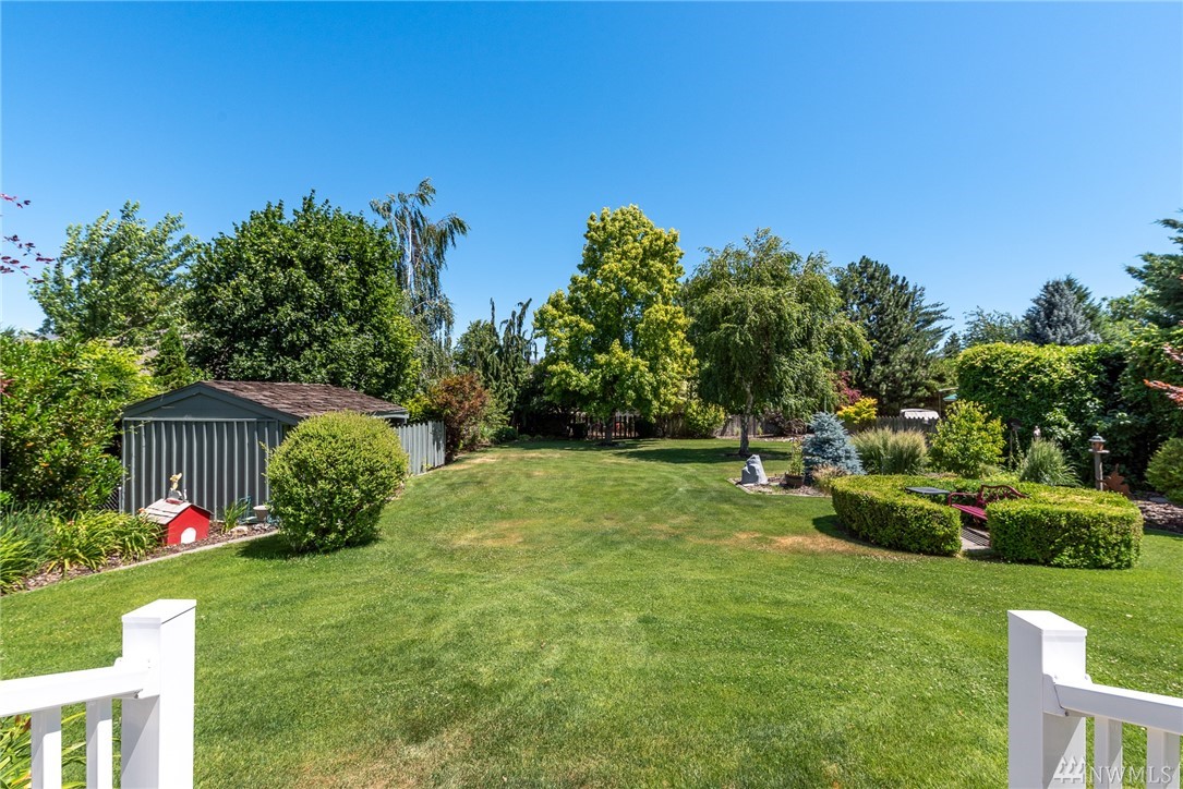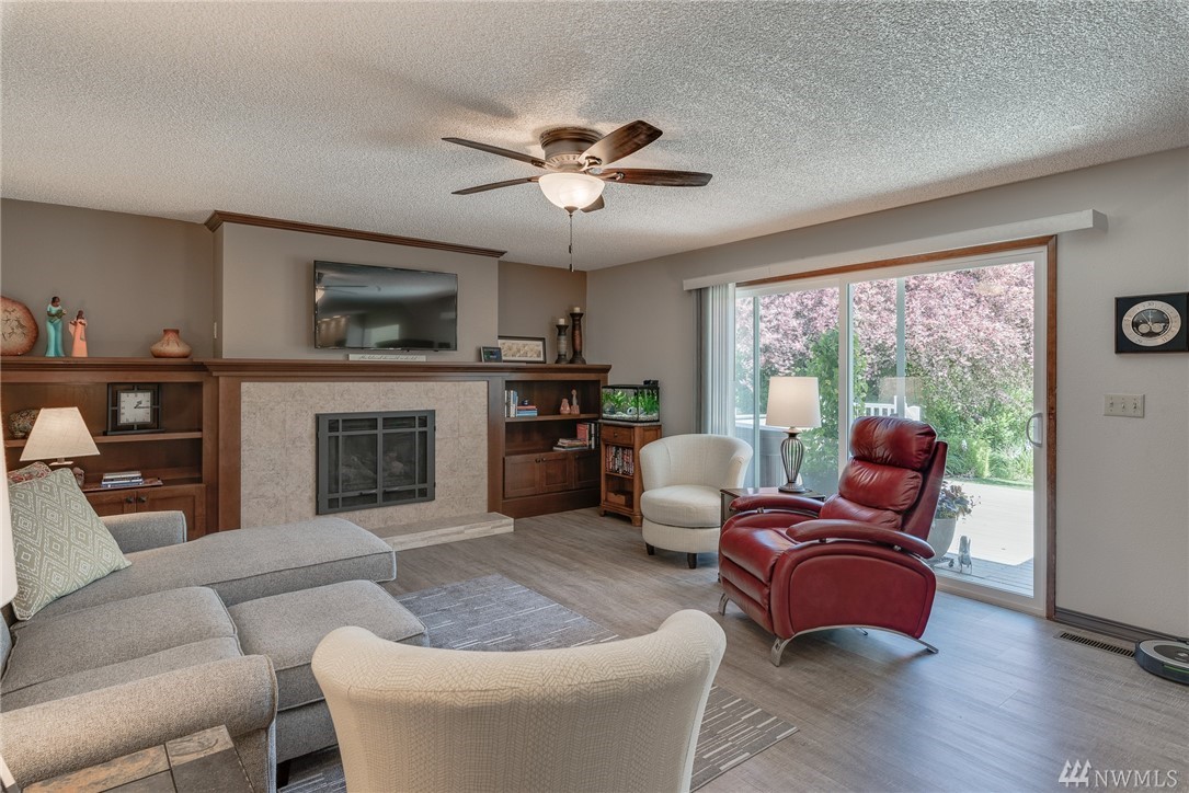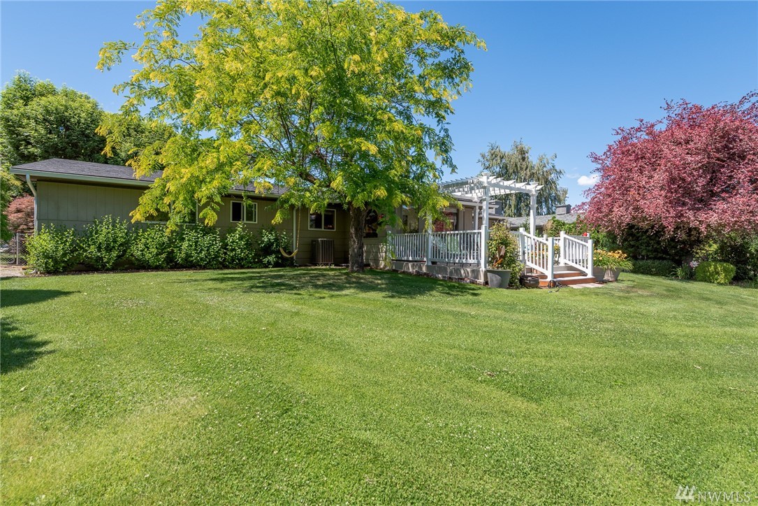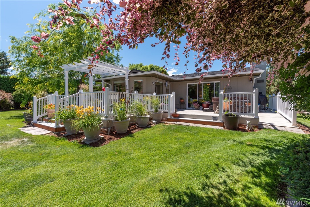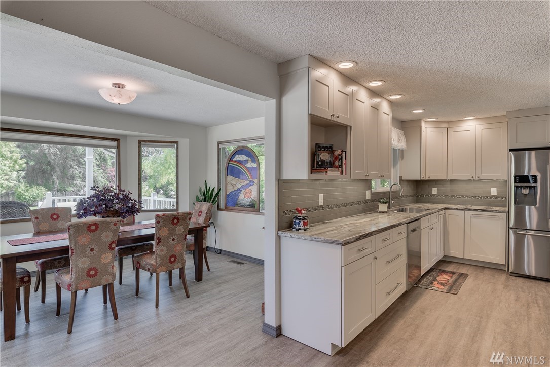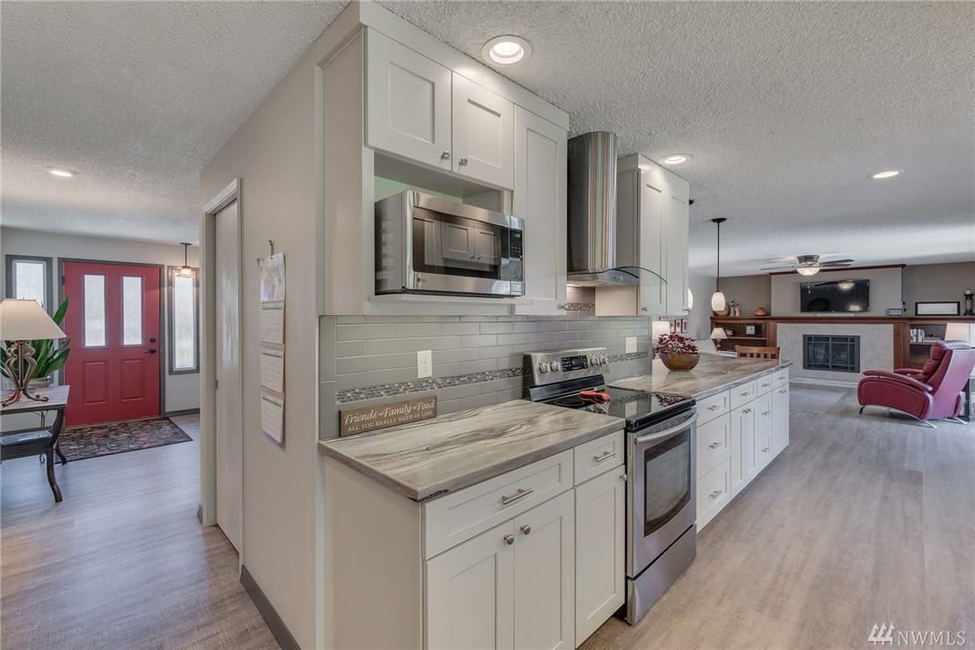 Surprises! Gorgeous new kitchen with all the "bells and whistles", new flooring, open floor plan & classy fireplace wall with built-in shelving. Delightful windowed dining room overlooks deck, green grass, tall trees & plenty of space to garden and play. *Extra parcel in back is included, RV parking behind off alley and lovely garden shed.