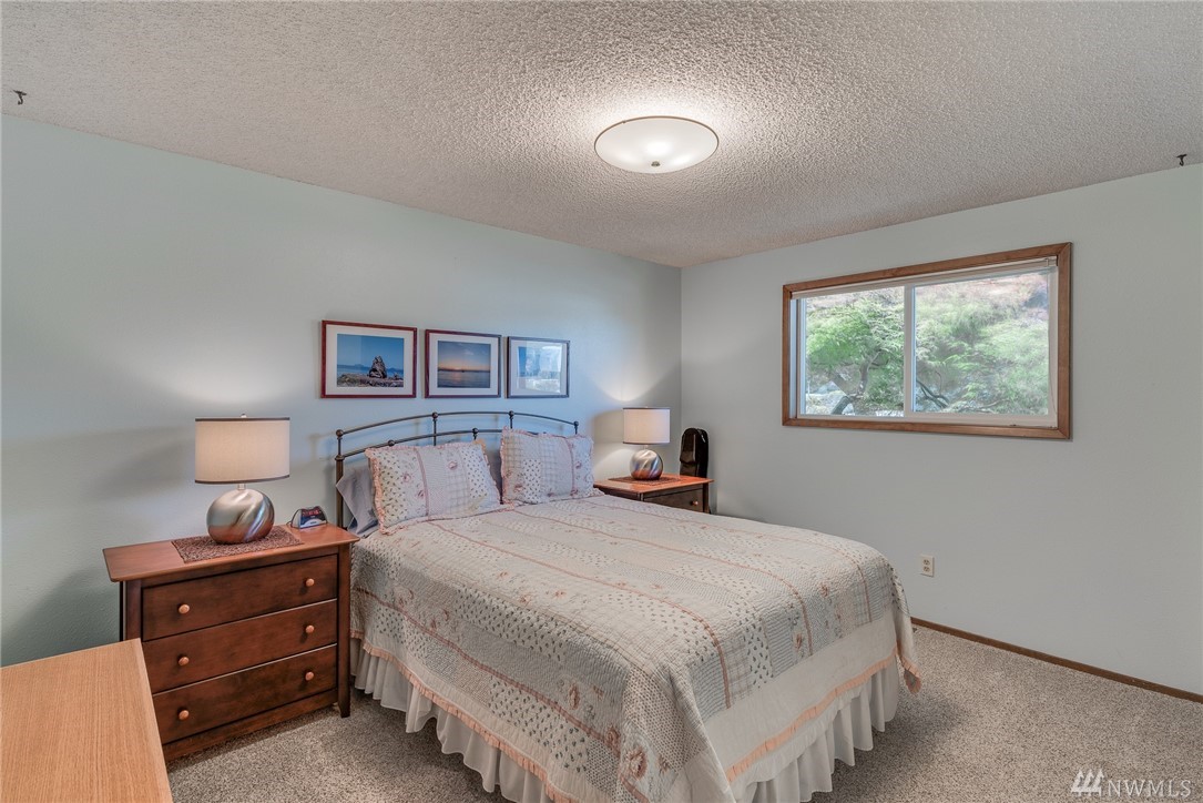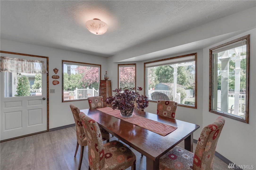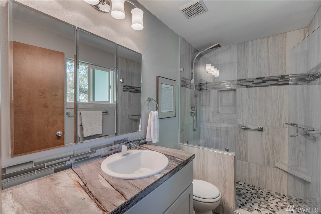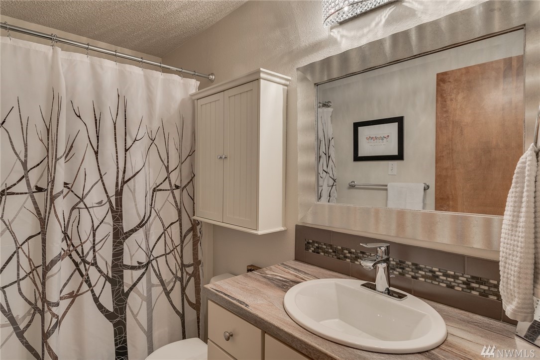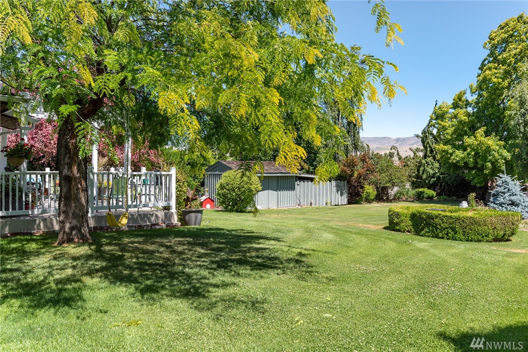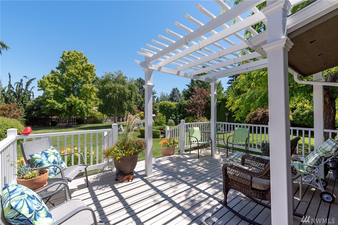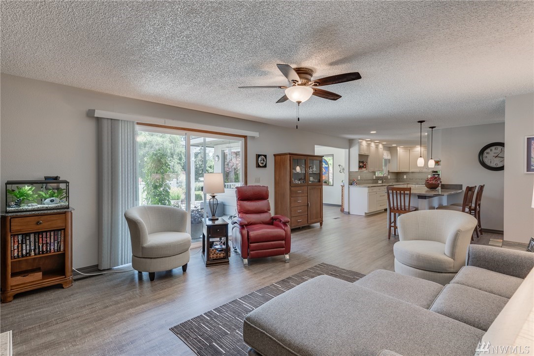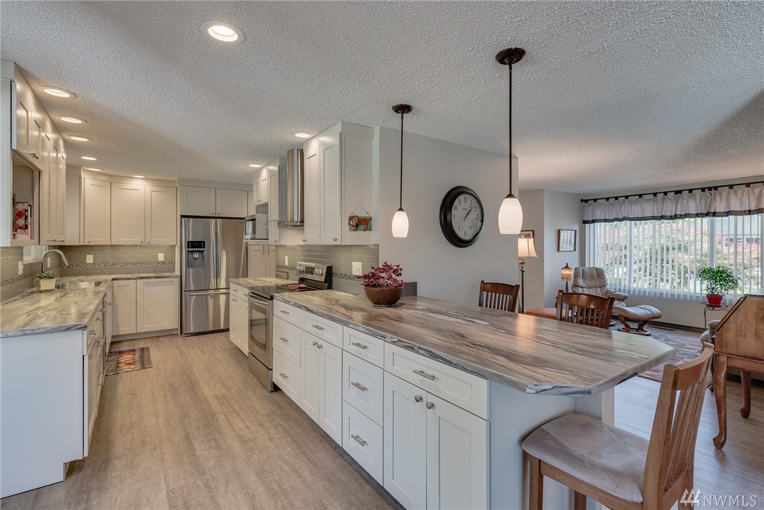 Surprises! Gorgeous new kitchen with all the "bells and whistles", new flooring, open floor plan & classy fireplace wall with built-in shelving. Delightful windowed dining room overlooks deck, green grass, tall trees & plenty of space to garden and play. *Extra parcel in back is included, RV parking behind off alley and lovely garden shed.