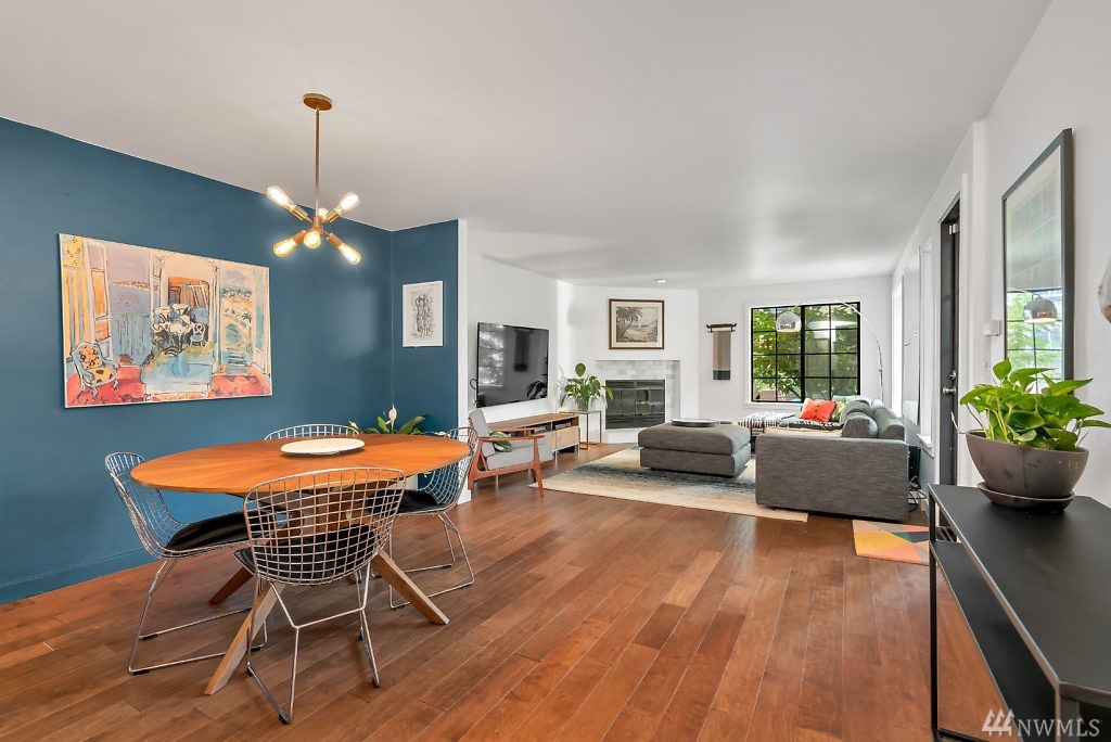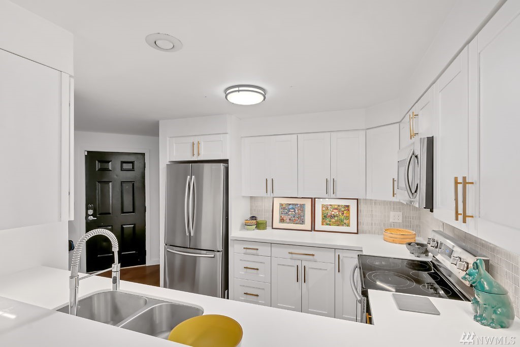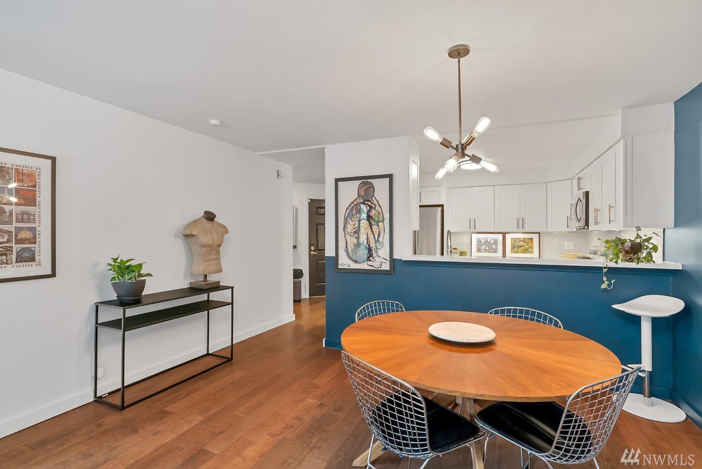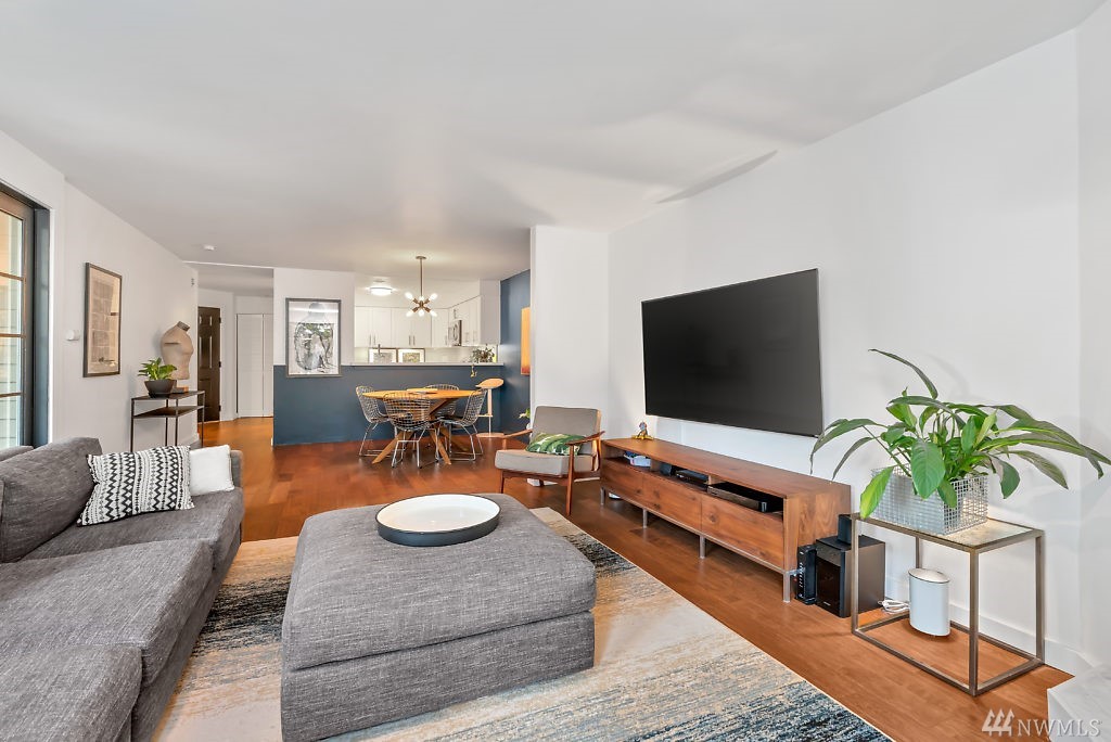 In the heart of Capitol Hill, this beautifully updated 2bd/2bt corner unit features custom modern finishes such as engineered hardwood floors & custom bathroom tiles & Quartz counter tops! Kitchen opens up to the living and dining room! Large living room with entry to big private deck. Views of the Beautiful maintained garden! Secured garage w/ 1 parking spot. Close to I-5, parks, transit lines, & downtown. The Corniche Has no pending assessments & impressive reserves!!