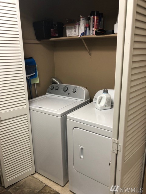 combo with sliding doors leading to a small patio with storage. Stainless steel appliances, double pane