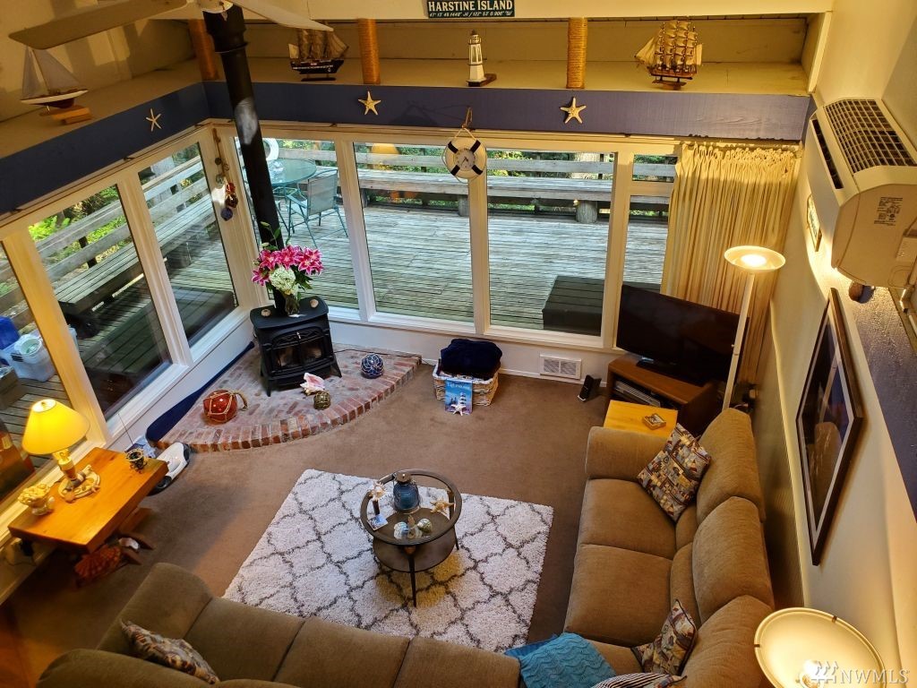 Rare 3-bedroom island house w/views of Mt Rainier over Case Inlet in Hartstene Pointe's gated community, on wide cul-de-sac next to beach trail. Living area w/two walls of new double pane windows overlook wooded wonderland & Puget Sound. Main w/one bedroom & 3/4 bath, loft has two bedrooms, full bath. Many upgrades & features. HP amenities: Miles of saltwater beaches & walking trails, pool, clubhouse, tennis/sport courts/fitness center, picnic/BBQ areas, marina/ramp, patrol & more.