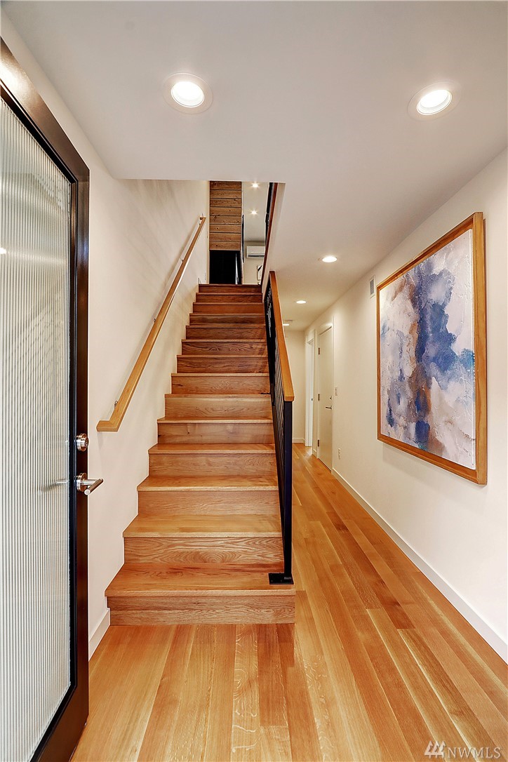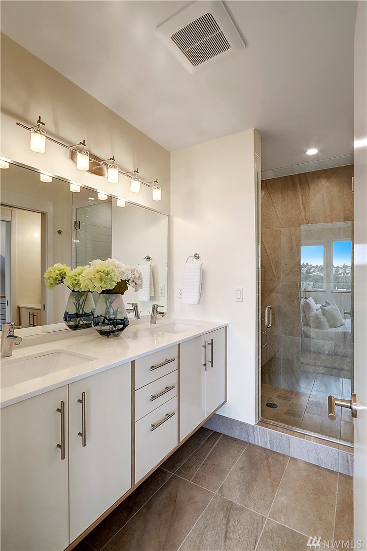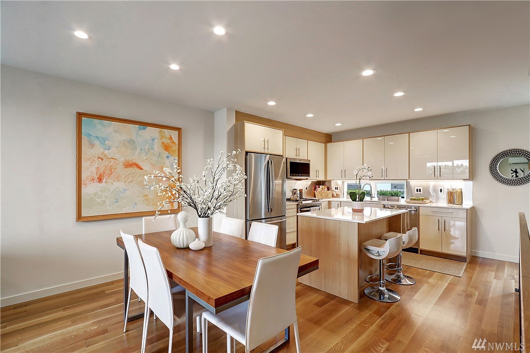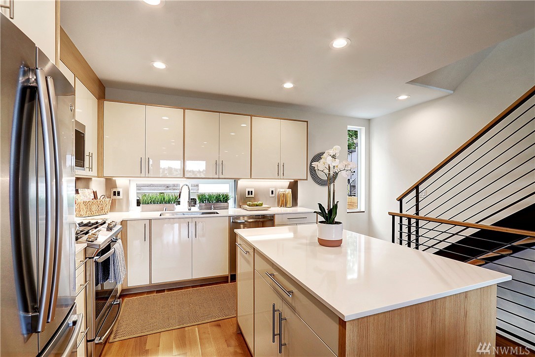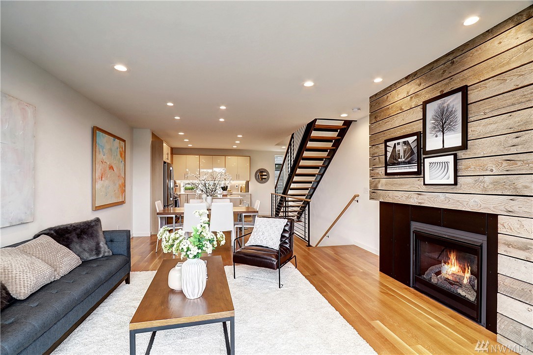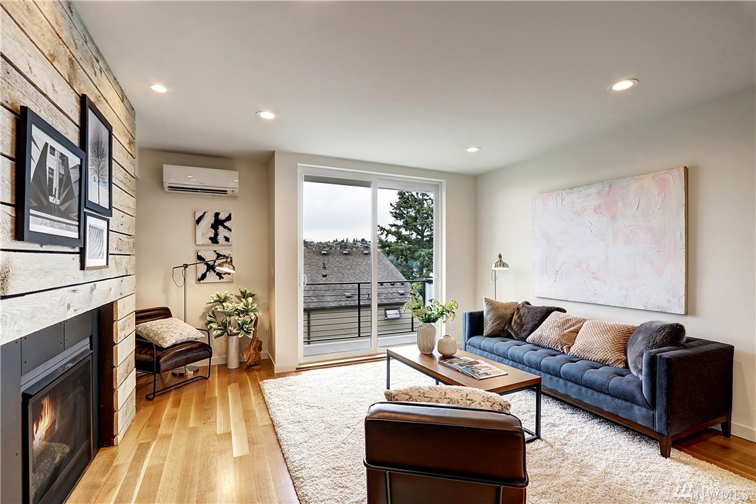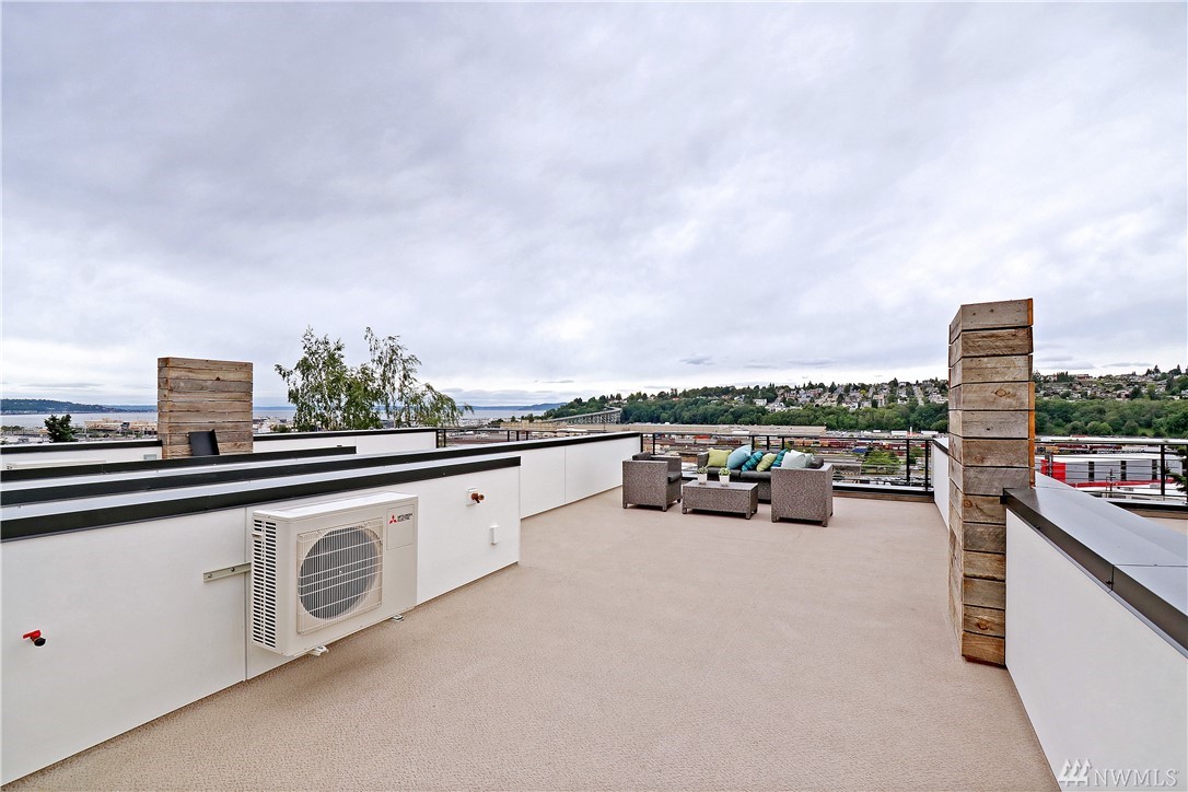 SW views of Alki & Olympic Mountains. Enjoy outdoor entertaining with gas, water & power service on your roof top terrace. Island kitchen, slab counters, stainless steel appliances. Hardwood floors throughout, chic design elements Tankless hot water heaters and ductless mini splits - high efficiency. Living rooms with steel wrapped gas fireplace. 3 beds, 1 3/4 baths. One car covered parking. Amazing location, make your commute to Expedia, Downtown, South Lake Union a breeze!