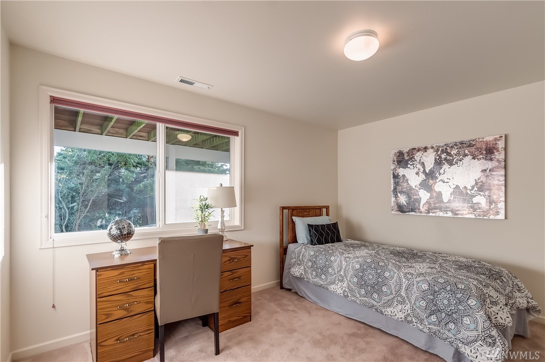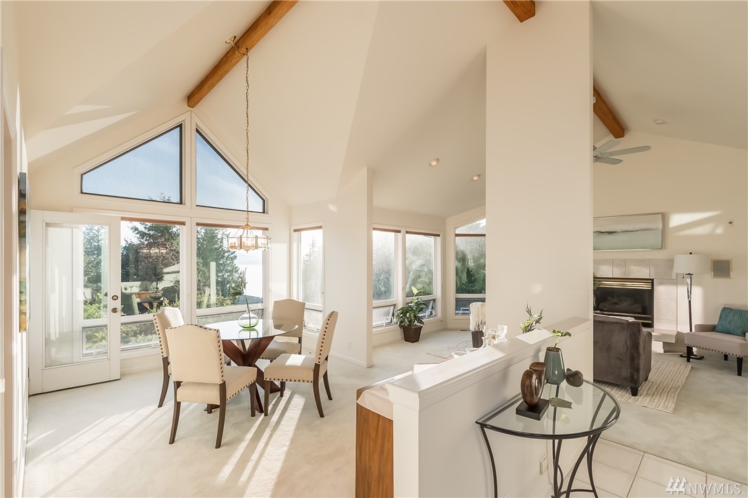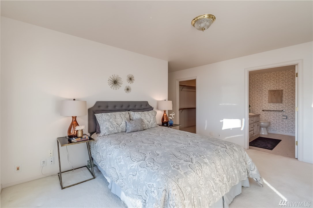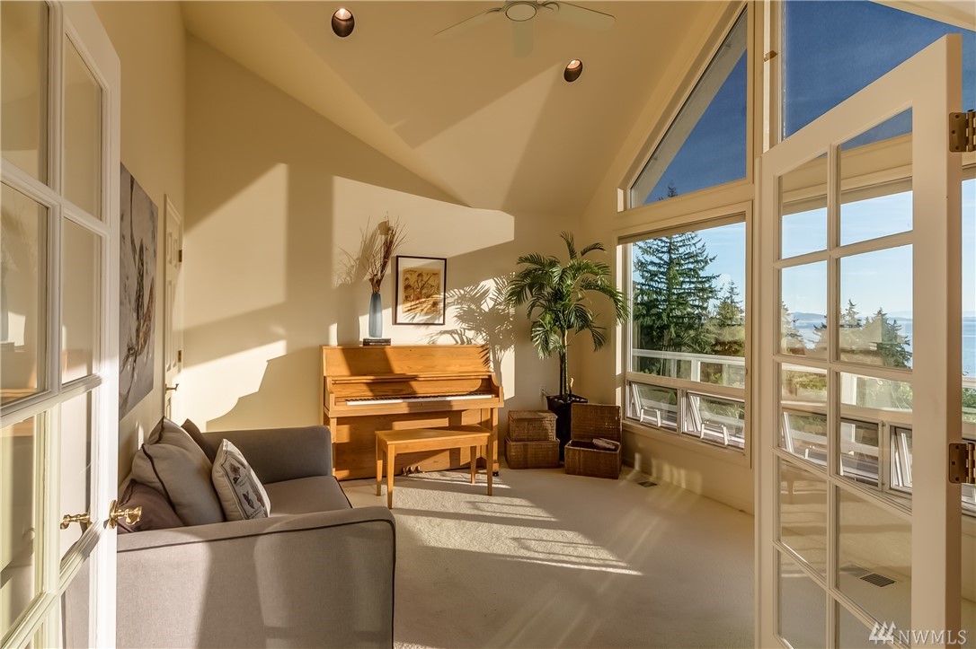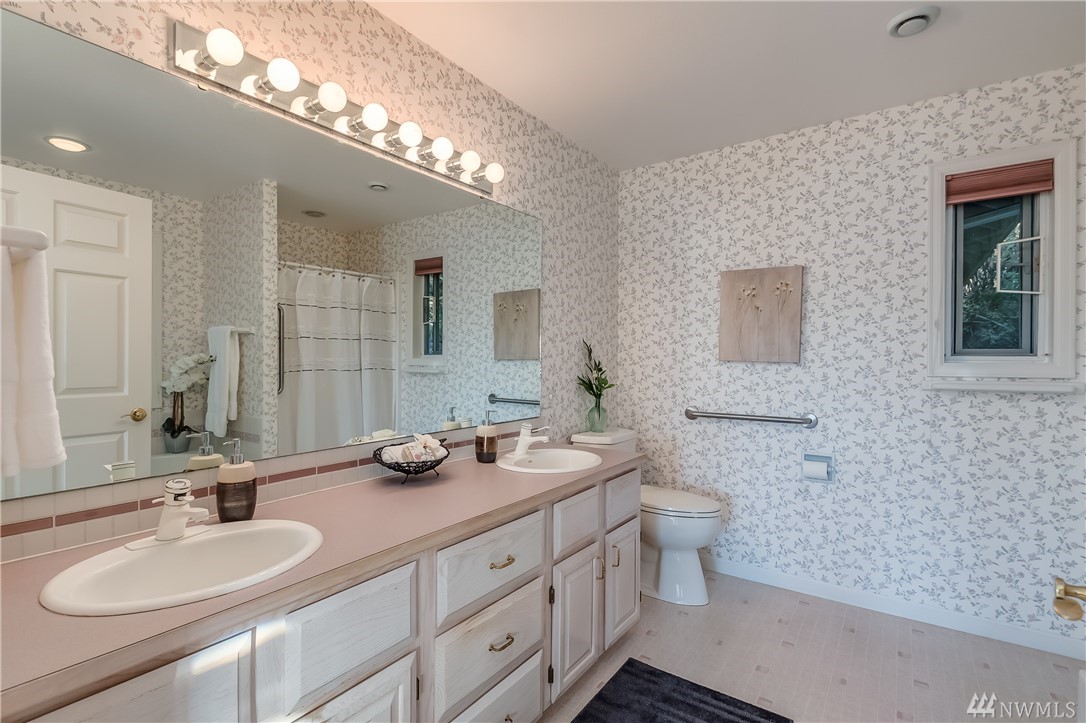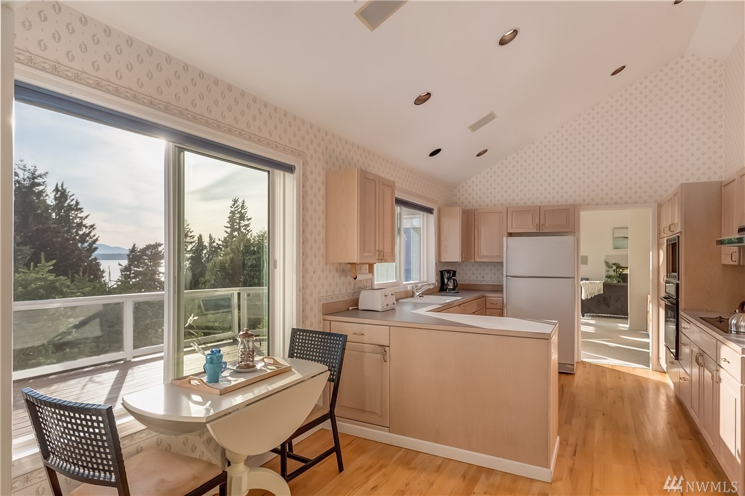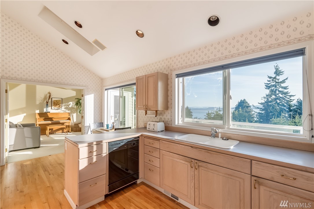 Stunning bay & island views from this contemporary home centered on a prime Edgemoor lot. Main floor living is fully accessible, with expansive west-facing deck. Situated for privacy, with space above and below for gardens. Plus: partially finished lower level with nearly 1,000 square feet ready to finish -- more bedrooms, rec/media room, mother-in-law suite, or lots of dry storage -- you decide! Central vac; 2018 high-efficiency furnace; built-in security; vaulted ceilings; double garage.
