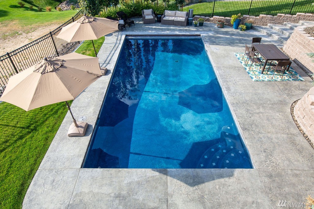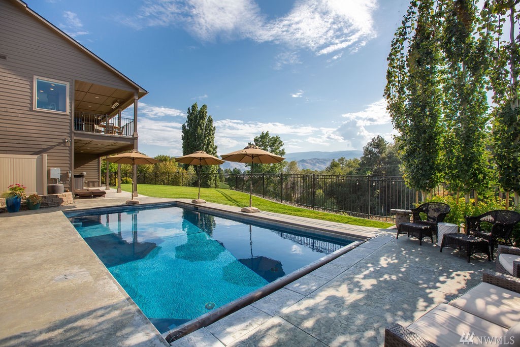 Welcome to this stunning 5 bed 4 bath daylight rambler. Entry features high ceilings and views of the mountains. Open Great Room with a gorgeous stacked stone fireplace. Chef's kitchen has granite counters, stainless appliances including double wall ovens and a large center island. Main floor Master Suite with walk-in shower, soaking tub, double vanities and huge walk-in closet. Second bedroom is located on the main floor with 3 additional bedrooms on the lower level. Gorgeous in-ground pool.