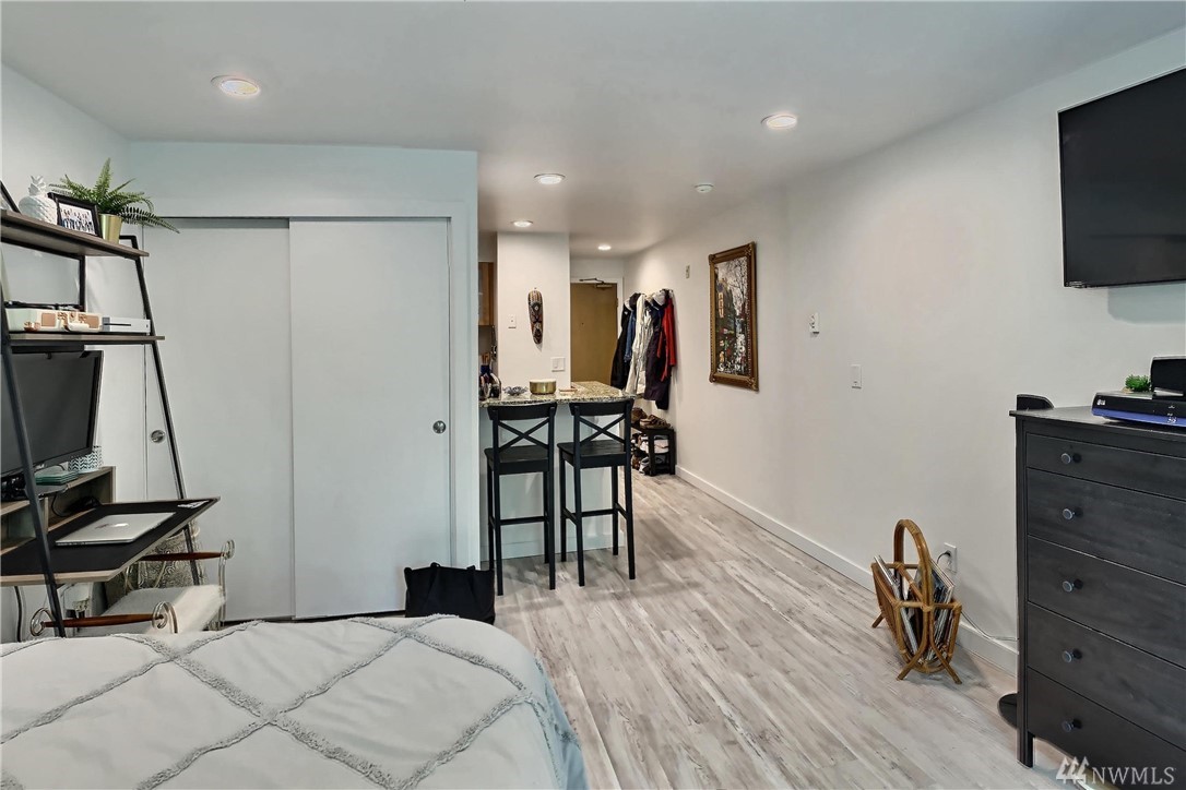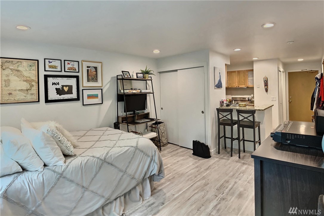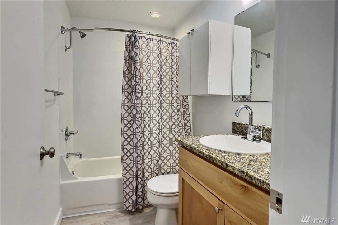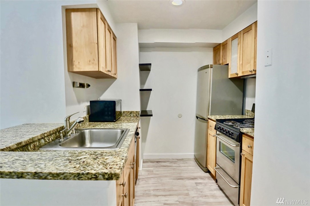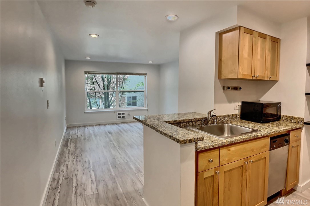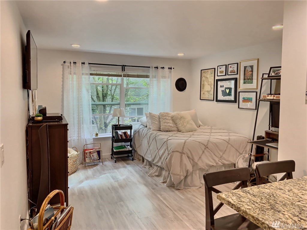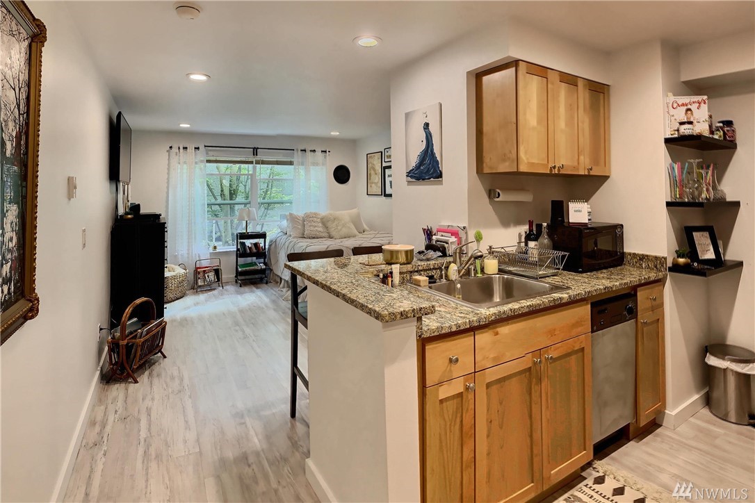 Adorable Phinney Ridge / Greenwood studio with parking! Totally move-in-ready; this small space lives large and sun-filled. Building remodel in 2006; granite countertops, new cabinets, stainless steel appliances and breakfast bar. New siding, windows in 2014. Refreshed this year with luxury plank floors (waterproof), fresh paint, and LED dimmable lighting. Space for bed + small sofa or consider a creative murphy bed - couch combo. Maintenance-free, convenient lifestyle surrounded by amenities!
