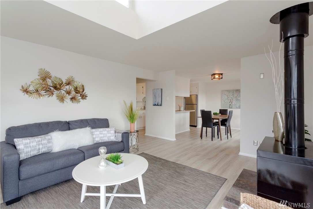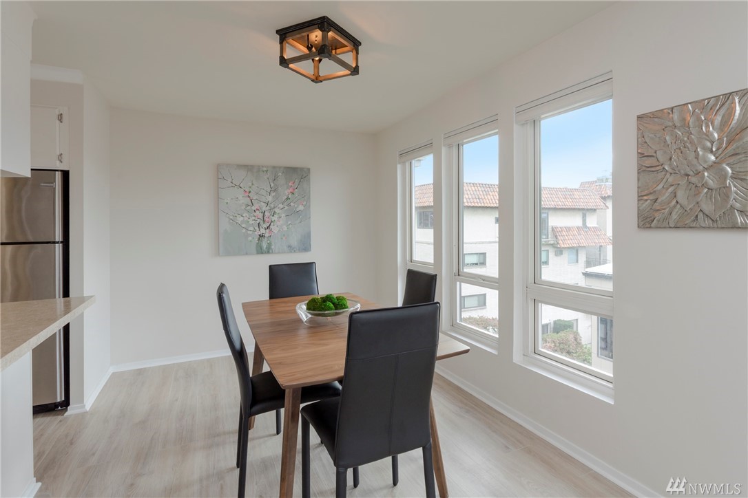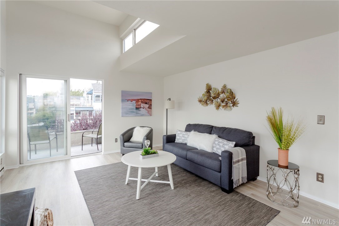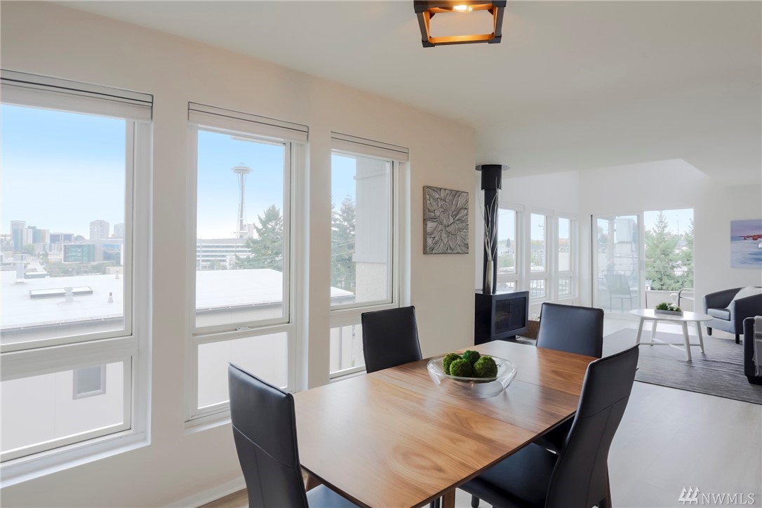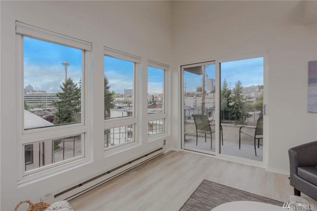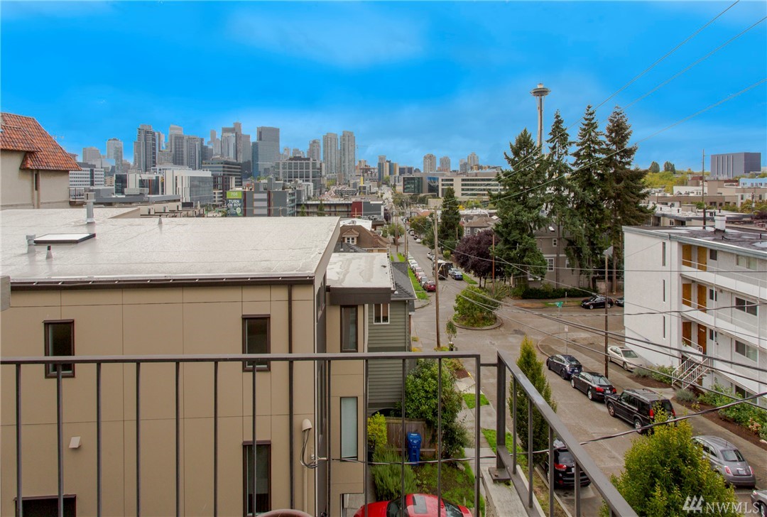 Top floor unit on a quiet street with the perfect Space Needle view throughout all living room and dinning room windows. Just 8 units with high owner occupancy rate. All stainless steel appliances and water heater (about 3 years old) to stay. Durable and easy to maintain premium laminate flooring and brand new window blinds. Tons of storage space. 20 foot ceiling in the living room. Building got a brand new roof this year with lifetime warranty. Walking distance to South Lake Union and Belltown.
