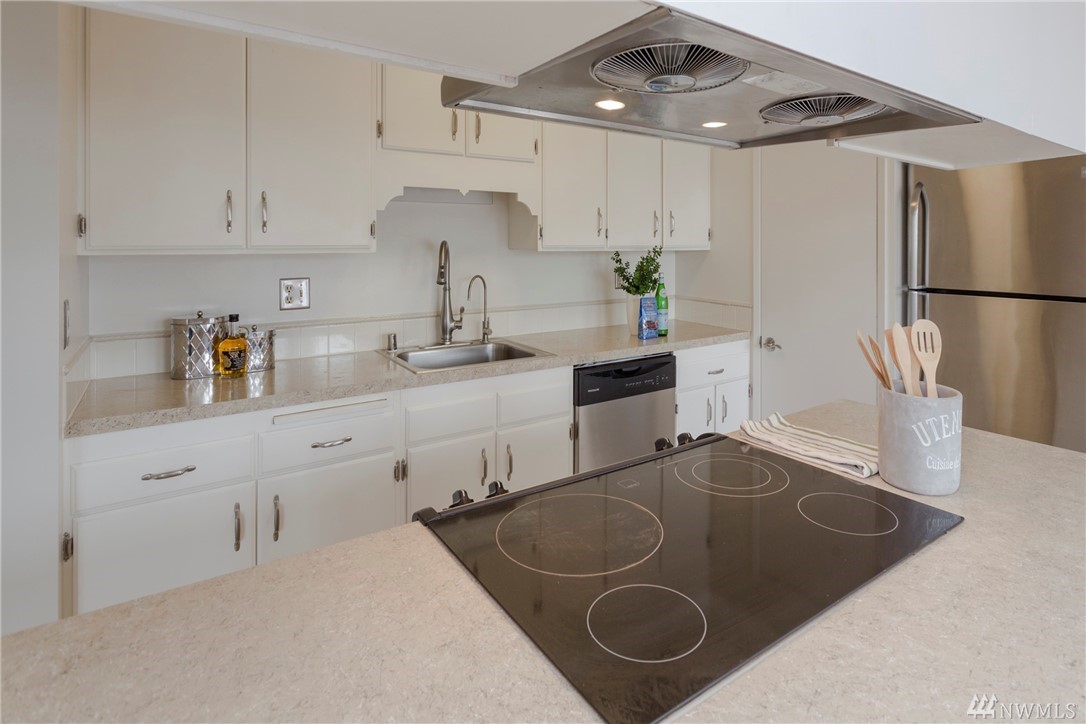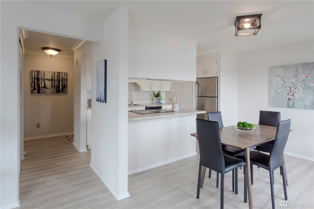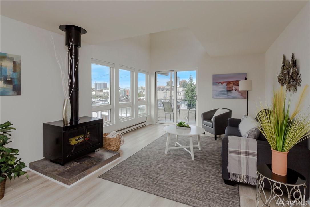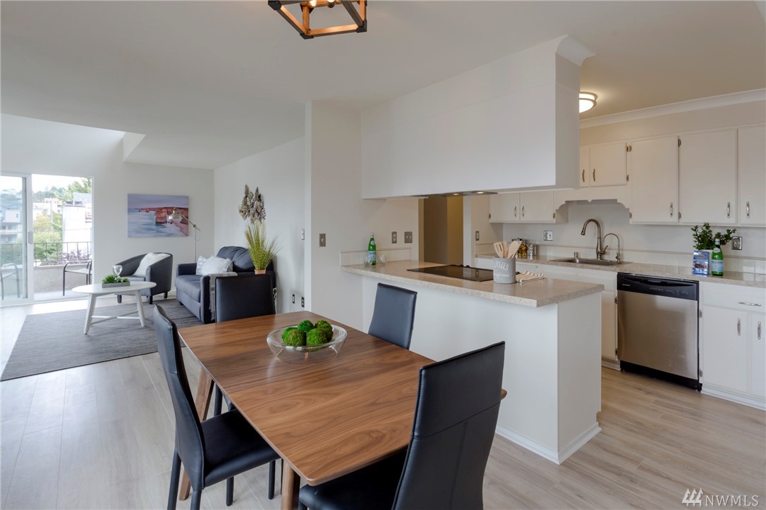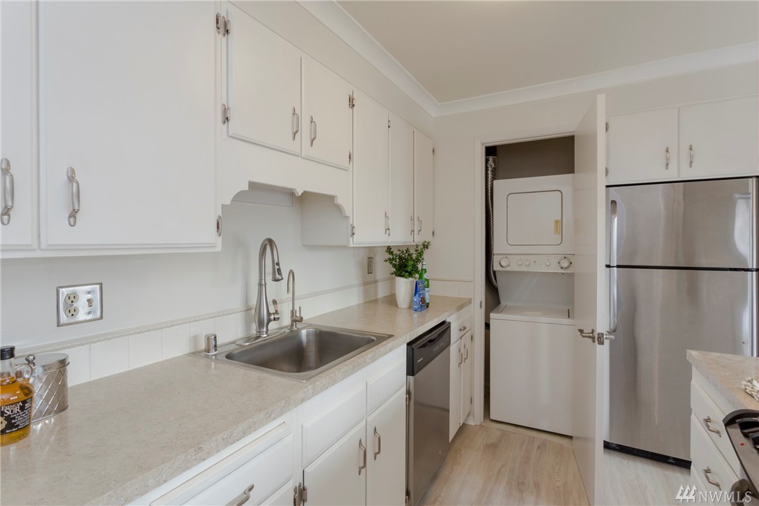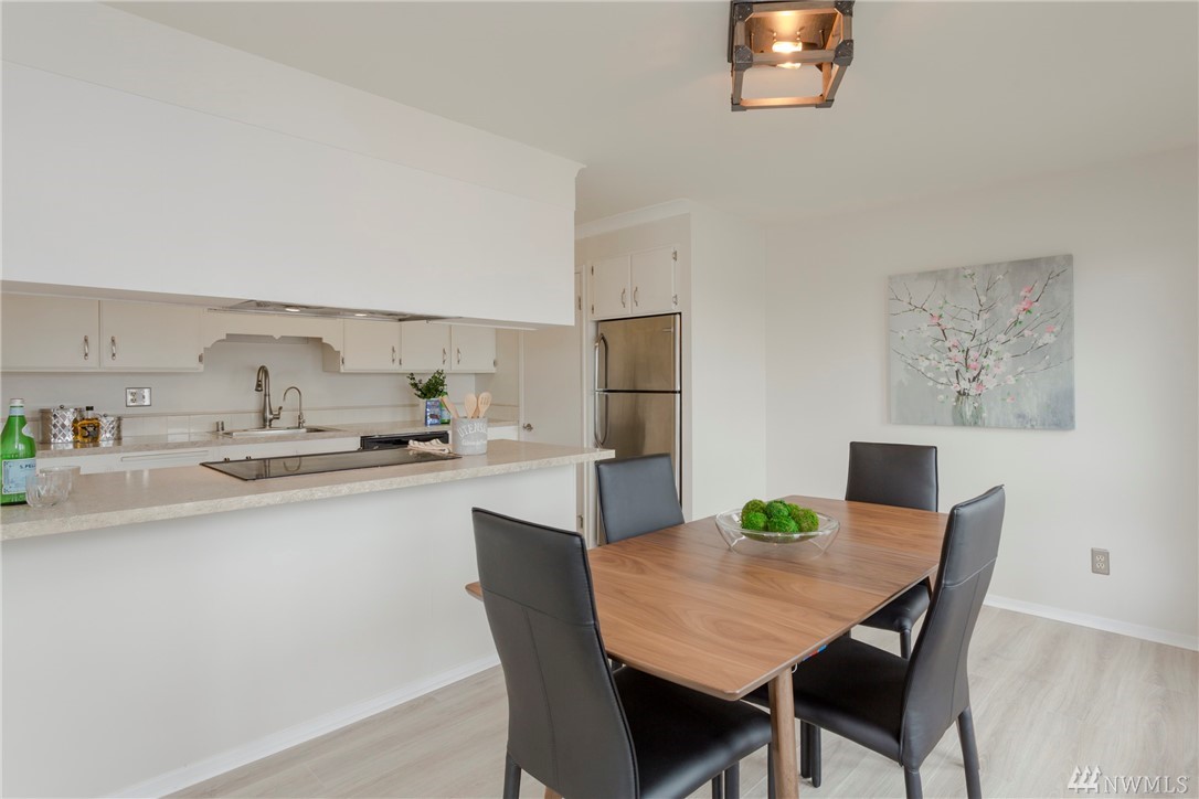 Top floor unit on a quiet street with the perfect Space Needle view throughout all living room and dinning room windows. Just 8 units with high owner occupancy rate. All stainless steel appliances and water heater (about 3 years old) to stay. Durable and easy to maintain premium laminate flooring and brand new window blinds. Tons of storage space. 20 foot ceiling in the living room. Building got a brand new roof this year with lifetime warranty. Walking distance to South Lake Union and Belltown.