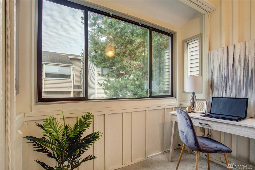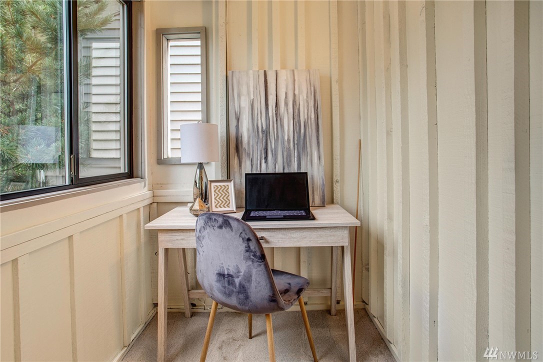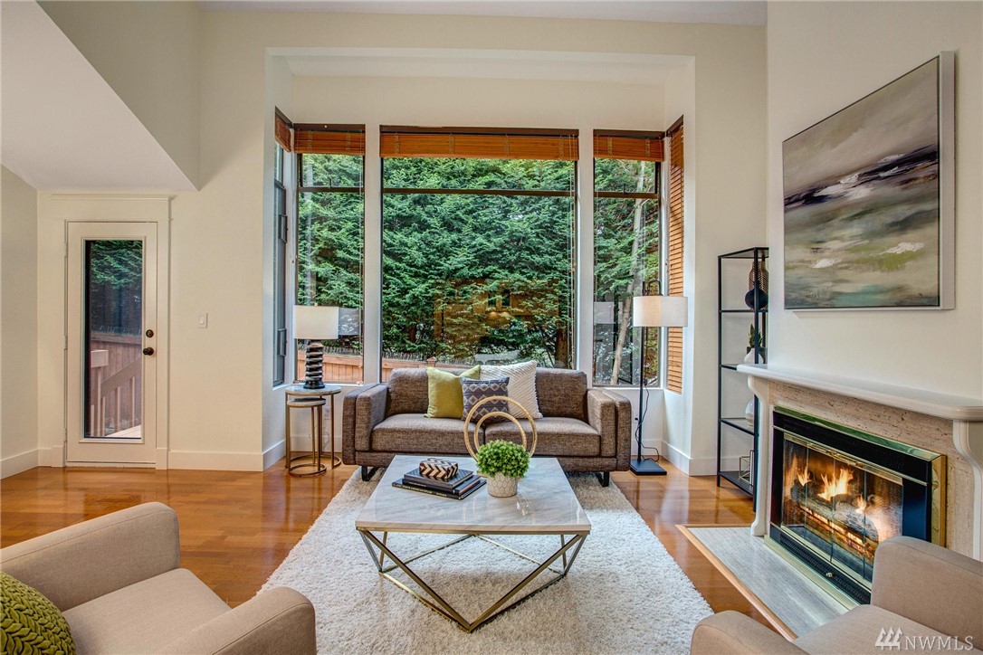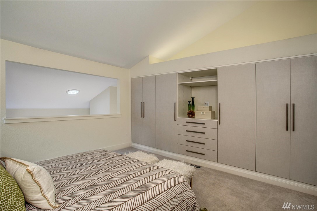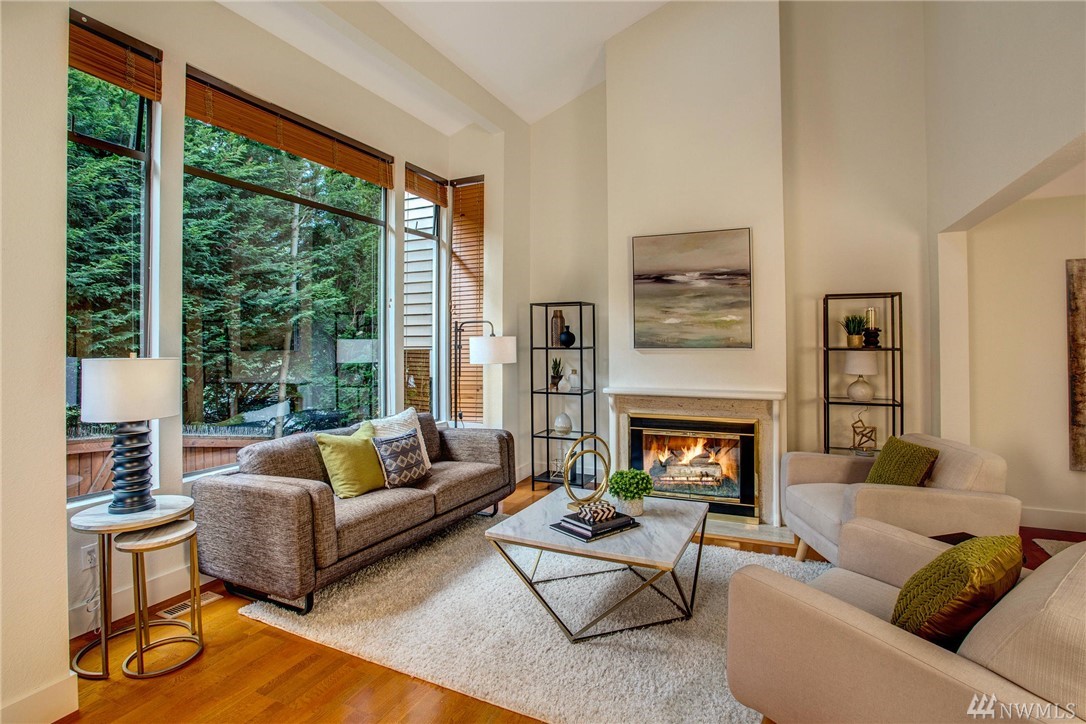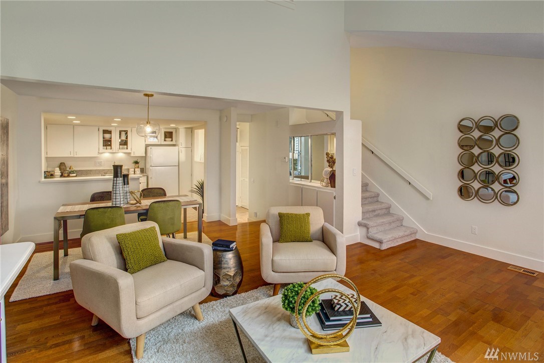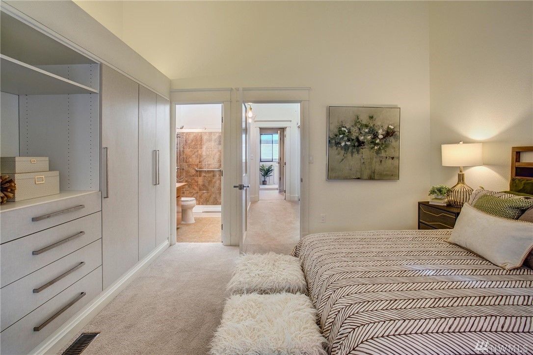 This two-bedroom with two 3/4 and one 1/2 bath townhome lives large at 1,374 asf on two levels. The entry opens to a spacious living room with high ceilings and bright windows. Uninterrupted sight lines from the kitchen to the private deck. Light and bright kitchen with white cabinets, nickel details, and white appliances. The master suite offers a soothing retreat. California Closets provide additional storage. Full-sized washer/dryer. Second bedroom with enclosed deck space. Two car garage.