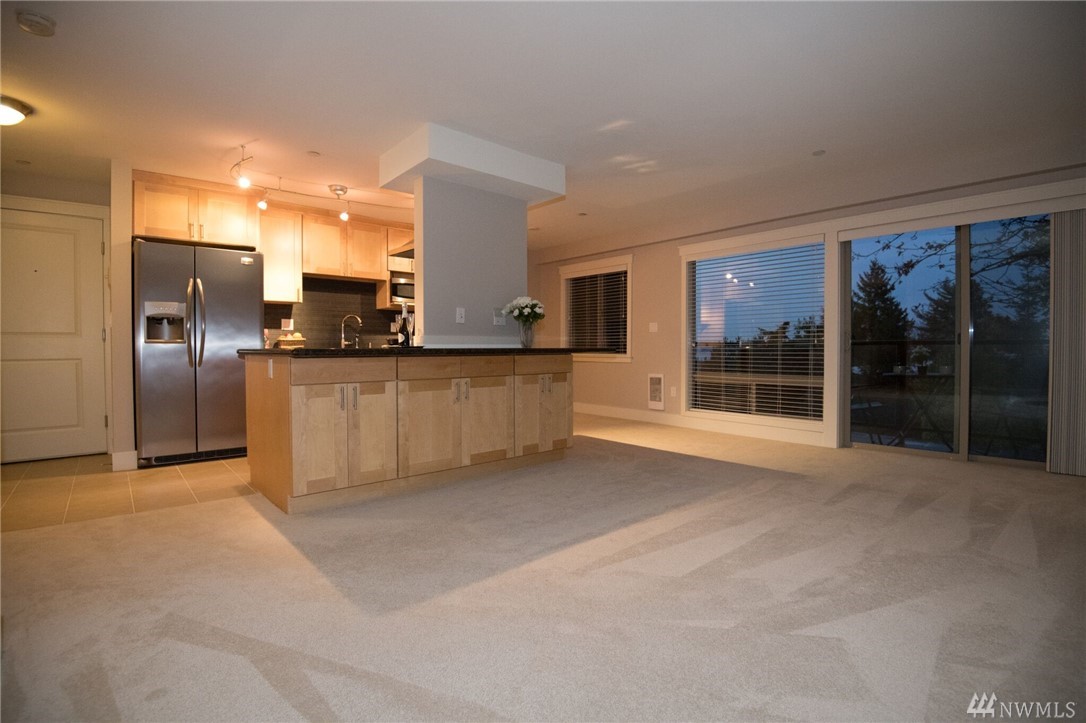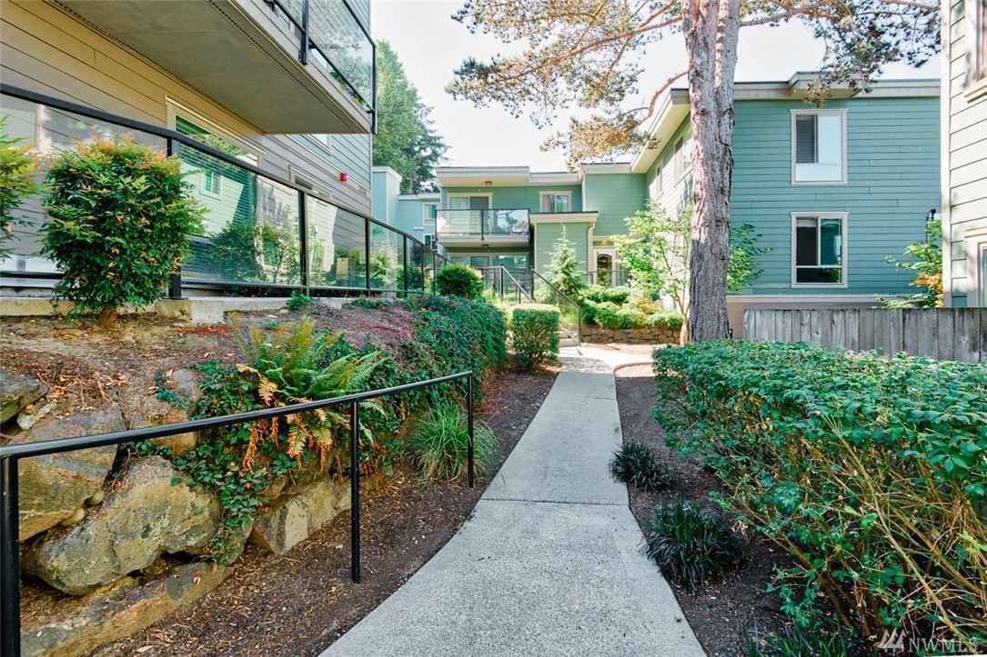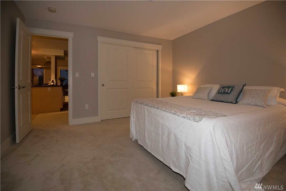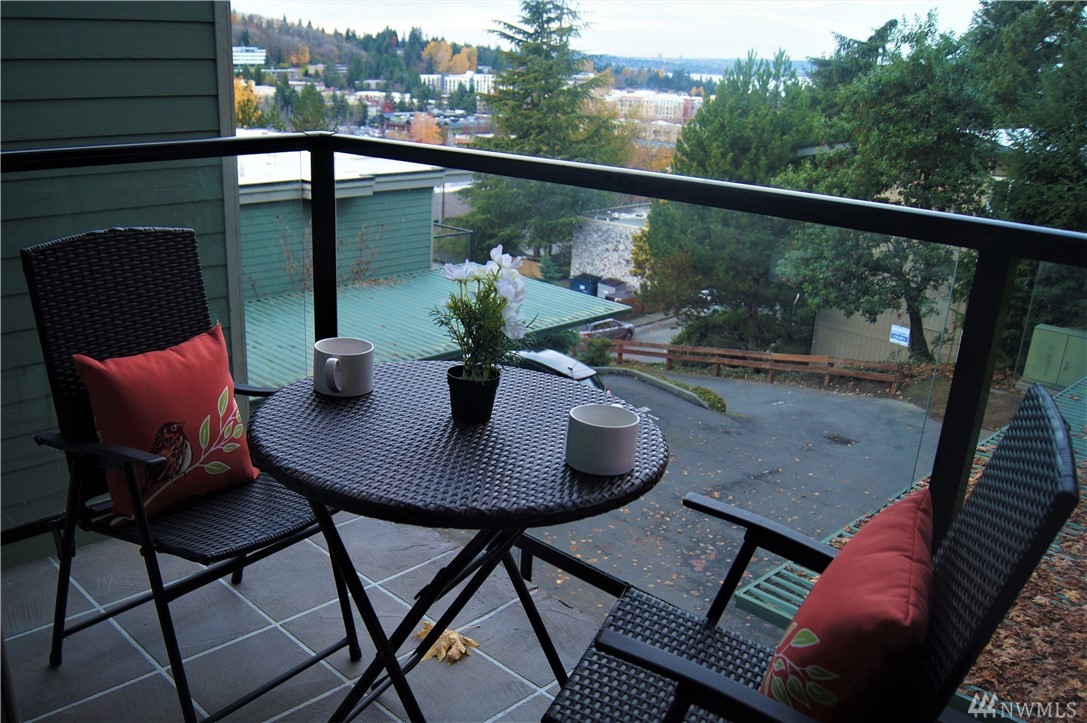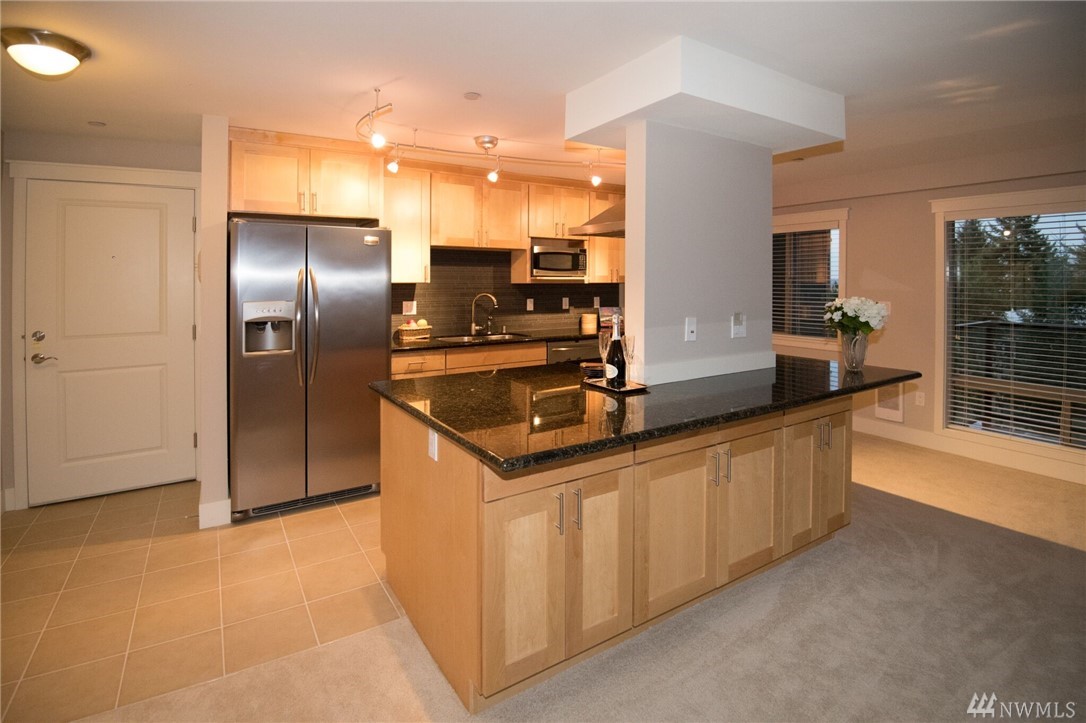 Live where you can walk to downtown shops, restaurants, the park-and-ride and future light rail. This stylish penthouse floor condo features slab granite counters, gorgeous shaker cabinetry, a gourmet kitchen with Frigidaire professional appliances and an expansive breakfast bar. The open concept living area includes a private deck with lake views. The bedroom has room for a king size bed. The interior is freshly painted with designer specified colors! Enjoy the community room, pool & sauna.