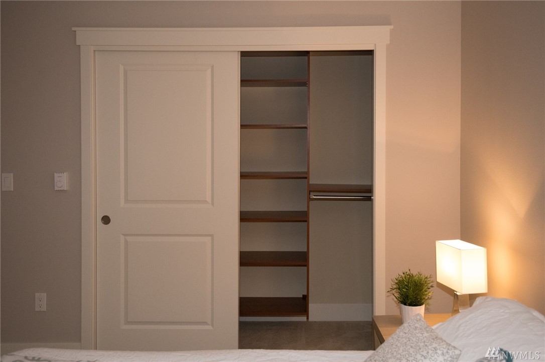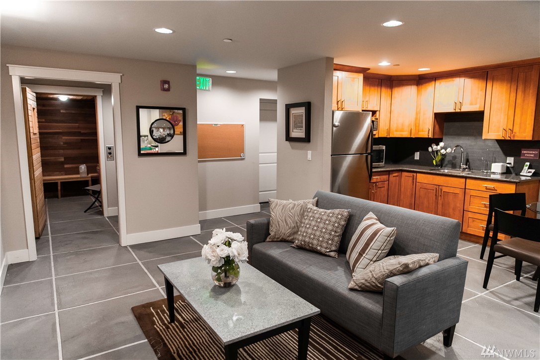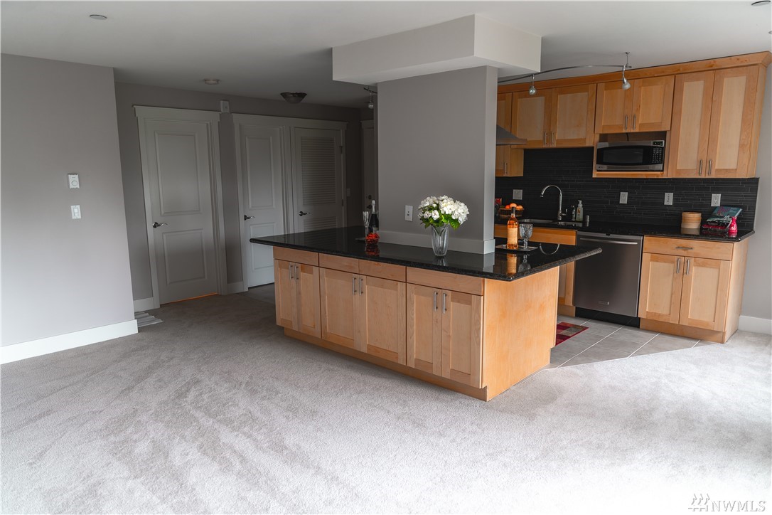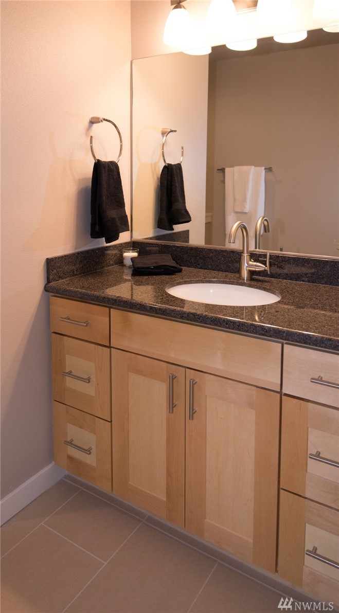 Live where you can walk to downtown shops, restaurants, the park-and-ride and future light rail. This stylish penthouse floor condo features slab granite counters, gorgeous shaker cabinetry, a gourmet kitchen with Frigidaire professional appliances and an expansive breakfast bar. The open concept living area includes a private deck with lake views. The bedroom has room for a king size bed. The interior is freshly painted with designer specified colors! Enjoy the community room, pool & sauna.