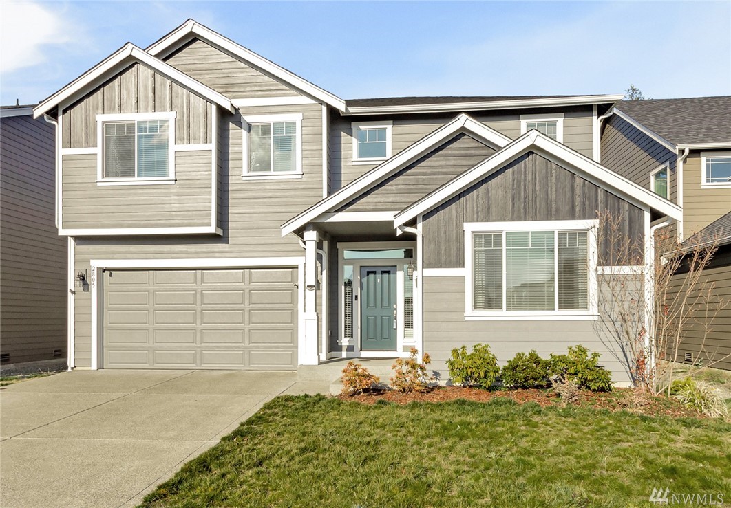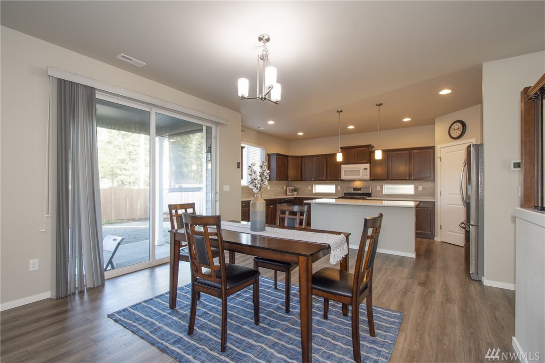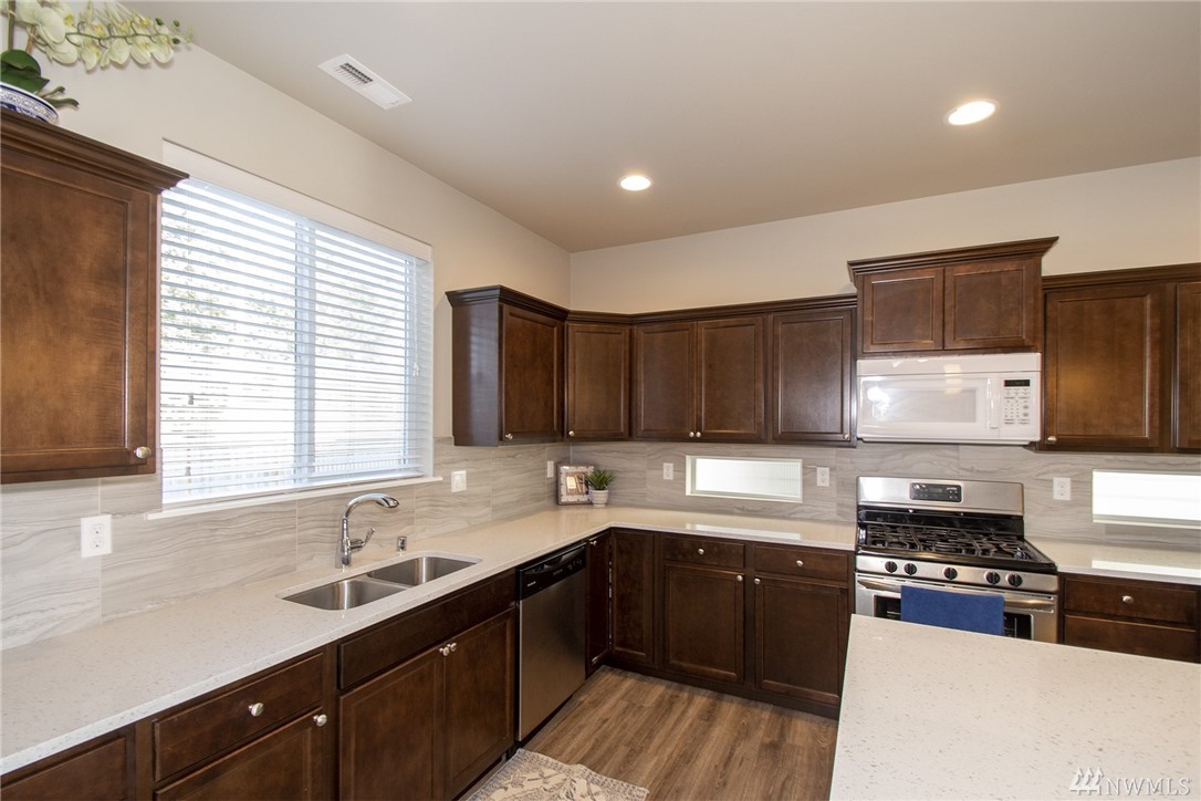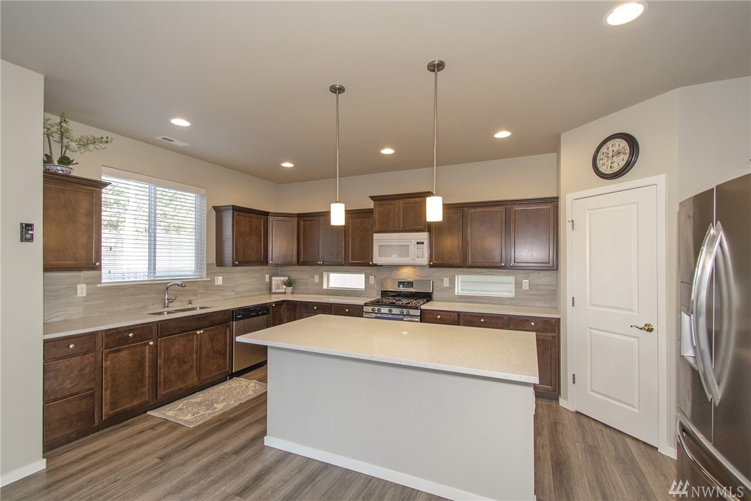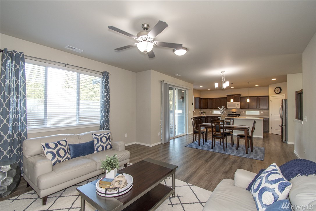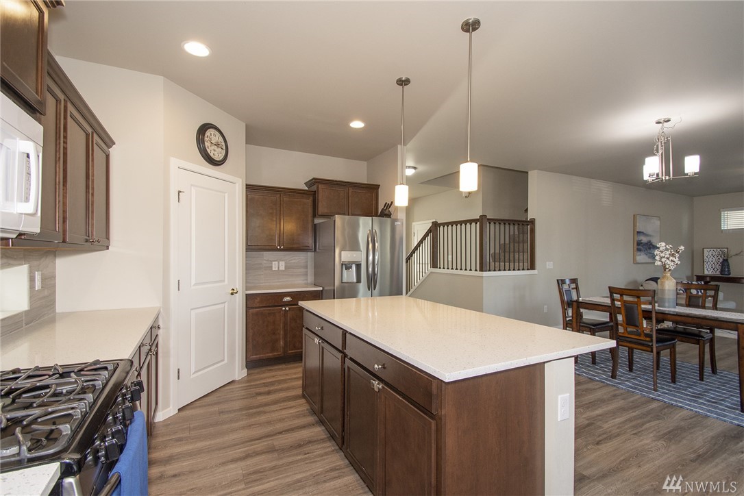 Gorgeous 4 bed 2.5 bath resale in newer Frederickson community! Walk in to find beautiful laminate hdwd flooring throughout main level. (scratch resistant!) Open concept family room w/eating area & spacious quartz countertop kitchen. Dining room, bedroom(or office)& 1/2 bath complete main level living. Upstairs leads you to master bed w/5 piece bath & walk in closet,2 additional bdrms,full bath,utility,& huge bonus room. 2 car garage,fenced yard, heat pump, close to shopping & JBLM. Won't last!