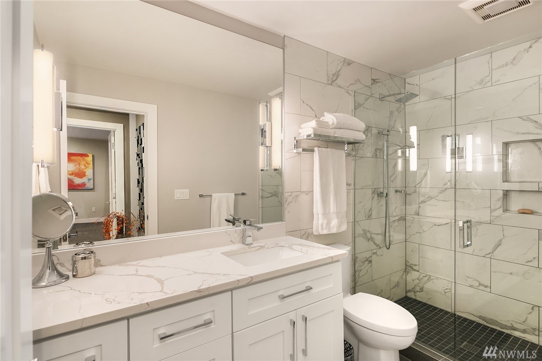 Stunning remodel with no detail overlooked, come see this gorgeous condo at Juanita Village! Grohe fixtures, Quartz counters with stylish backsplash, new Kitchen Aid Appliances, SHAW carpet w/ 10 lbs pad, LVT flooring, Custom Cabinetry, LED interior lighting, USB outlets in kitchen & bedroom, custom closets, marble floors in bath.Very impressive! 2 blocks to Juanita Beach Park, close to shopping, restaurants and downtown Kirkland. Healthy HOA, plenty of guest parking & no rental cap. This is it!