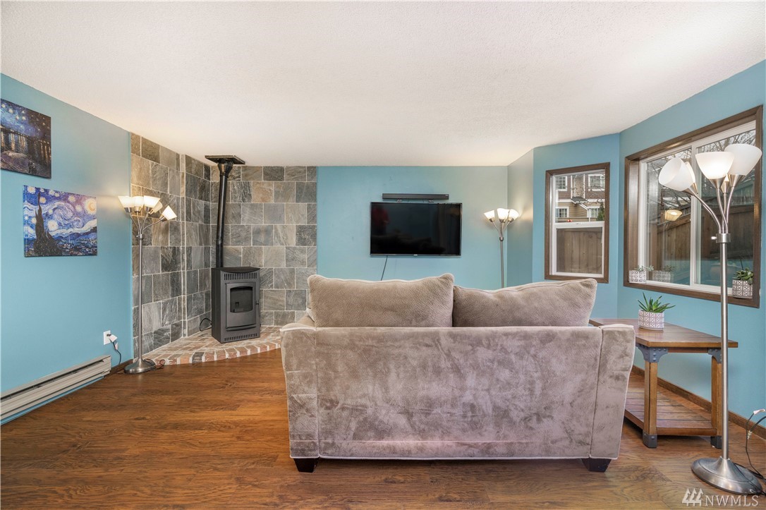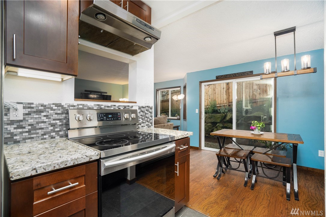 MUST SEE two story move in ready townhouse in fantastic location. Blocks to express bus to downtown, transit center, park & ride, Costco, shops, and future light rail! So many features to mention: Remodeled house with updated kitchen w/granite counters & stainless appliances, laminate wood floors, updated bathrooms, smart home system, newer windows. Private patio/yard and 2 parking spots. Amazing Shoreline school district. Strong HOA. Dues cover water/sewer, garbage and earthquake insurance.