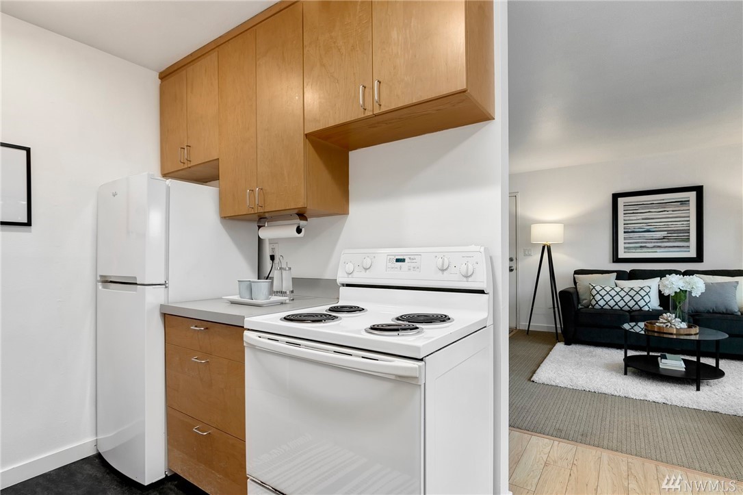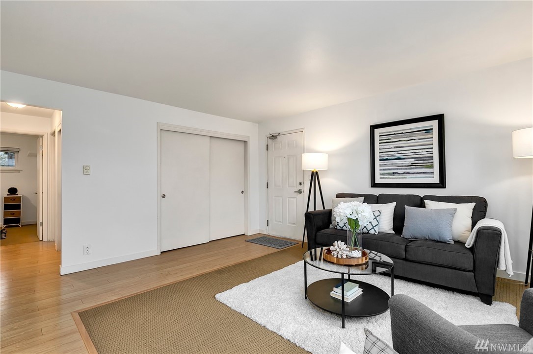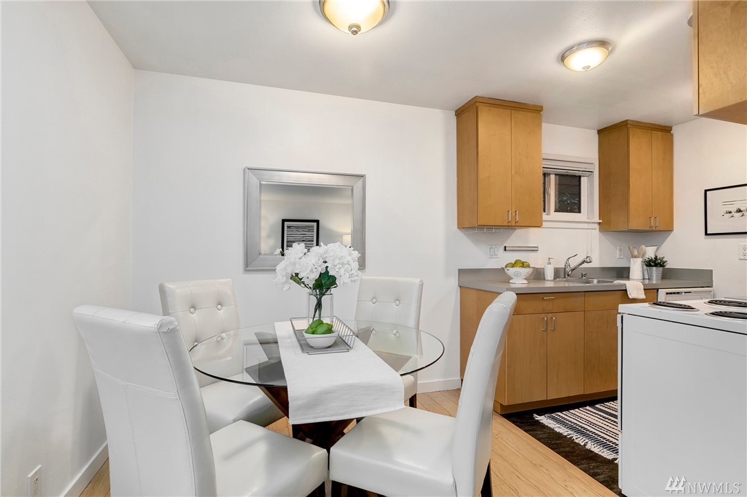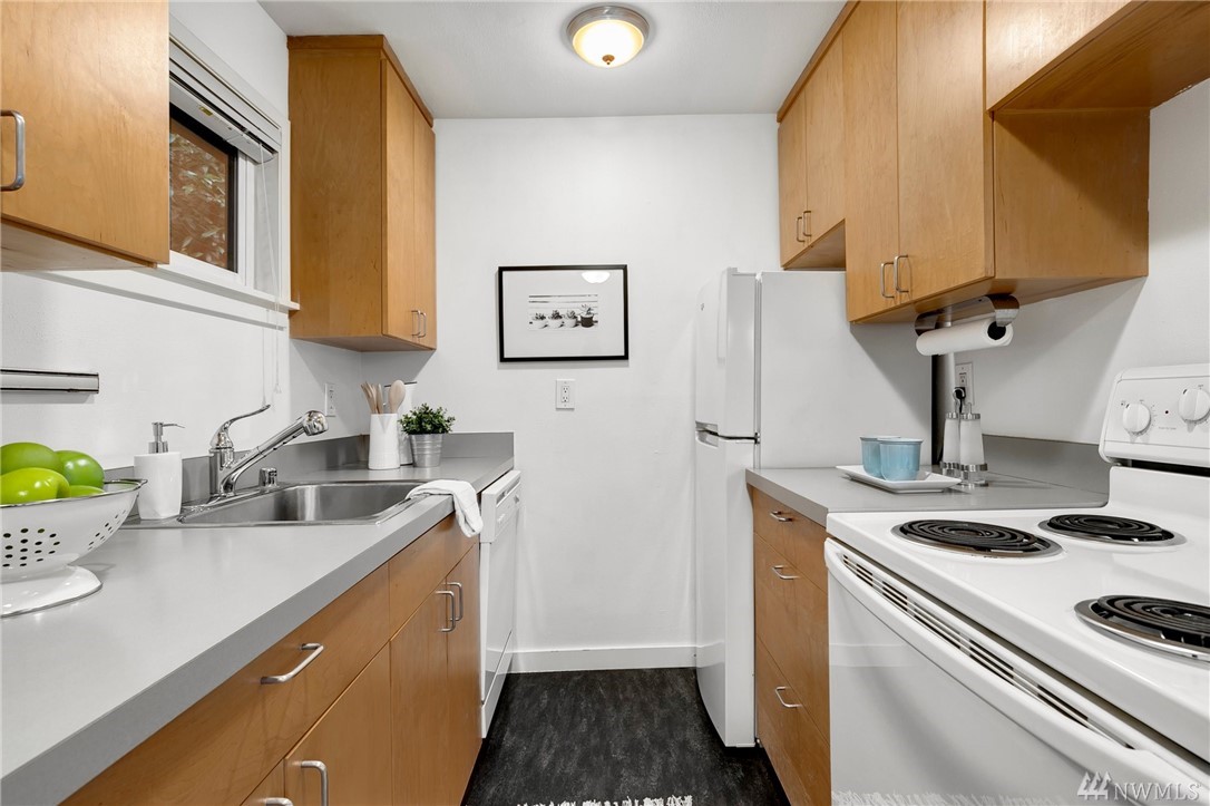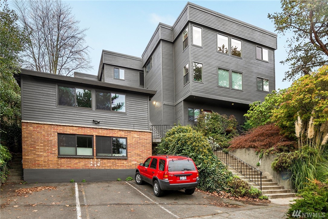 Rare opportunity at Sage Condos: top-floor 2-bedroom unit in ideal location on the cusp of Fremont + Wallingford near shops, restaurants, parks, public transportation + easy commute to downtown, BG trail, SLU & UW. Spacious living room with large windows flows into dining room and kitchen. This move-in ready unit boasts freshly painted interior, new water heater, in-unit laundry hookups + free shared laundry room. Convenient dedicated parking spot right out front. Well-managed HOA with low dues!