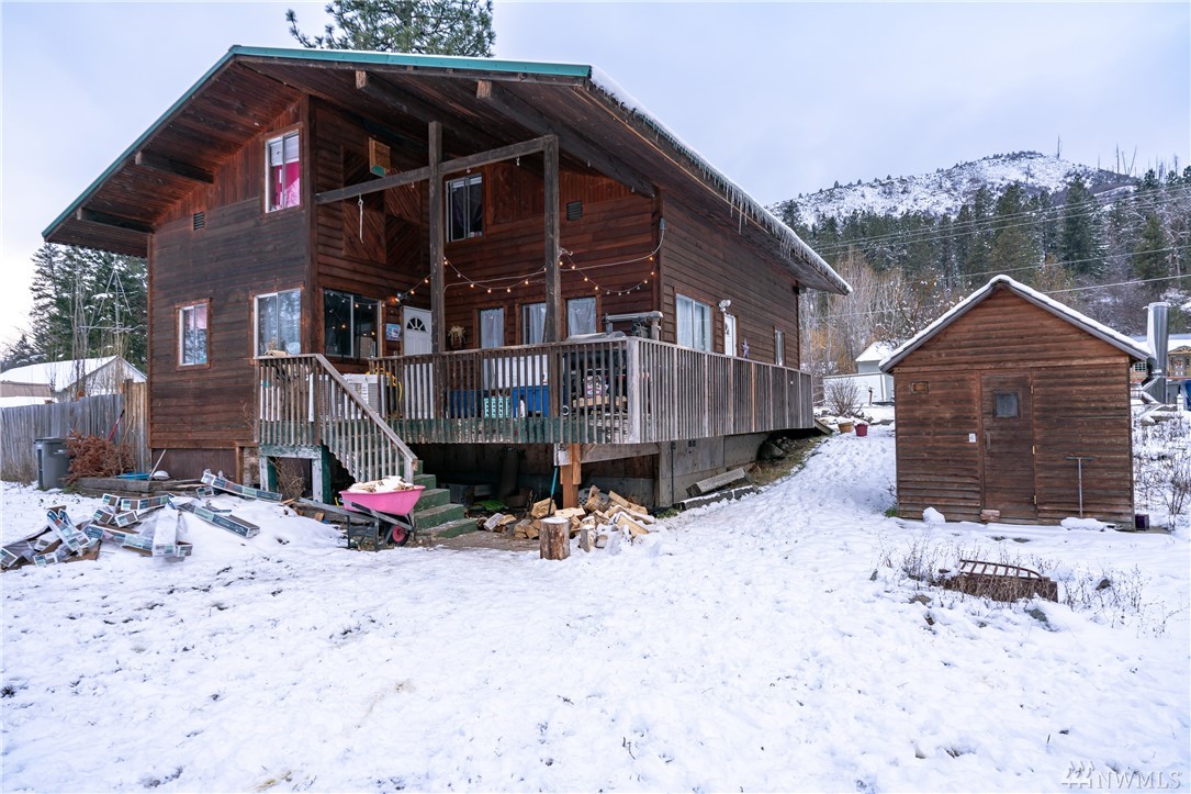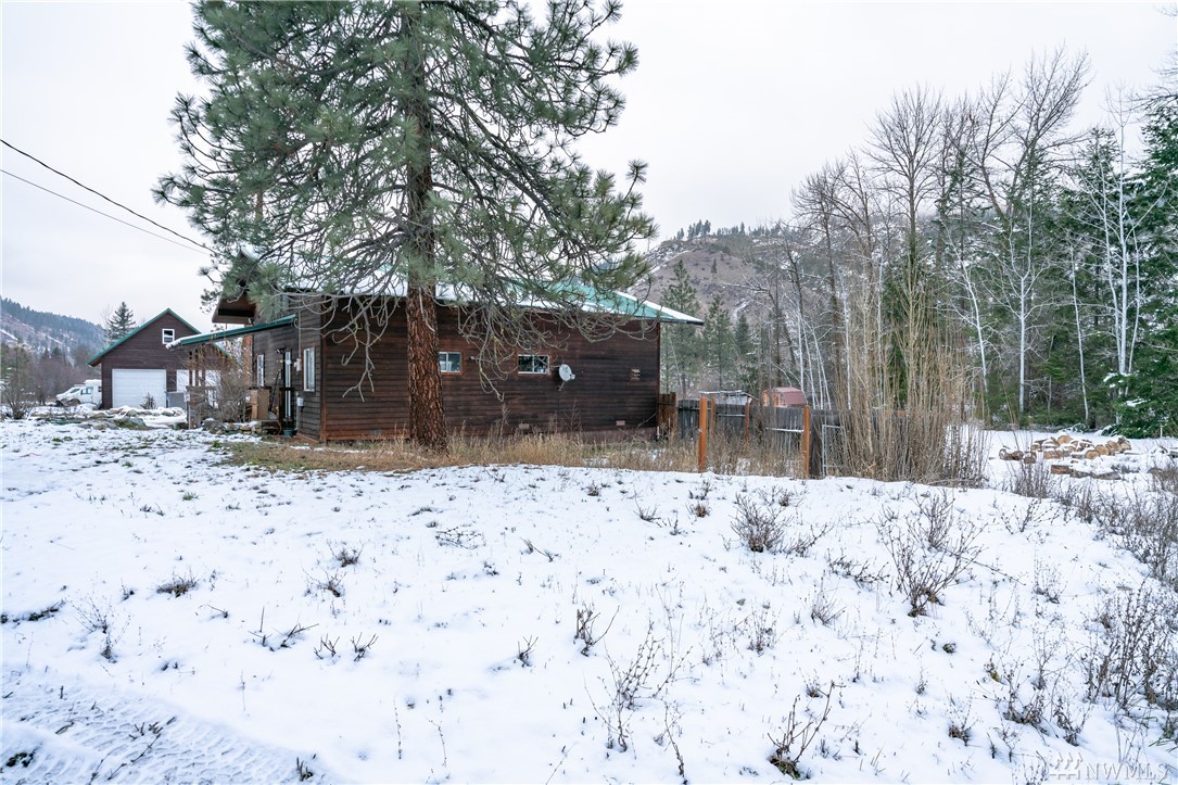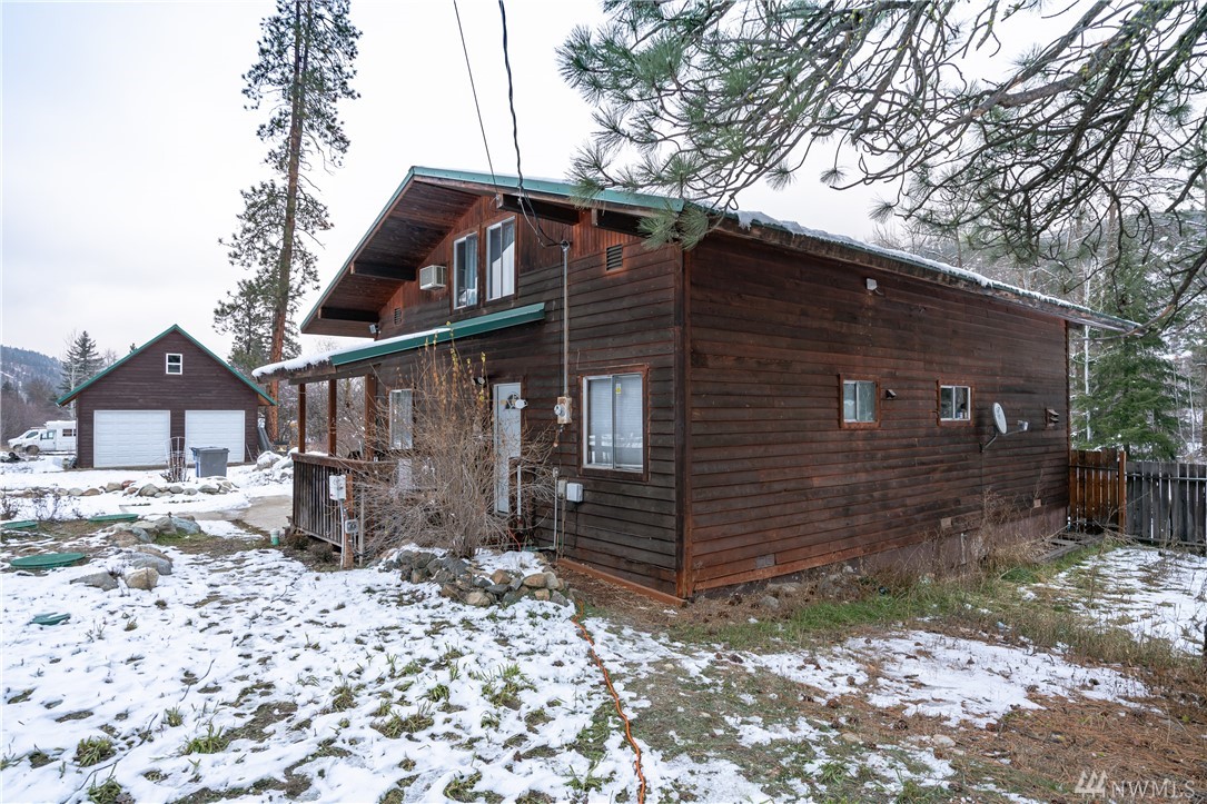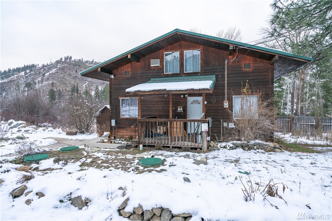 Creekside mountain home on 1.79 acres in the Peshastin Foot Hills. Warm welcome from wood-burning stove w/ brick accent in living room. Great separation of space w/ 2 bdrms on main and 2 bdrms above. Detached 2 car garage/shop offers plenty of room for toys and projects. Space above garage could be converted into apartment w/ income potential. Creekside portion of plat is across street. Large, level yard w/ mature landscaping makes for private entertaining, relaxing, gardening, and playing.