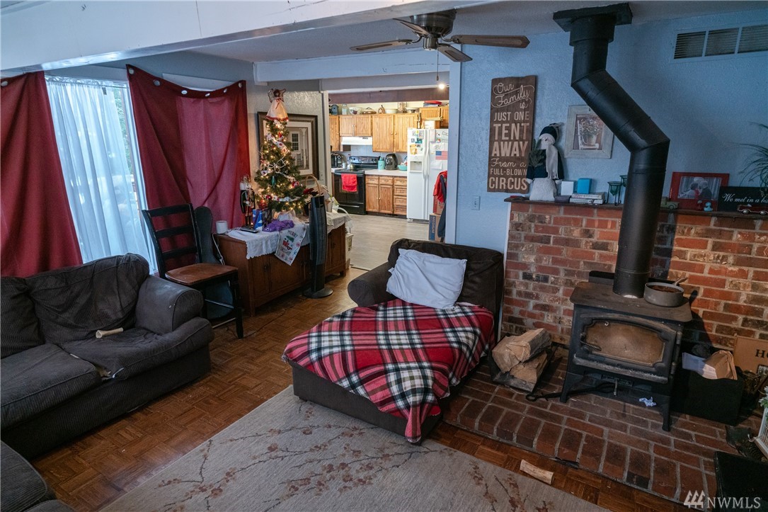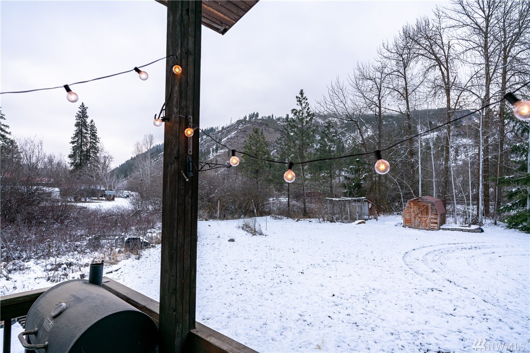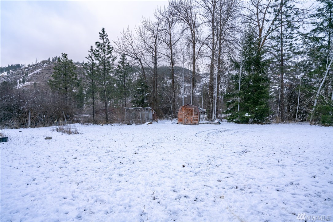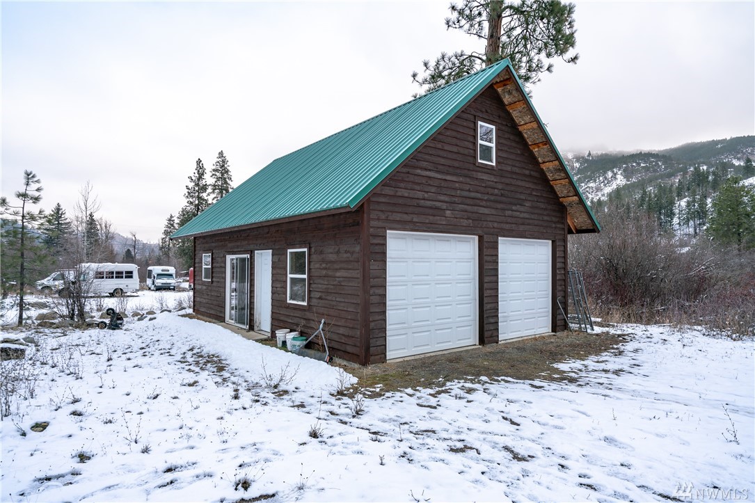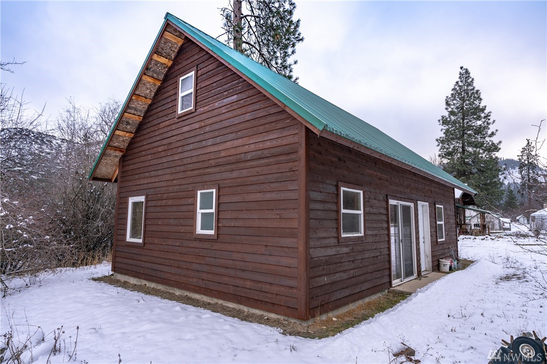 Creekside mountain home on 1.79 acres in the Peshastin Foot Hills. Warm welcome from wood-burning stove w/ brick accent in living room. Great separation of space w/ 2 bdrms on main and 2 bdrms above. Detached 2 car garage/shop offers plenty of room for toys and projects. Space above garage could be converted into apartment w/ income potential. Creekside portion of plat is across street. Large, level yard w/ mature landscaping makes for private entertaining, relaxing, gardening, and playing.