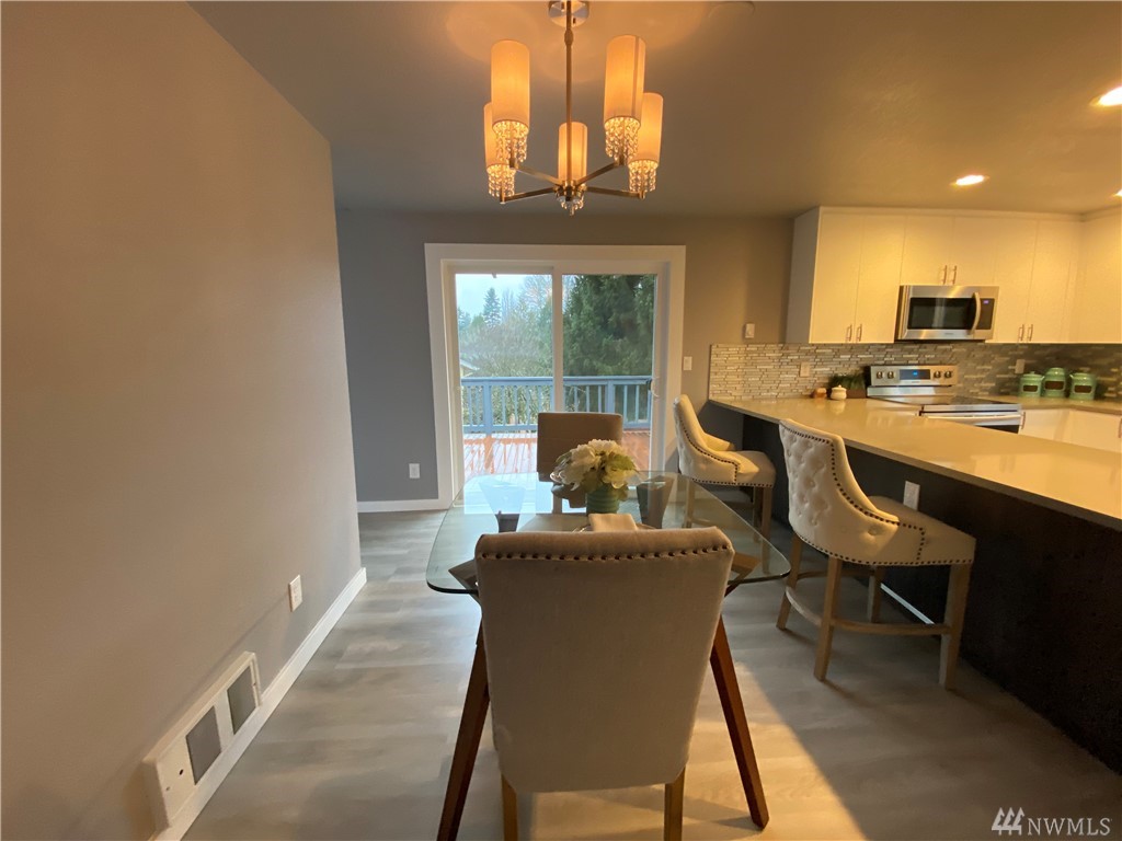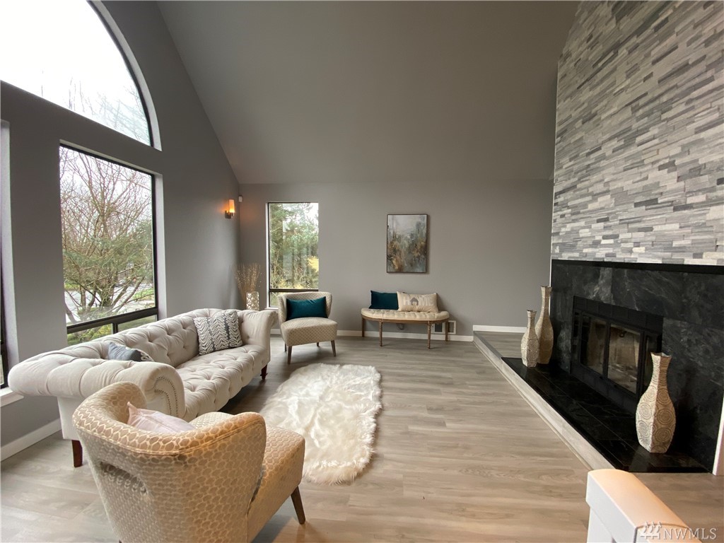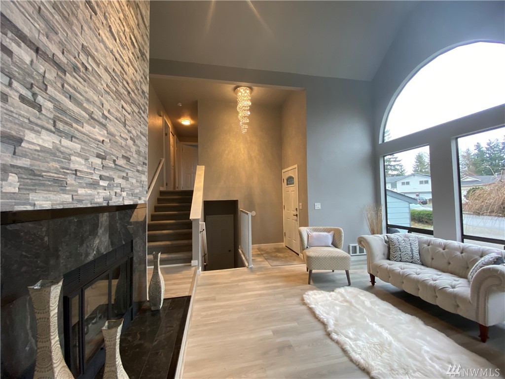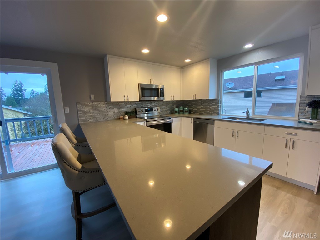 Welcome home to this modernized estate in Kent East Hill. Completely remodeled 3 spacious bdrms, 2 w/ walk-in closest. 2 beautifully upgraded baths, plus extremely functional 1/2 bath in garage, equipped w/ shower capabilities. Fresh interior & exterior paint, elegant finishes, dimming chandelier, custom stack stone fireplace, new flooring throughout, sleek upgraded kitchen w/ tile backsplash, quartz countertops, soft close cabinets, extended island, SS appliances with adjoining dining area.