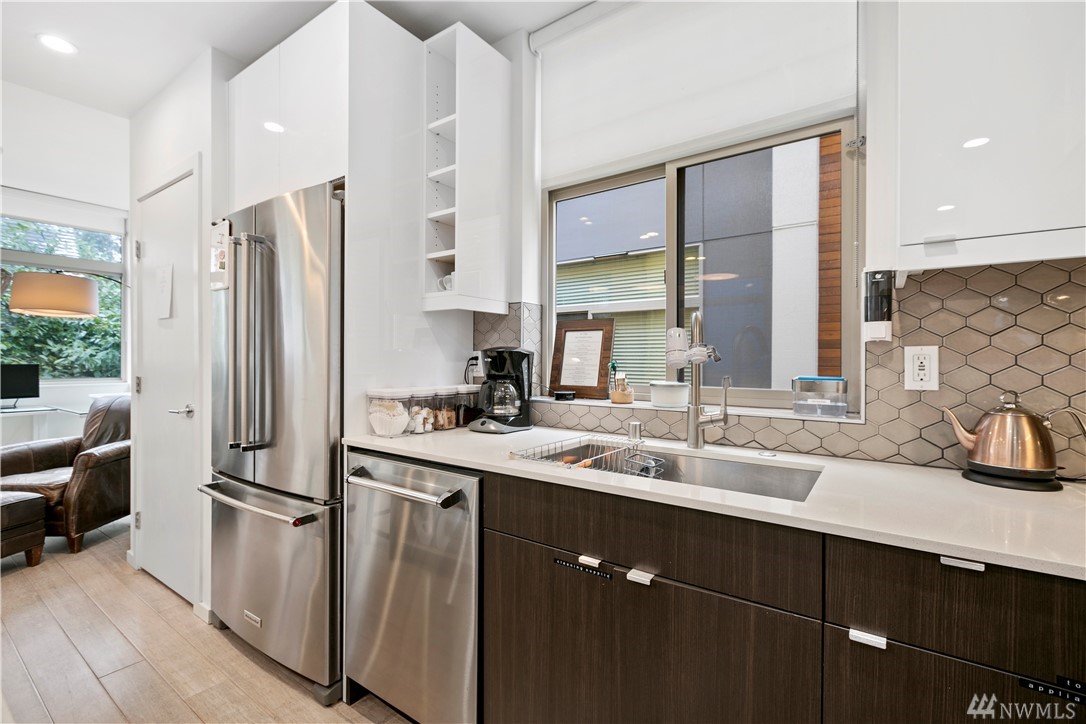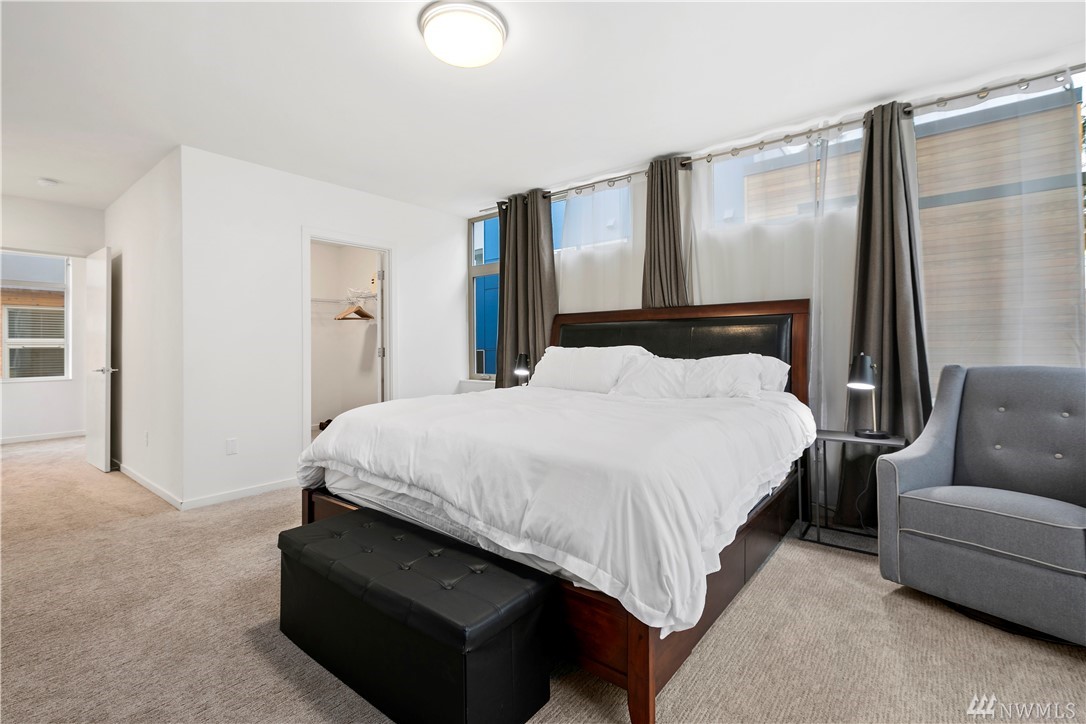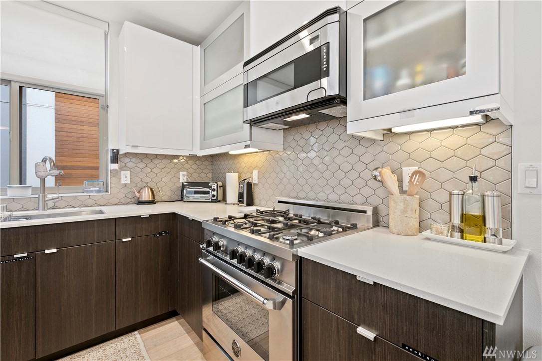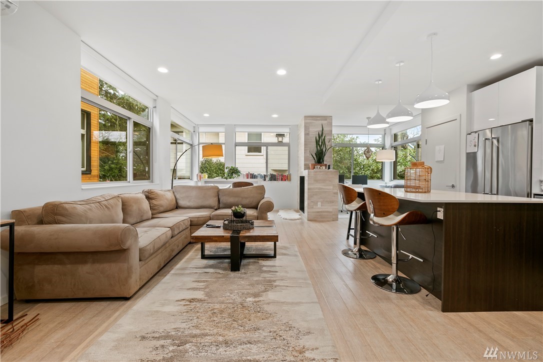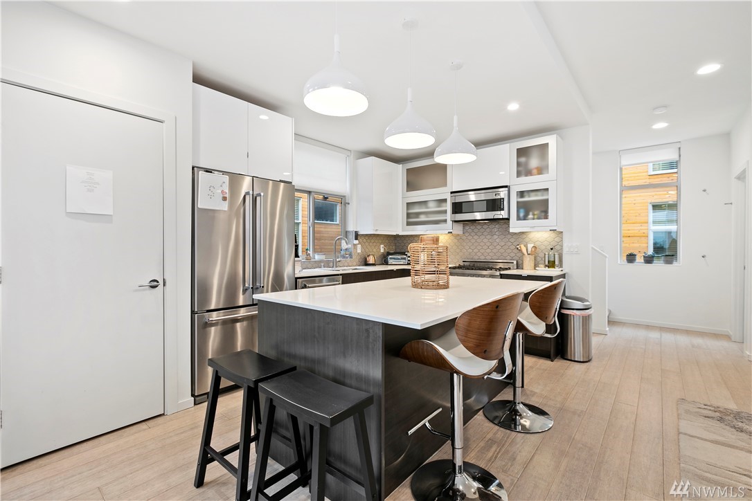 Ultra rare, fully detached modern home w/ roof top deck. Open living space w/ high ceilings, walls of windows - abundance natural light. Cozy dual sided gas fireplace. Chefs dream kitchen featuring party island, designer cabinets, high-end appliances, quartz counters. Luxurious finishes w/ penny tiles. Grand master suite w/ walk-in closet, spa-like master bath. Roof top deck w/ territorial views. 'Covered' off street parking. AC! Stone throw to the heart of Ballard. Airbnb income of $5k monthly!